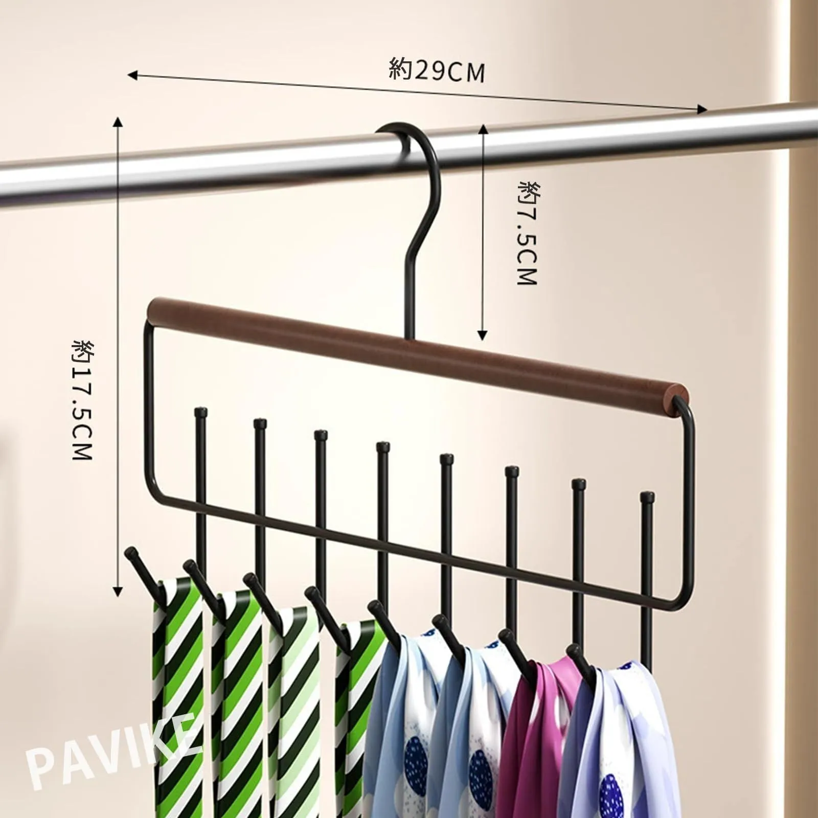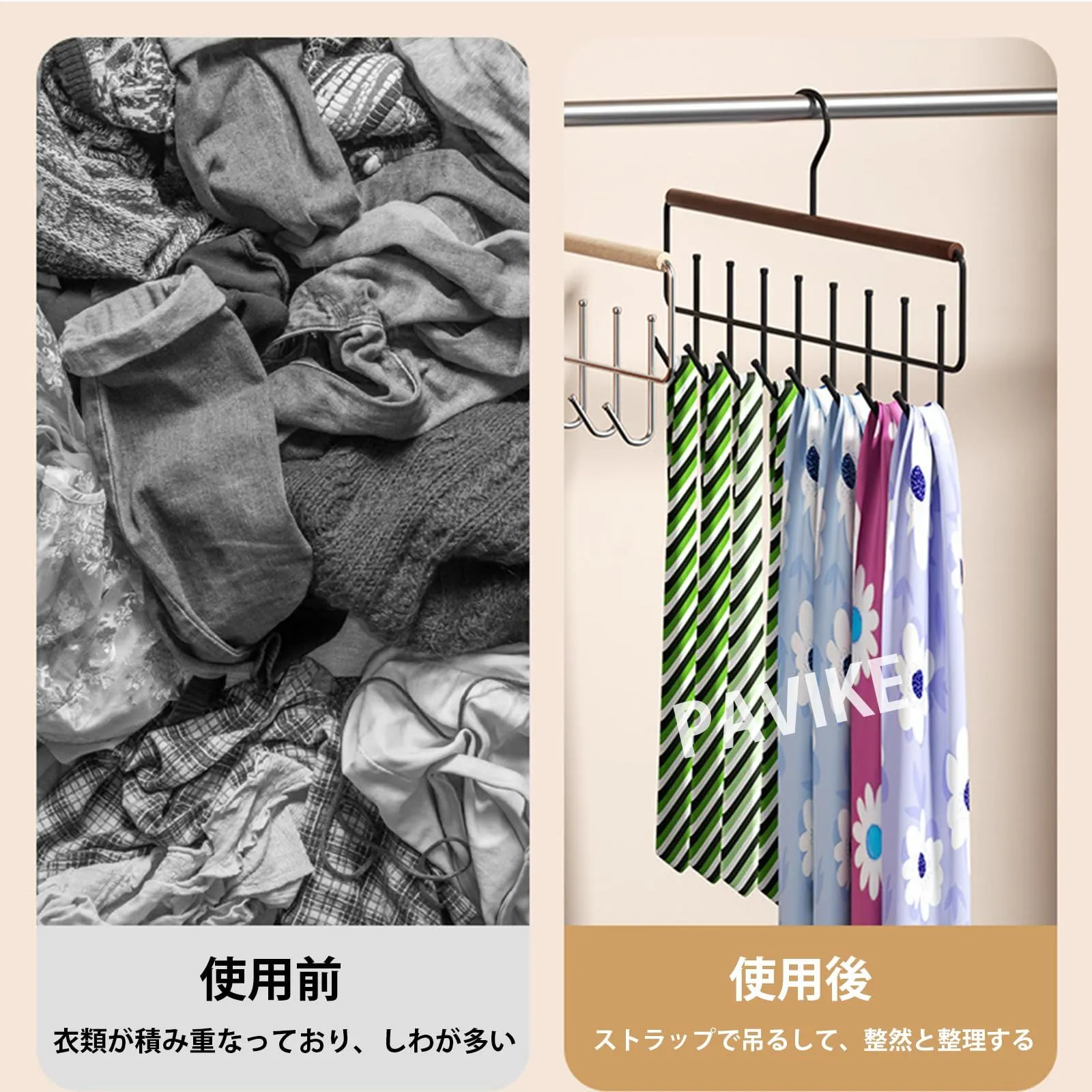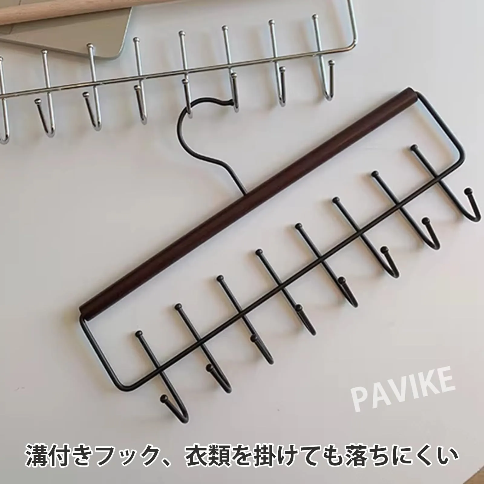 【製品特徴】溝付きフック設計により、衣類の脱落を防ぎ、わずかな振動や衝撃でも滑りにくく、長期安定性を確保します。360度回転する設計により、縦方向ではなく横方向に空間を活用し、ワードローブや収納棚のデッドスペース(奥行き)を有効活用し、従来のハンガーでは実現できなかった大幅な省スペース化を実現しました。このハンガーラックは帽子をすっきりと収納し、必要なものが一目でわかるため、毎日の買い物がより簡単で便利になります。
