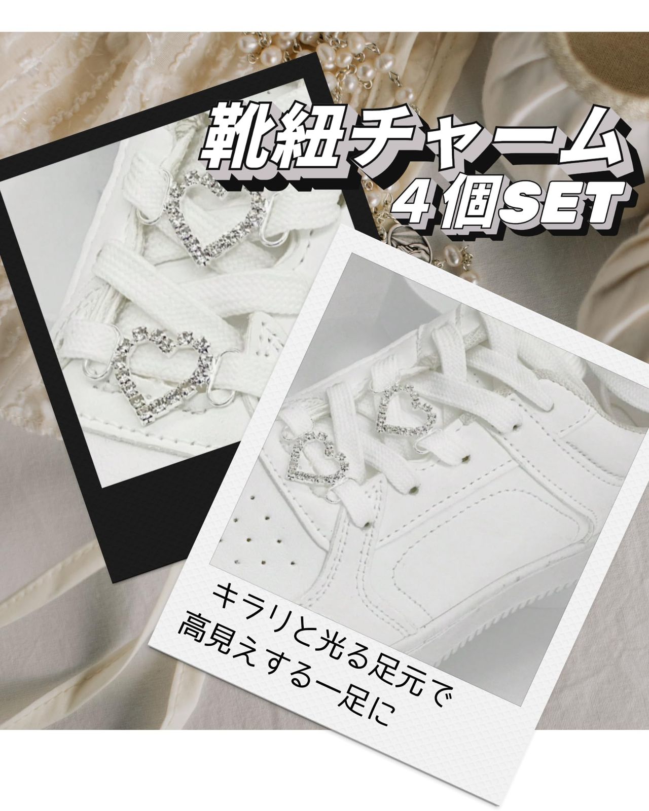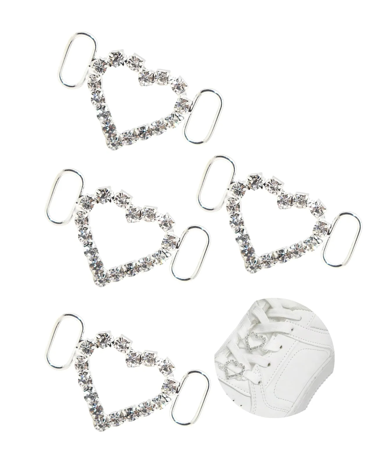 足元をもっと可愛く!ハート型のスニーカーアクセサリー4個セット。きらめくラインストーンをあしらった、ガーリーなデザインのスニーカーチャームです。シューレスに簡単に取り付けられ、普段のスニーカーやブーツが一気に特別仕様に。