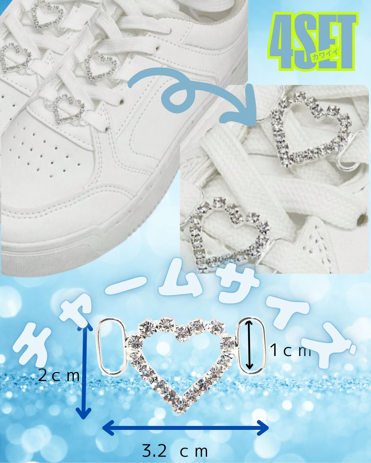 4個セットで左右の靴にバランスよく装飾可能。リボンや他のチャームと合わせても可愛い ハート型&キラキラデザインで小さいながらも写真映え抜群 シューレスに差し込むだけの簡単装着、工具不要 軽量合金製で歩きやすく長時間着用も快適