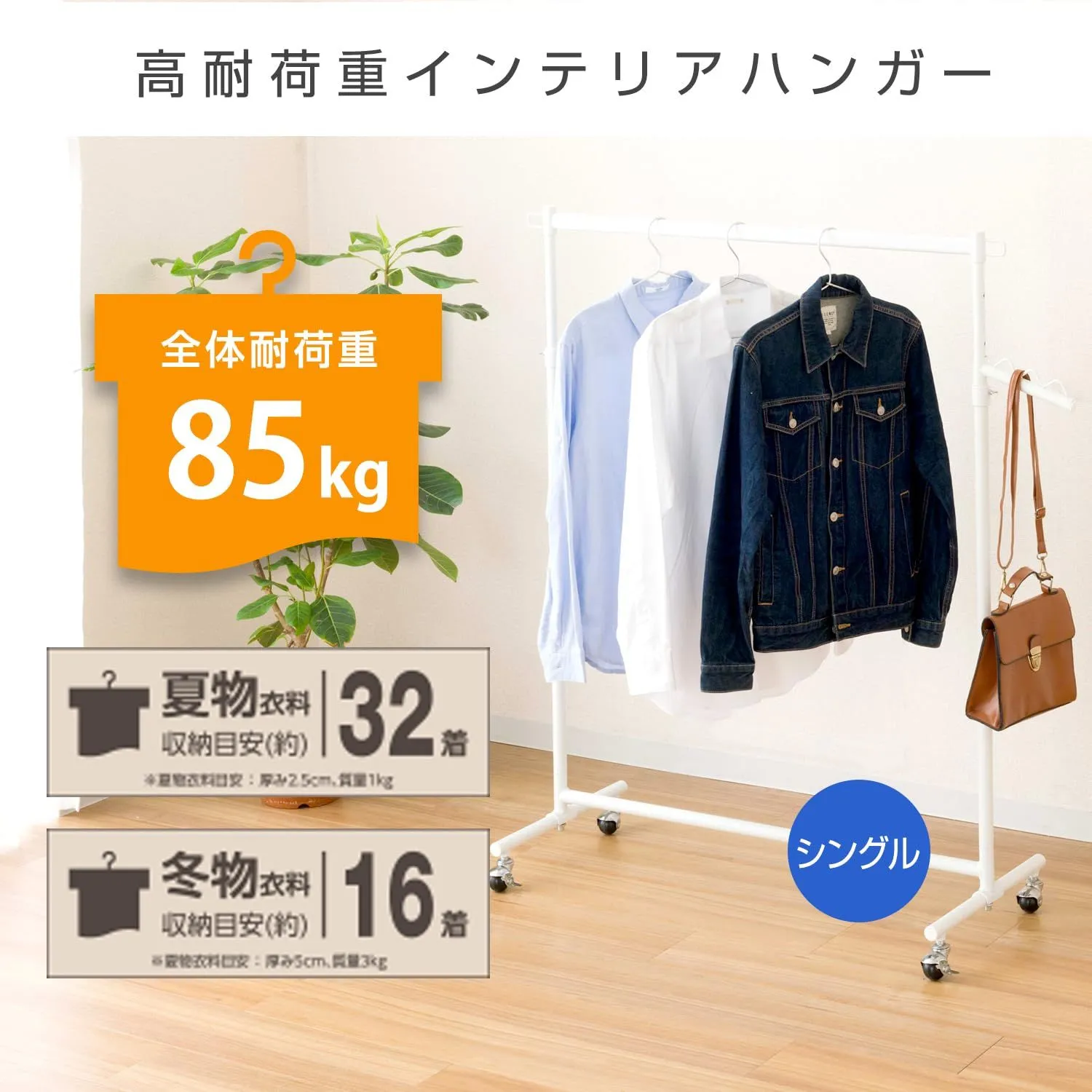 耐荷重85kg 夏物衣料収納目安 (約)32着(厚み2.5cm/質量1kg) 冬物衣料収納目安(約)16着(厚み5cm/質量3kg)