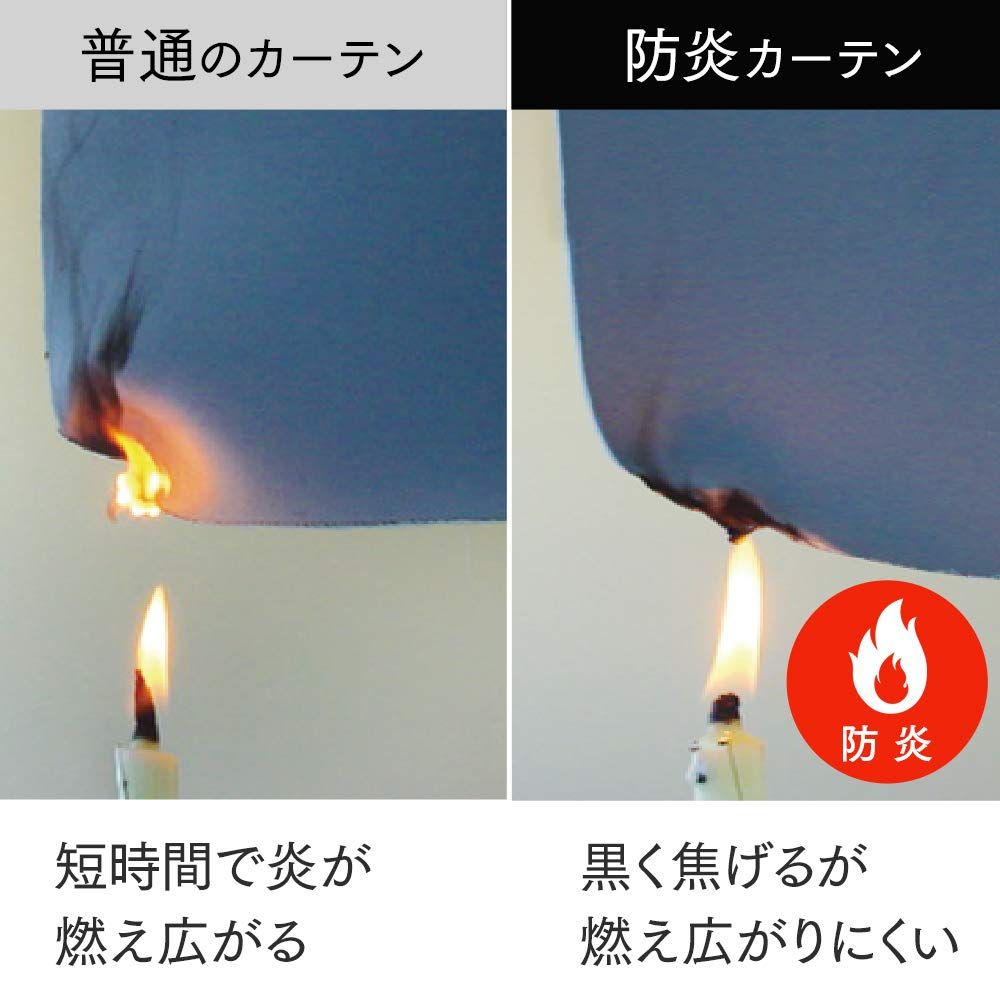 【防炎加工】普通のカーテン:短時間で炎が燃え広がる。防炎カーテン:黒く焦げるが、炎は燃え広がりにくい。