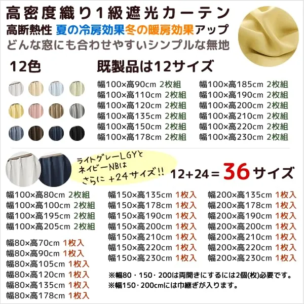 ◆1級遮光(遮光率99.99%)の生地でも色によって遮光率に若干の差が出ます。薄めの色は2級遮光に近くなります。実感値としては光の遮り具合にけっこう差を感じる場合もございます。遮光率はカーテン生地に対する試験ですので、実際にカーテンとして使う場合、お部屋をかなり暗くするためには両サイドや上下部分も十分に覆うなどの工夫が必要です。「フルダル」というタイプの、織りの目が詰まった触り心地が滑らかな生地の遮光カーテンです。細い糸を大量に使って織り込んだ高密度生地なので、断熱性もかなり期待できます。商品画像は高さ178cmの写真です。カーテンレールは付属しません。