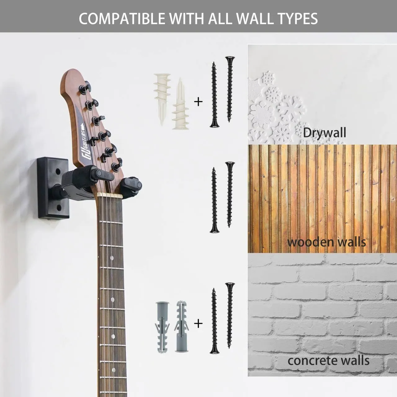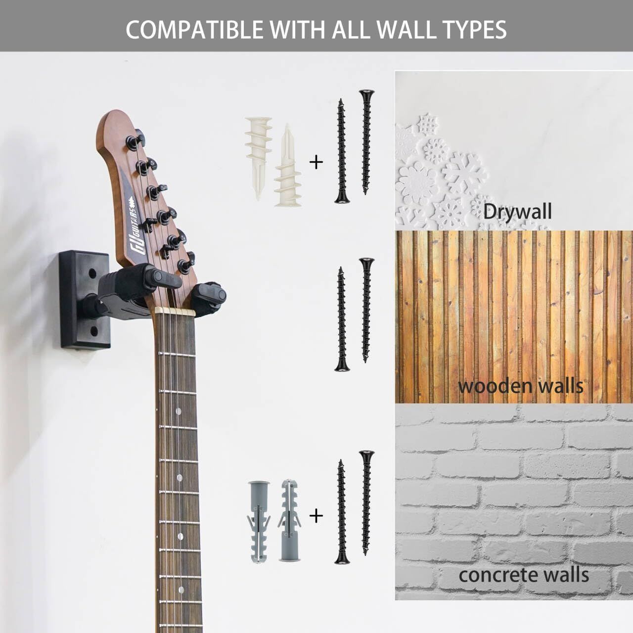 ギターのウォールマウントは、あらゆるタイプのヘッドストック用に設計されています。 アコースティックギター、クラシックギター、エレキギター、ベース、ウクレレ、マンドリンなど、さまざまな弦楽器に適しています。