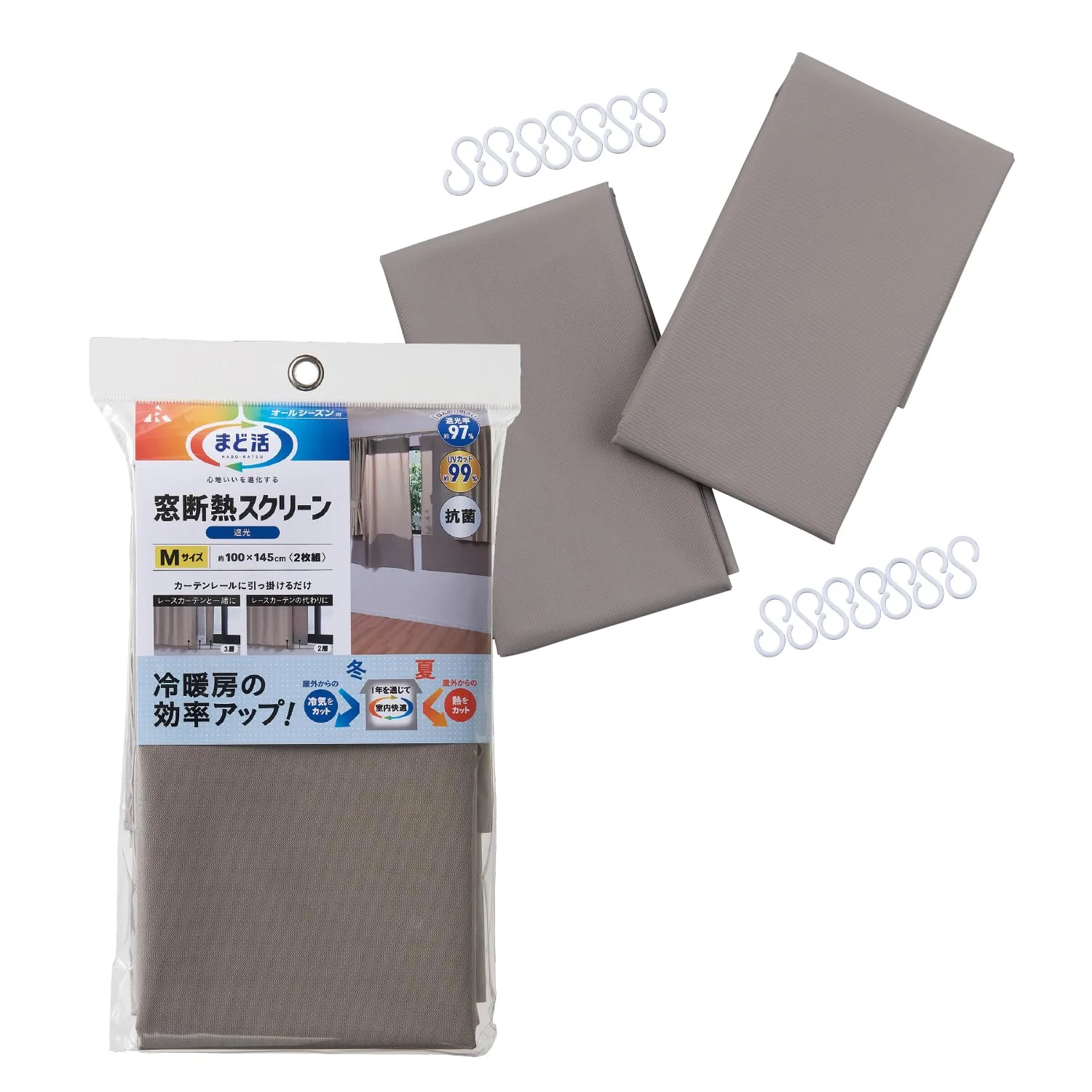 アール(R) 窓断熱スクリーン遮光145cm まど活 グレーベージュ 100×145(cm) 抗菌UVカット フック取付遮光 2枚 HN-531