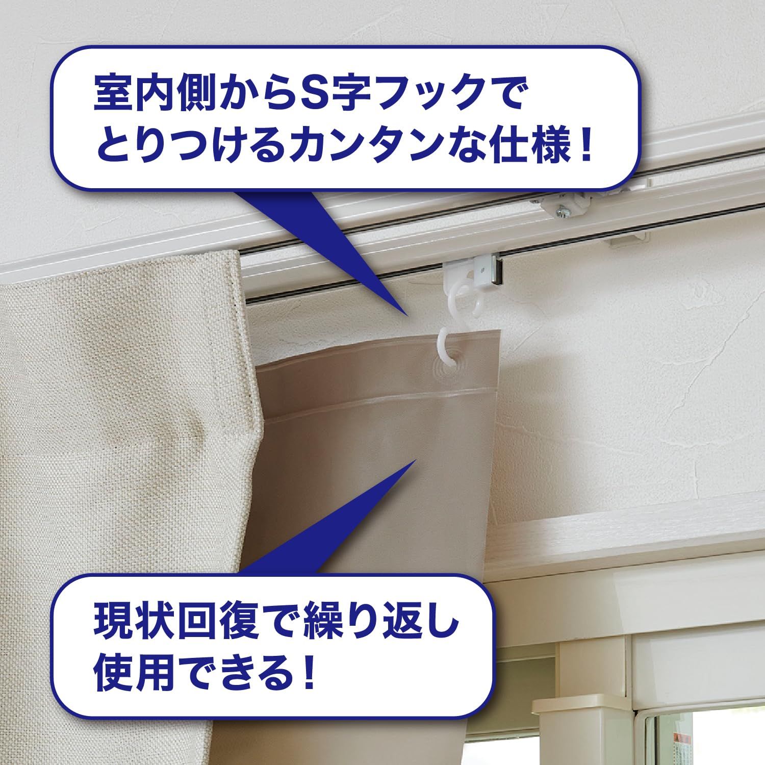 ・室内側からS字フックでとりつけるカンタンな仕様、現状回復で繰り返しご使用できます。