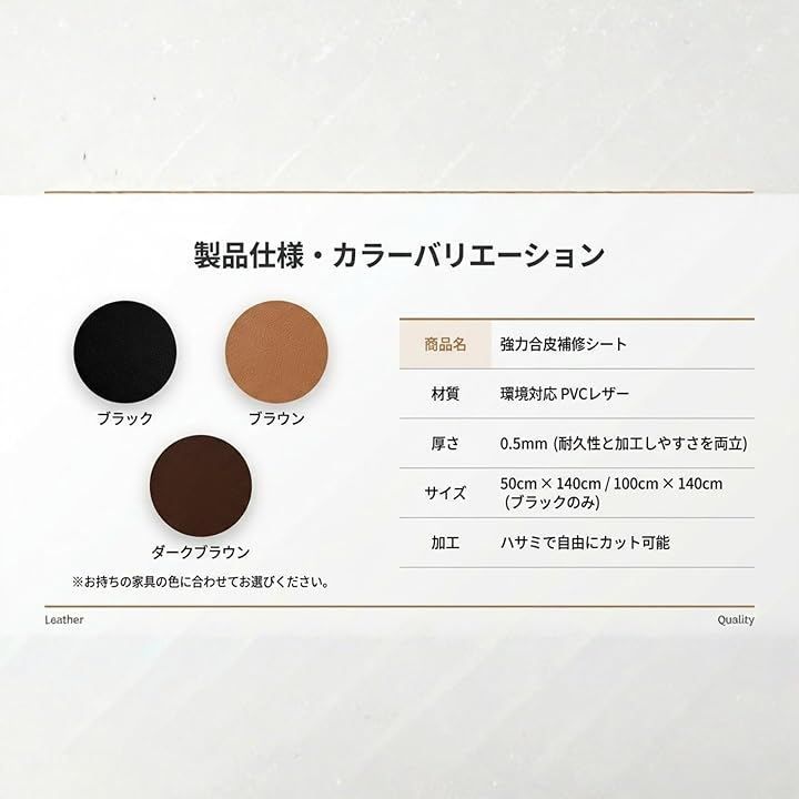 柔らかい素材なので、ハサミで自由にカットでき、ソファーや車の座席、椅子、カバン、靴など、さまざまな皮革製品の補修に最適です。