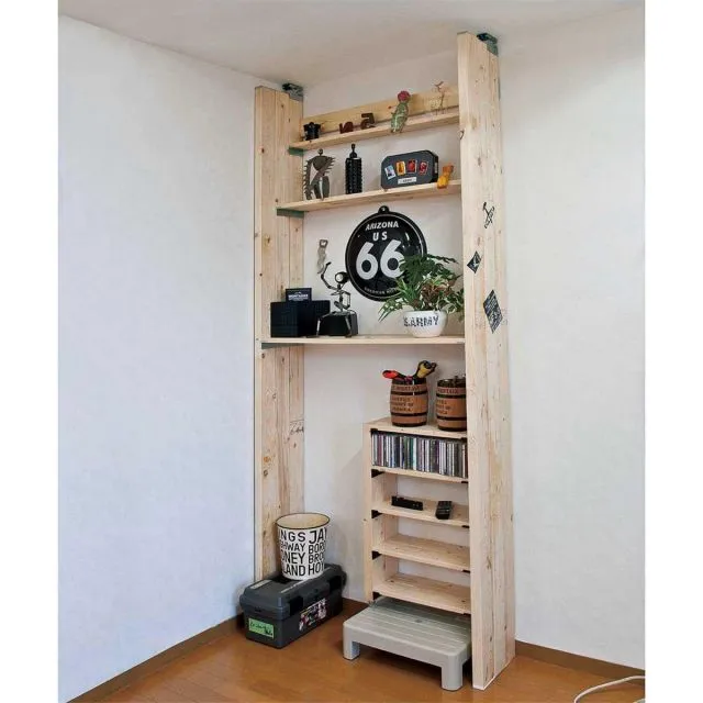 1X4材または2X4材を4枚使用する棚受ですWalist突っぱりジャッキで突っ張った支柱に使用する金具です1X4材または2X4材を使って、簡単な棚から壁面ユニット収納までお部屋に合わせたコーディネートができます金具が目立ちにくいデザインタッピングビスは別売りです