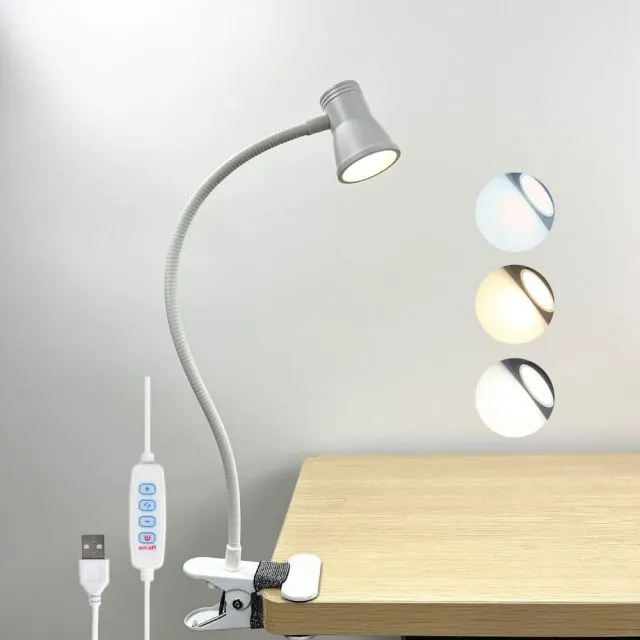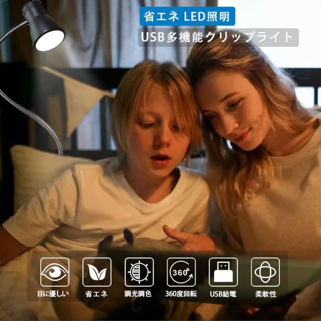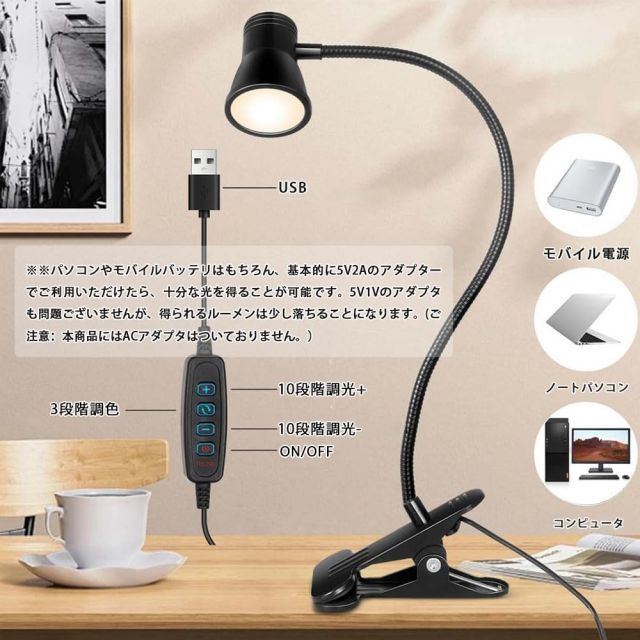 【USB給電】クリップ式電気スタンドはUSBポートに電源アダプタを接続するだけですぐに点灯します。高輝度LEDチップを採用しており、消費電力は僅か5Wです。※パソコンやモバイルバッテリはもちろん、基本的に5V2Aのアダプターでご利用いただけたら、十分な光を得ることが可能です。5V1Vのアダプタも問題ございませんが、得られるルーメンは少し落ちることになります。(ご注意:本商品にはACアダプタはついておりません。)