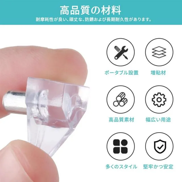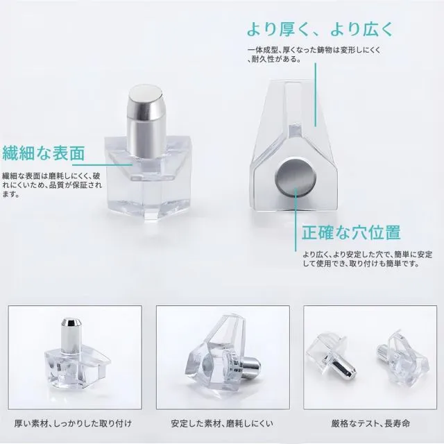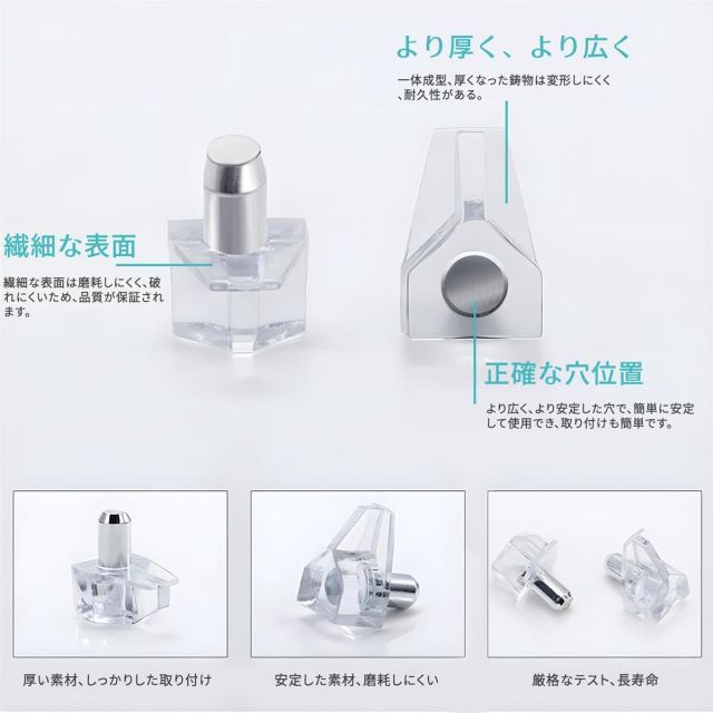 【目立たない高性能サポート】透明なデザインが家具の美観を損ねません。小さなボディに秘めた驚きの支持力で、重い本や食器も安心して収納できます。