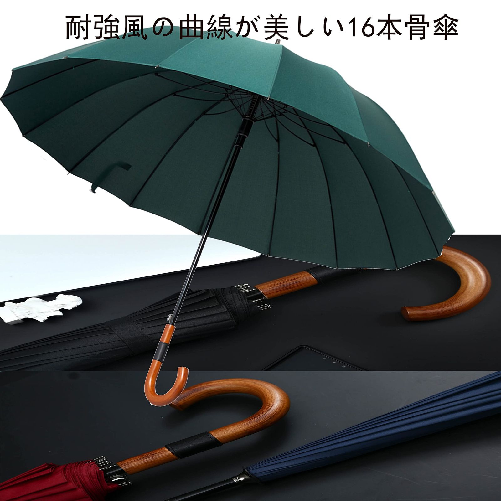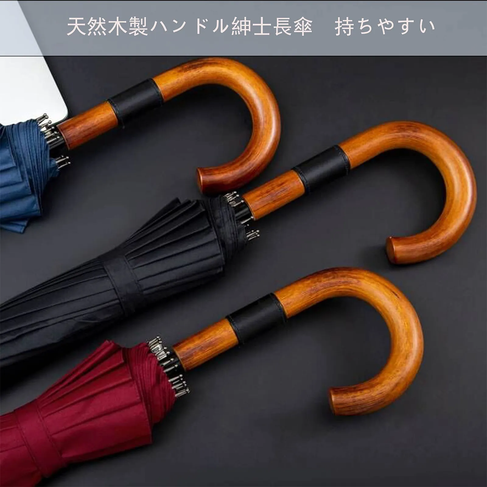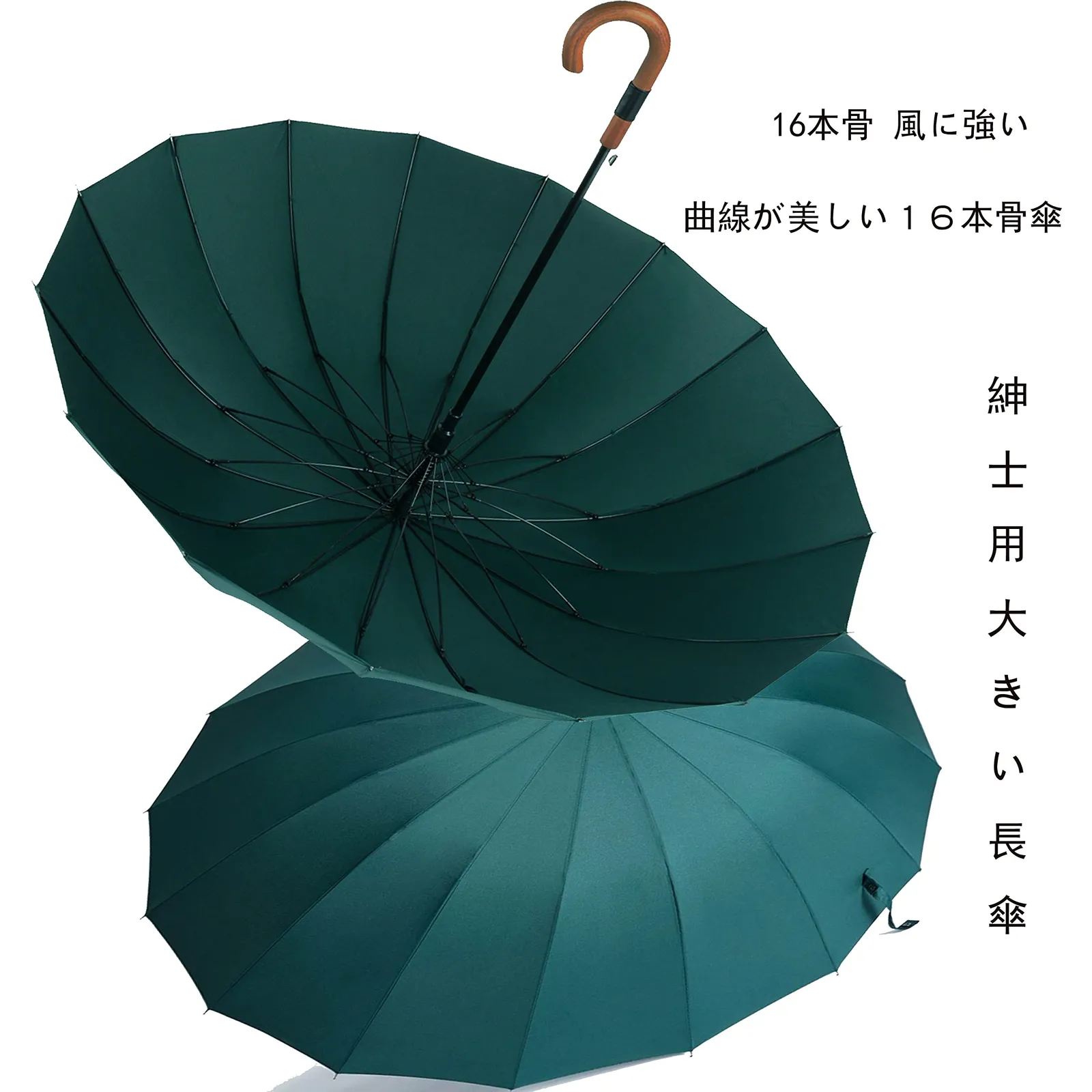 「通勤通学の時、使いたい雨傘はこれ!」16本骨長傘 高強度グラスファイバー仕様紳士長傘全長は100cmと大きめサイズのメンズ 傘。身長が高い方や体格のよい男性でも濡れる心配がありません。たたむと細くなるので、家や職場に置いても主張しすぎないのが嬉しいポイント。スタイリッシュさと大きさを兼ね備えたモデルです。学生さんやビジネスマンにも雨の日のおでかけの時にお使いたい頂きたいこの1本です。豪雨や強風にも負けない強度抜群の16本骨大きい長傘