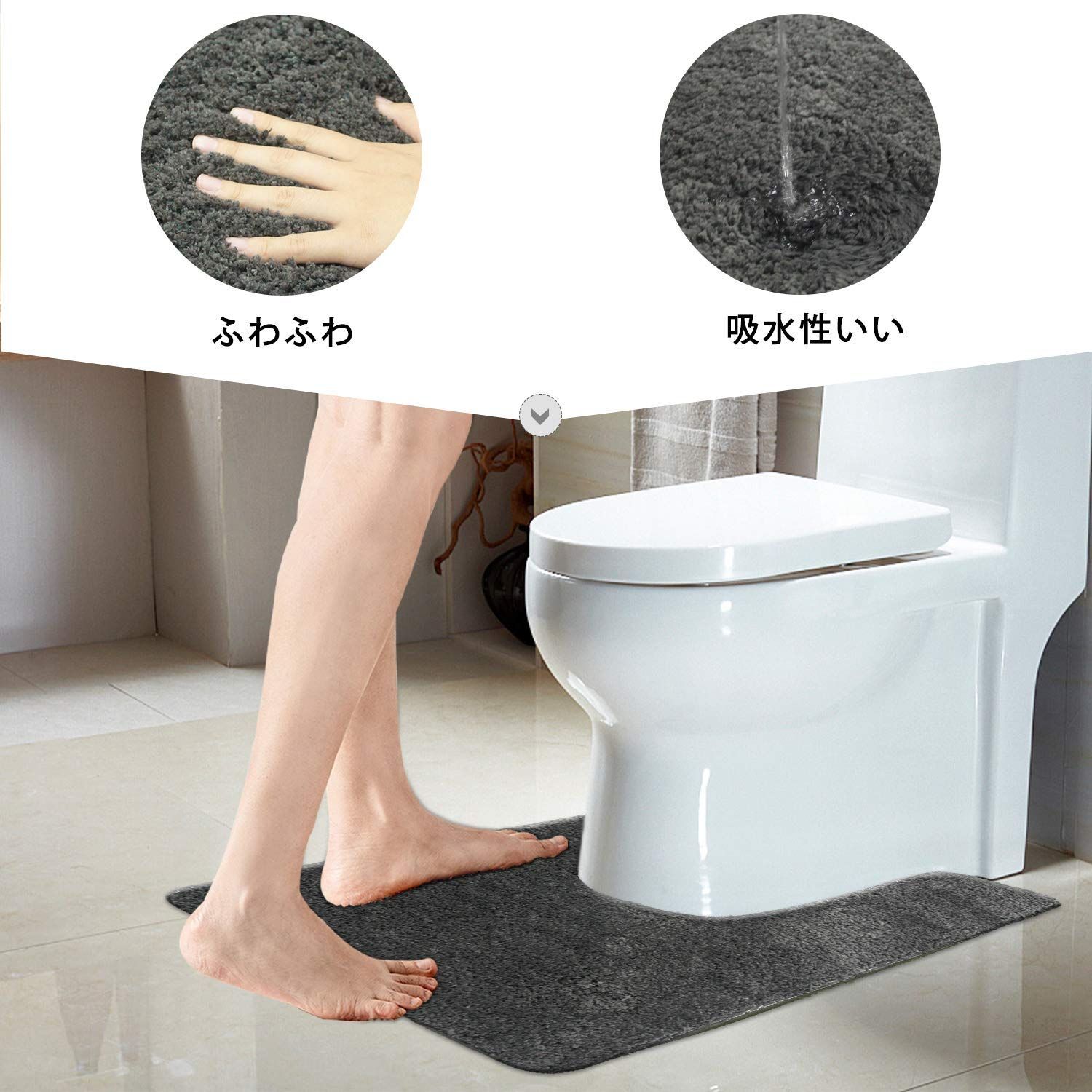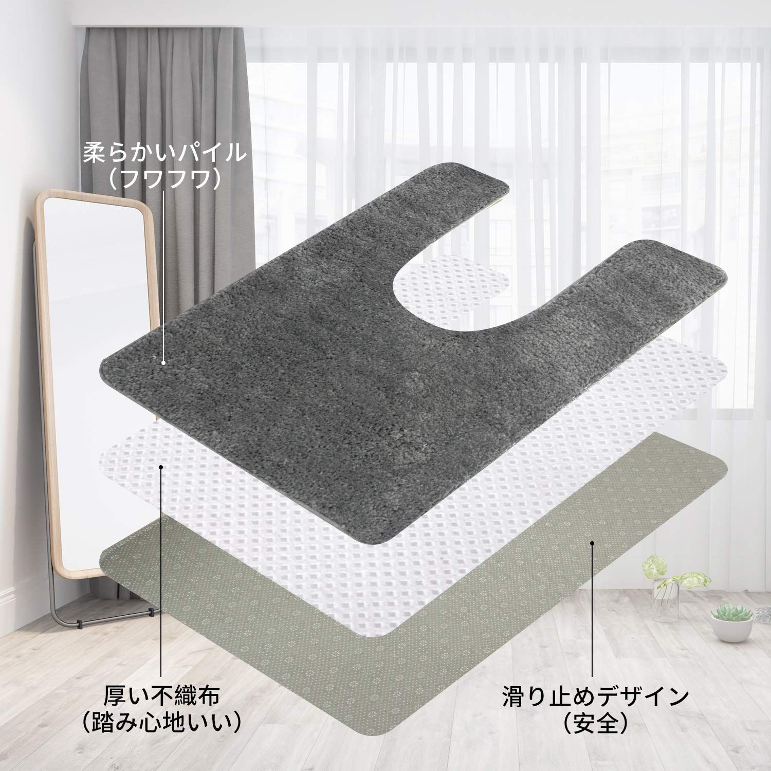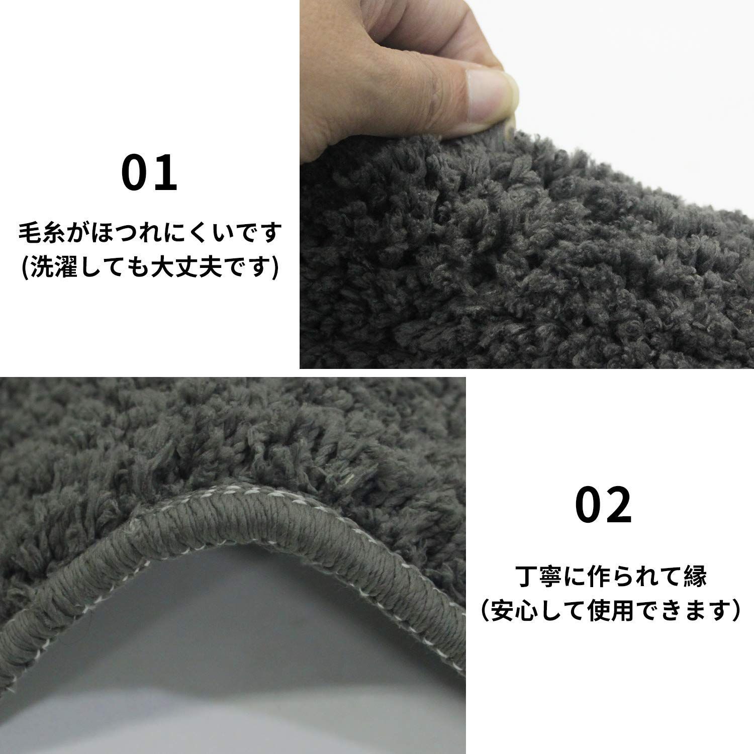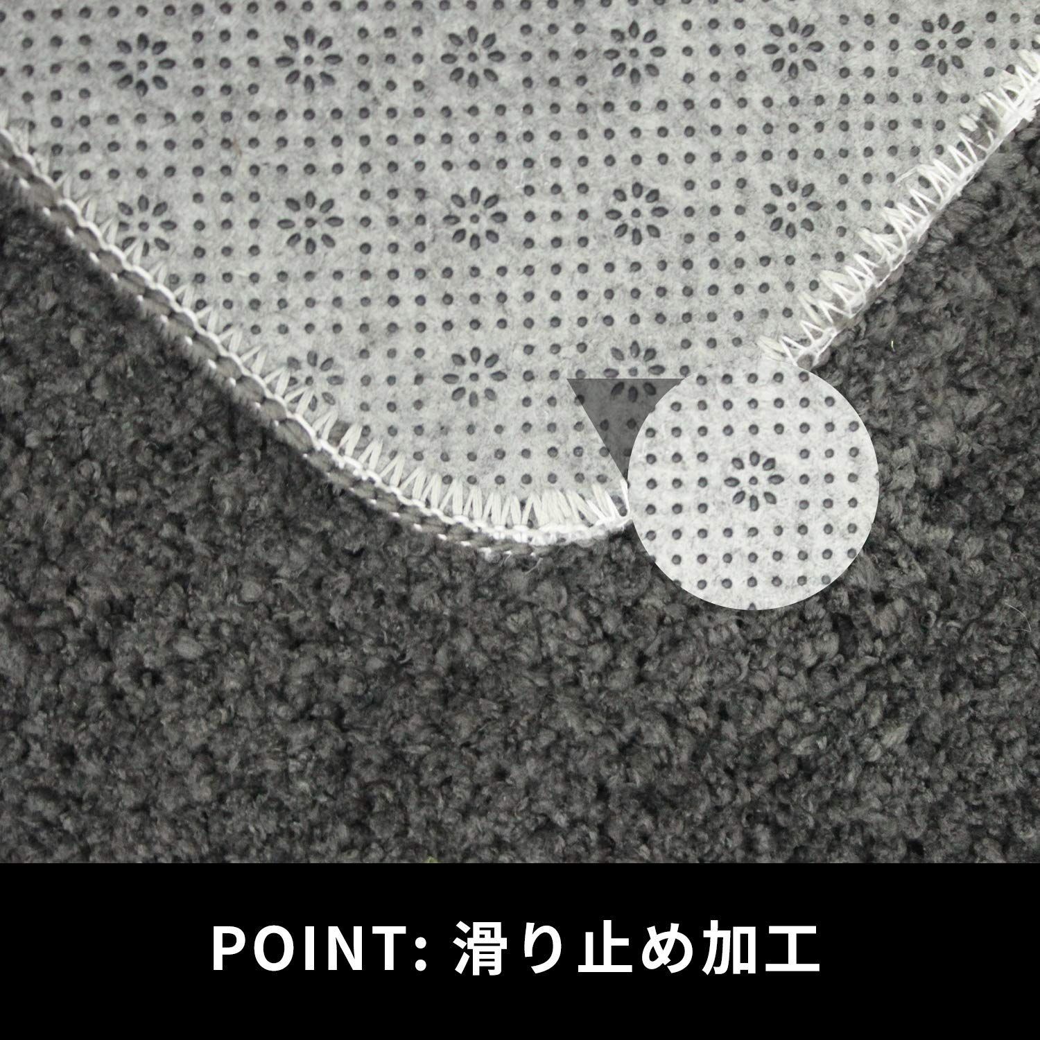 【商品仕様】3層構造:表面/ポリエステル100%、中材/厚い不織布、裏面/PVC滑り止めデザイン;毛足の長さは約15mmです。また、カットが後方に長く伸びているので、トイレの奥の方まで覆うことができます。奥は意外とホコリのたまるところです。ホコリが黒ずみになってしまうのを防ぐ意味でも、好ましいです。
