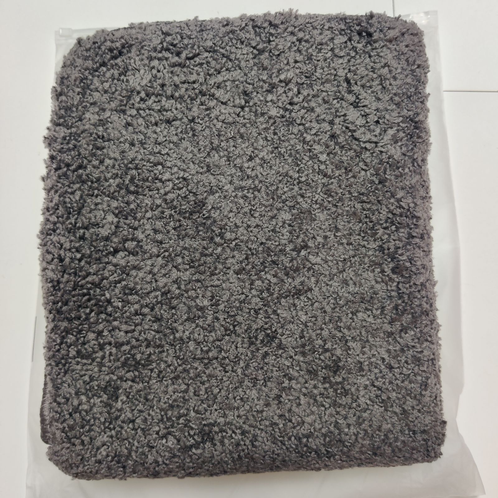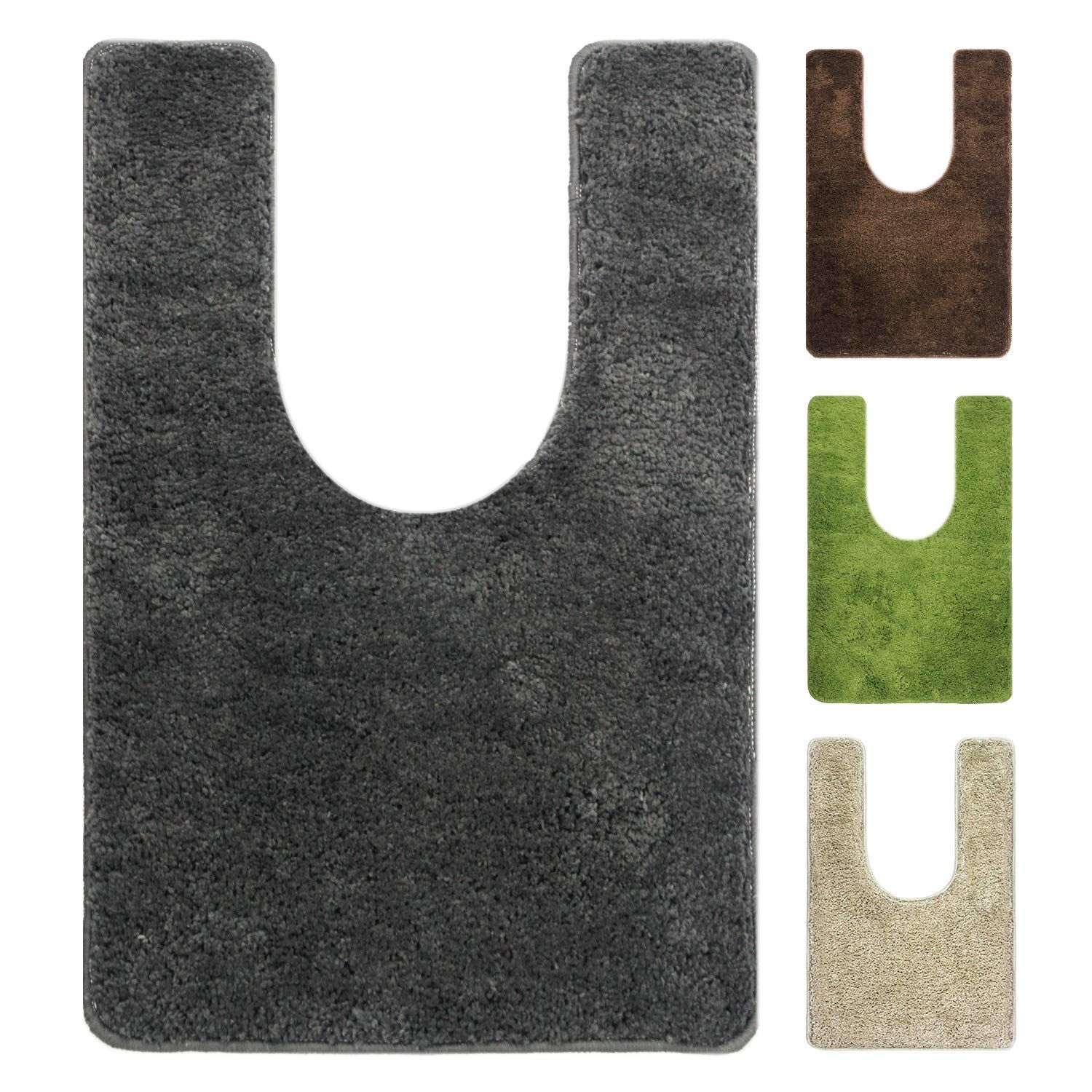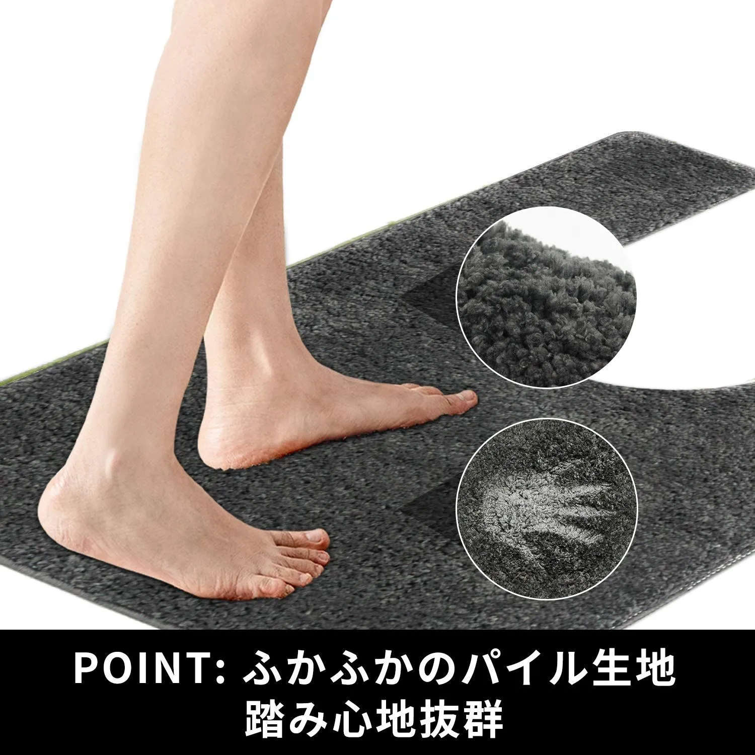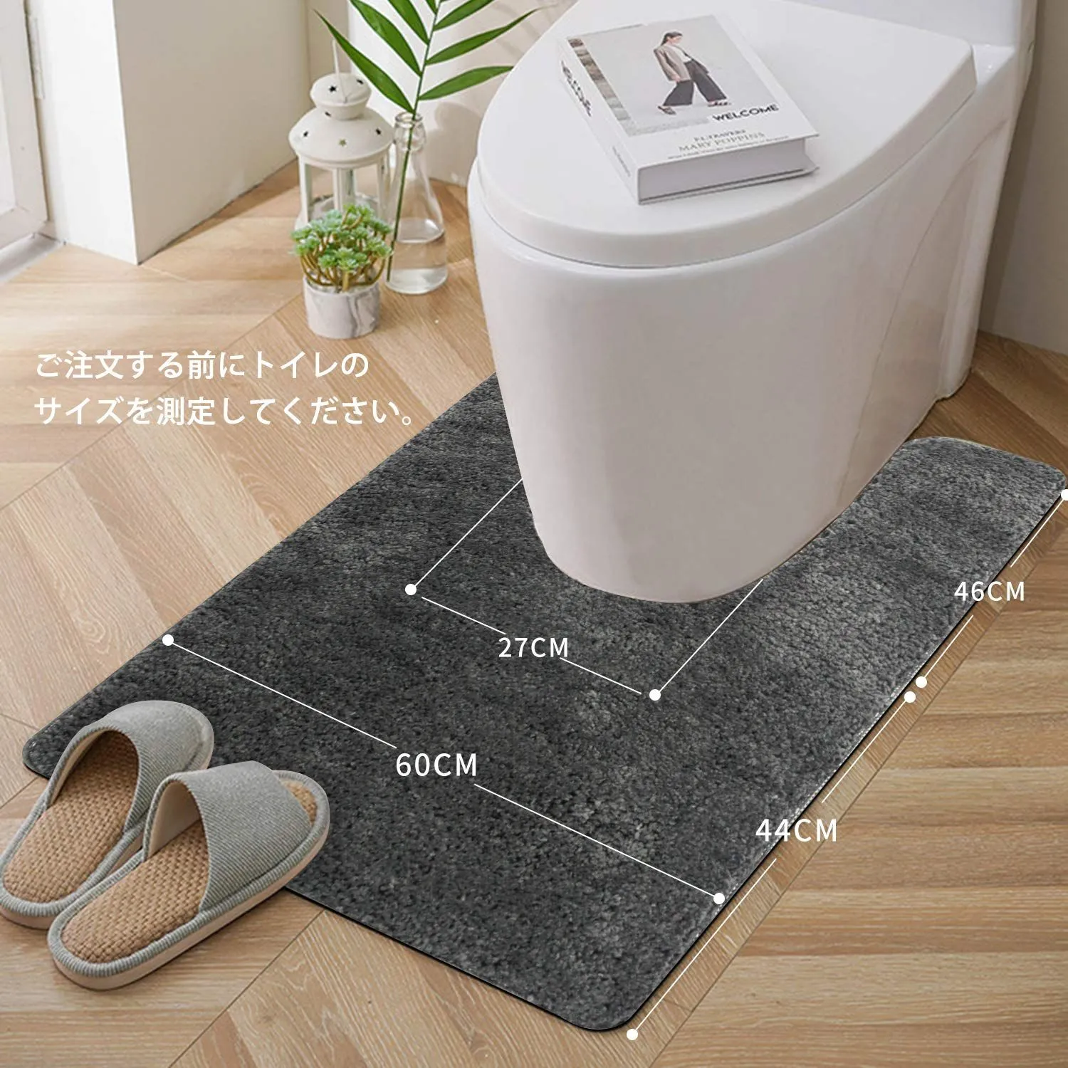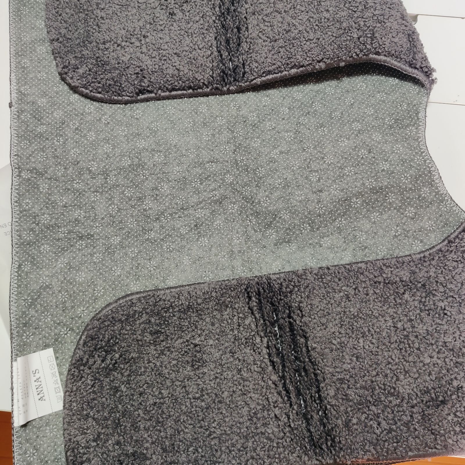 【商品仕様】3層構造:表面/ポリエステル100%、中材/厚い不織布、裏面/PVC滑り止めデザイン;毛足の長さは約15mmです。また、カットが後方に長く伸びているので、トイレの奥の方まで覆うことができます。奥は意外とホコリのたまるところです。ホコリが黒ずみになってしまうのを防ぐ意味でも、好ましいです。