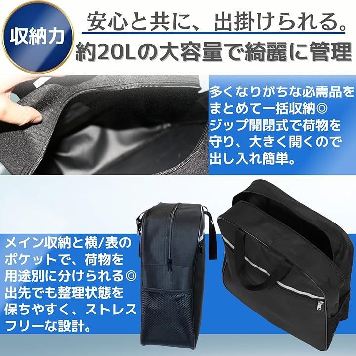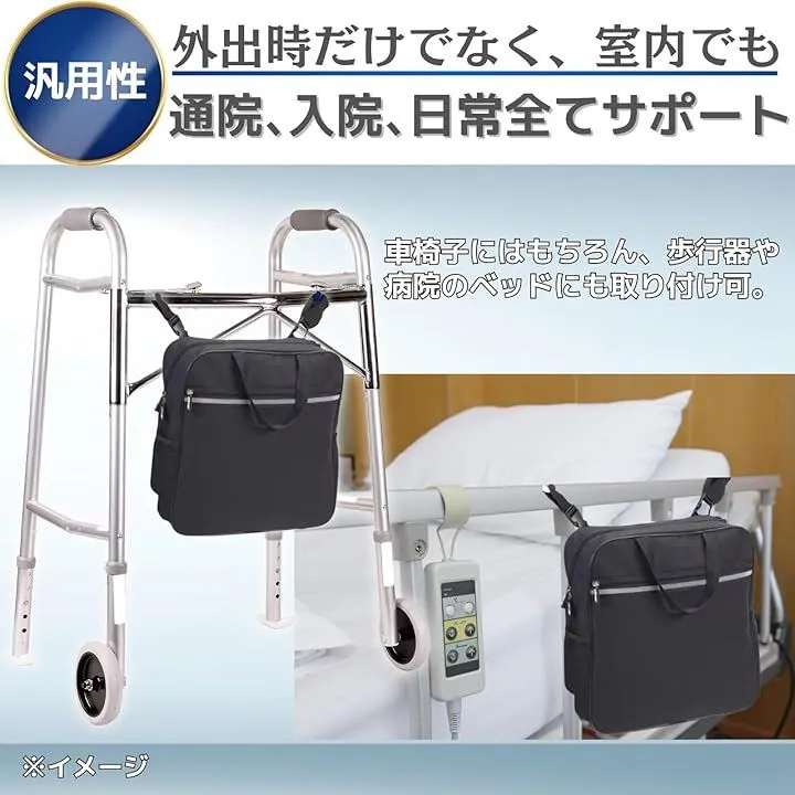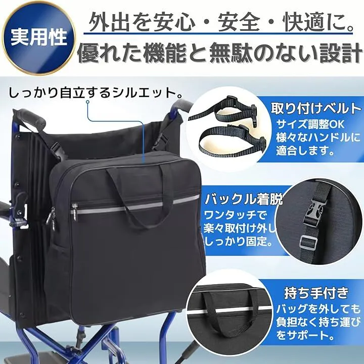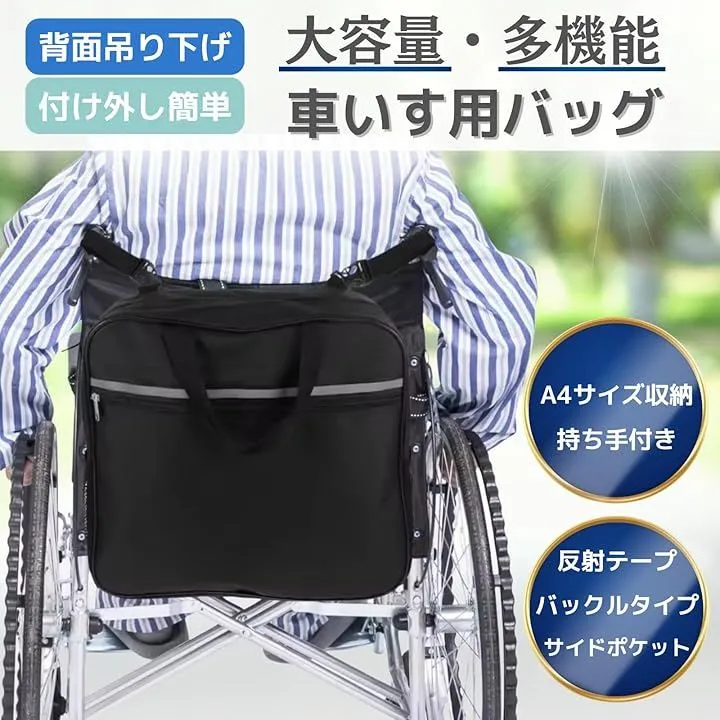 車椅子の背面に取り付けられる大容量バッグで、A4サイズの書類や衣類、小物までしっかり収納できます。