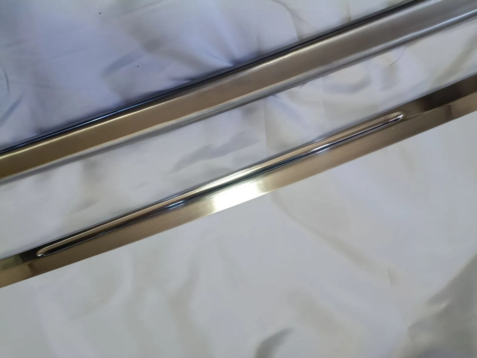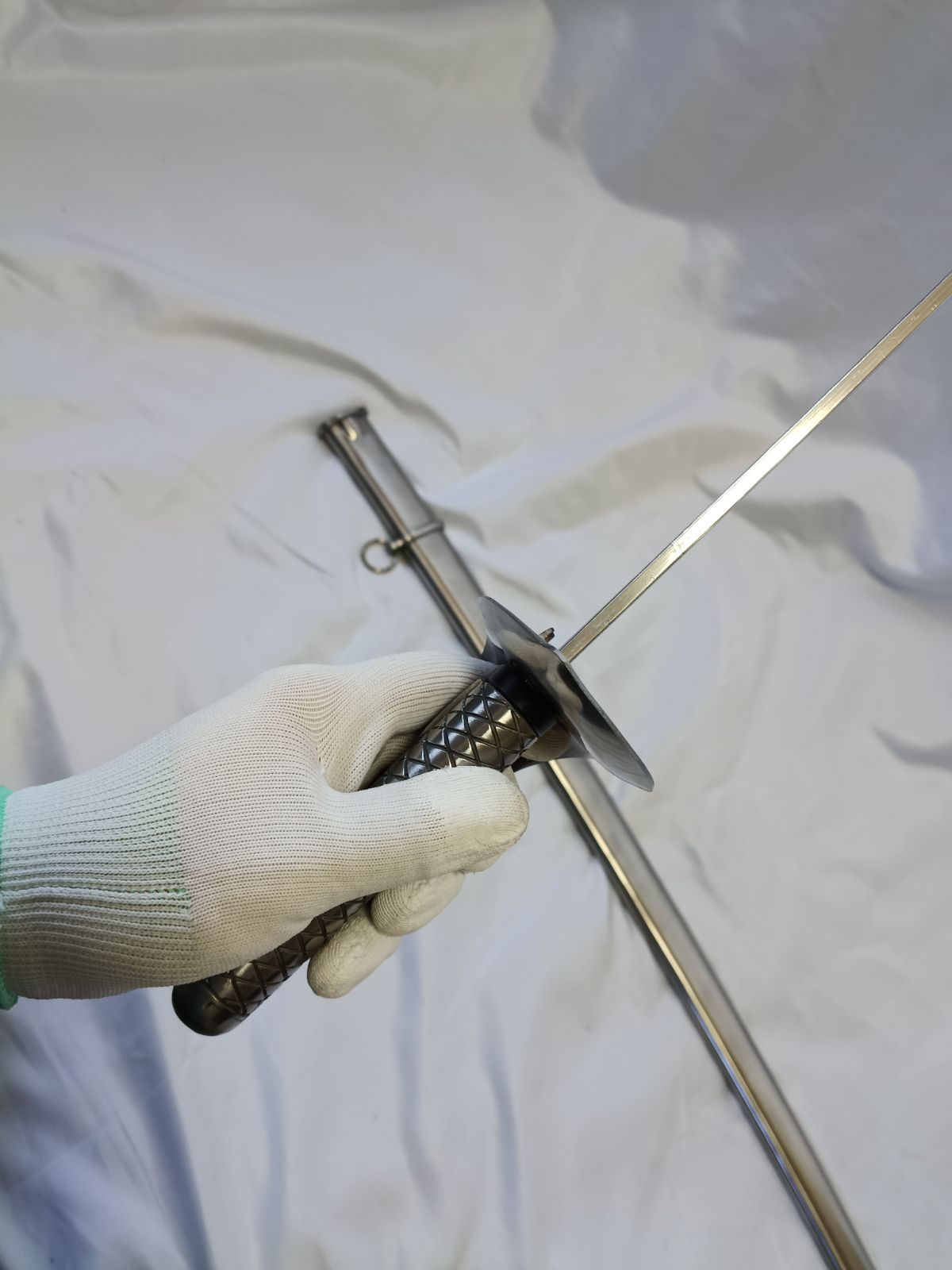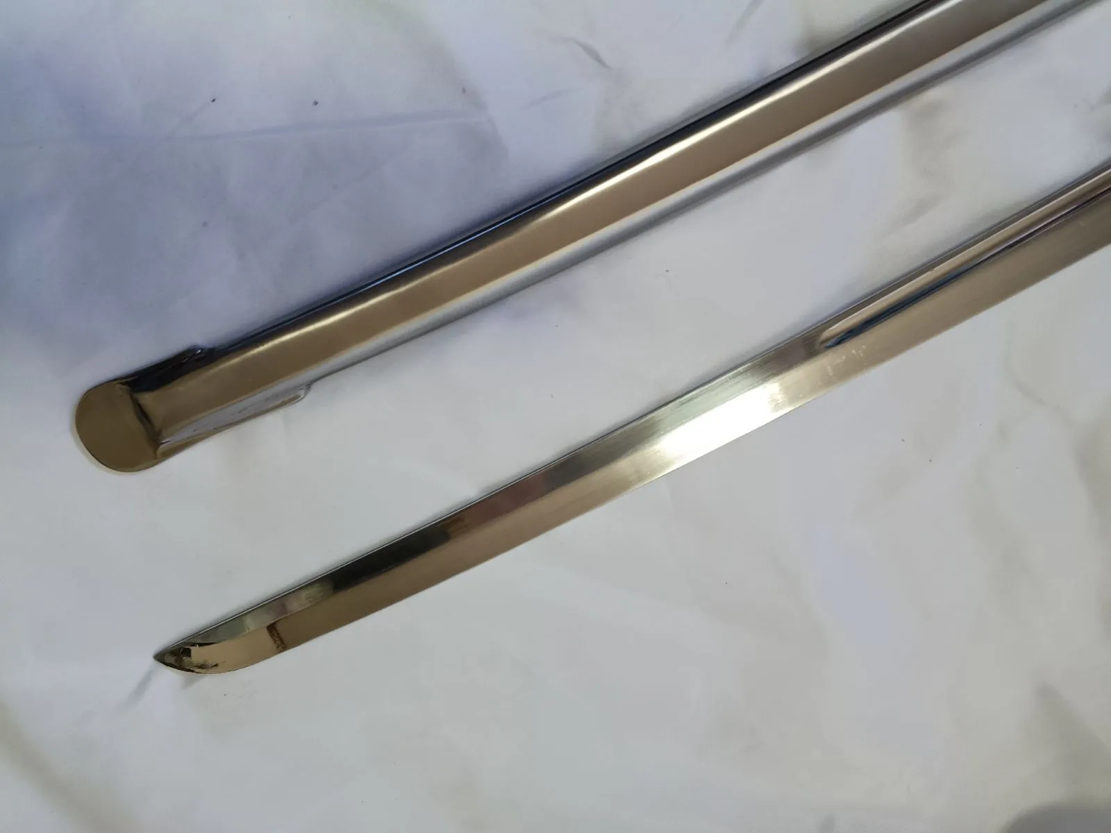 ・刀身がメッキの施されていないアルミ合金製であるのに対し鞘は鉄鋼製であることや、その内部の構造などから、刀身表面へは比較的線傷が生じやすいです。地肌なので研磨剤も使用可能ですが、基本的には納抜刀を丁寧に行うことを推奨いたします。