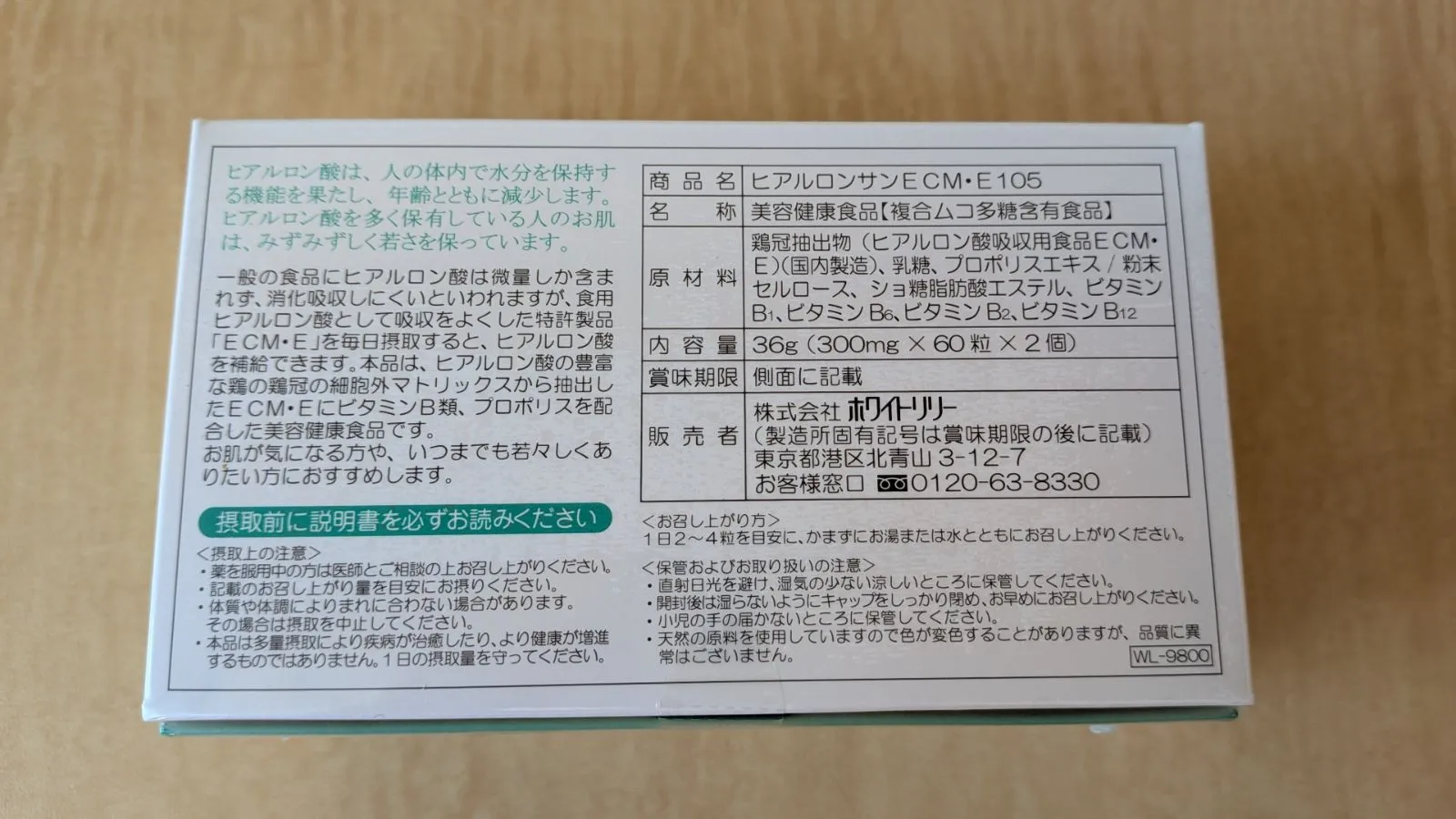 ホワイトリリー化粧品の美容健康食品「ヒアルロンサンECM・E105」です。