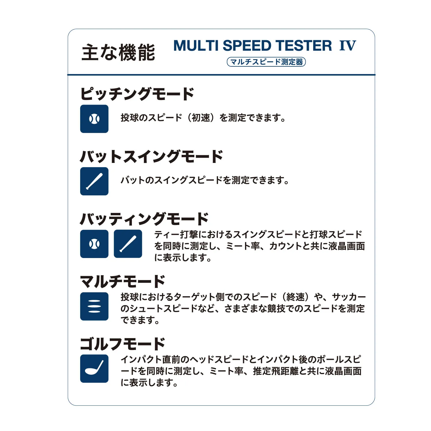 IoTで野球が変わる!マルチスピードテスターⅣ。従来品から35%軽量化、液晶画面は73%大きくなり、センサーの感度もアップしたモデルが登場しました。ピッチングモード・バットスイングモード・バッティングモード・マルチモード・ゴルフモードの5つのモードを搭載。プレーを「数値化」することでトレーニングを向上させます。野球はもちろん、サッカーやゴルフにも活用できるアイテムです。