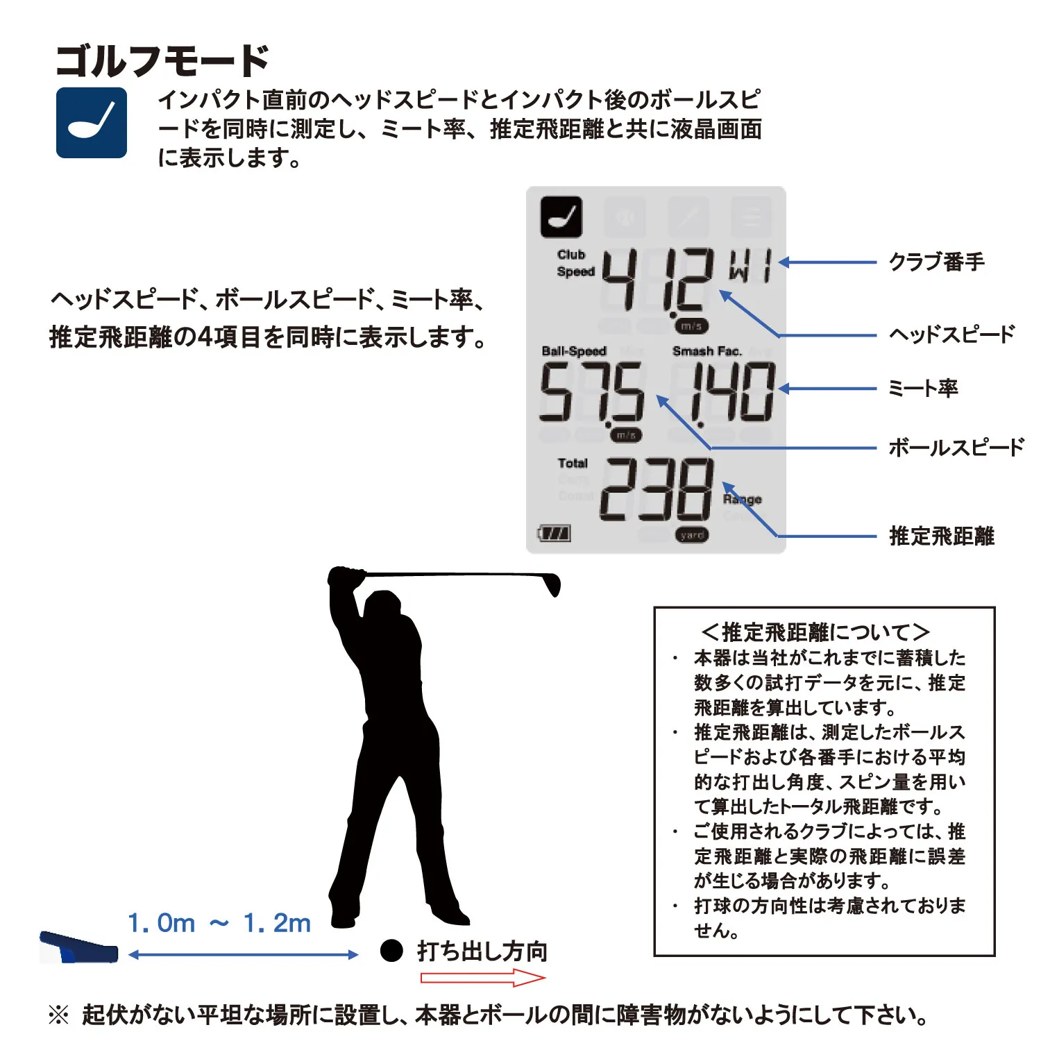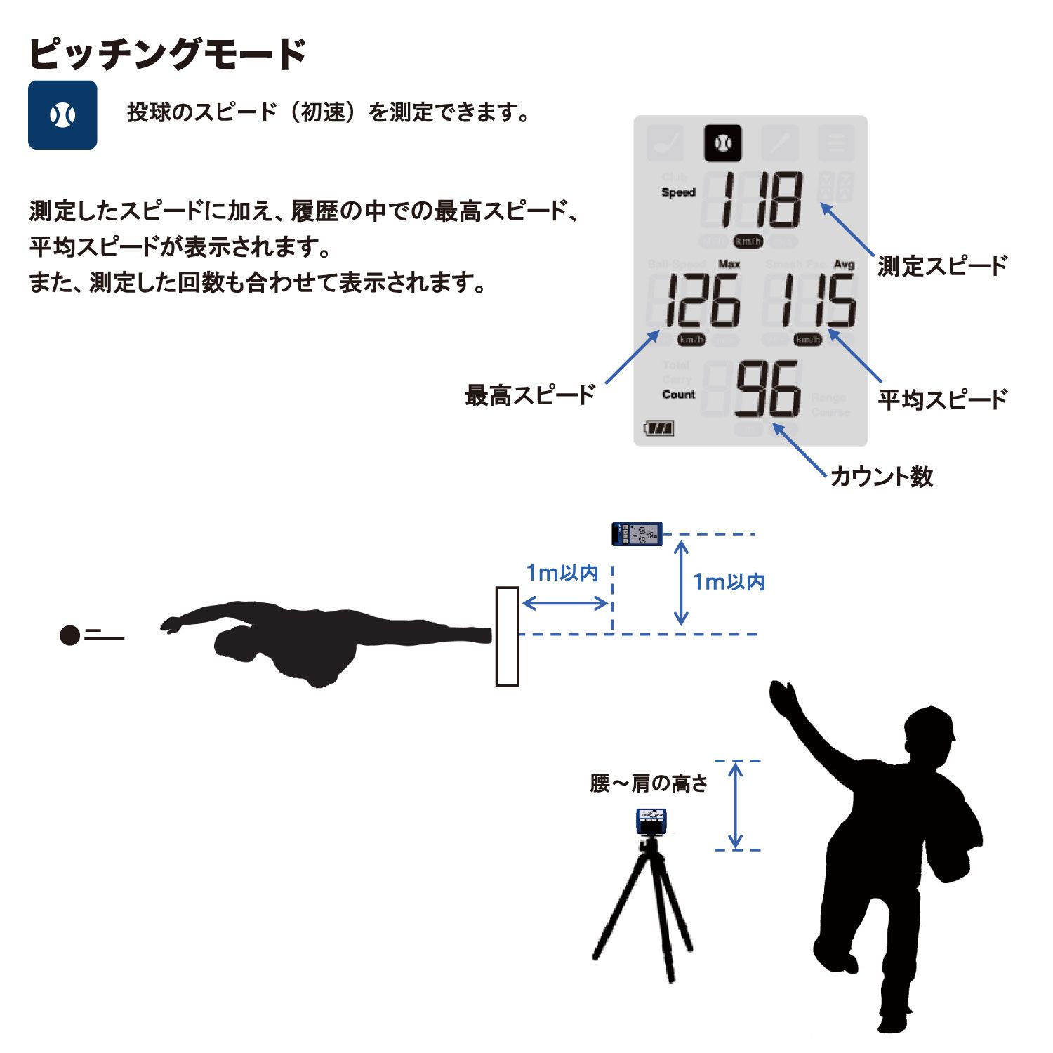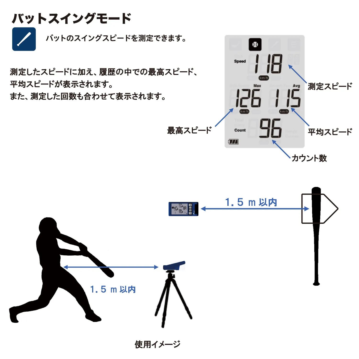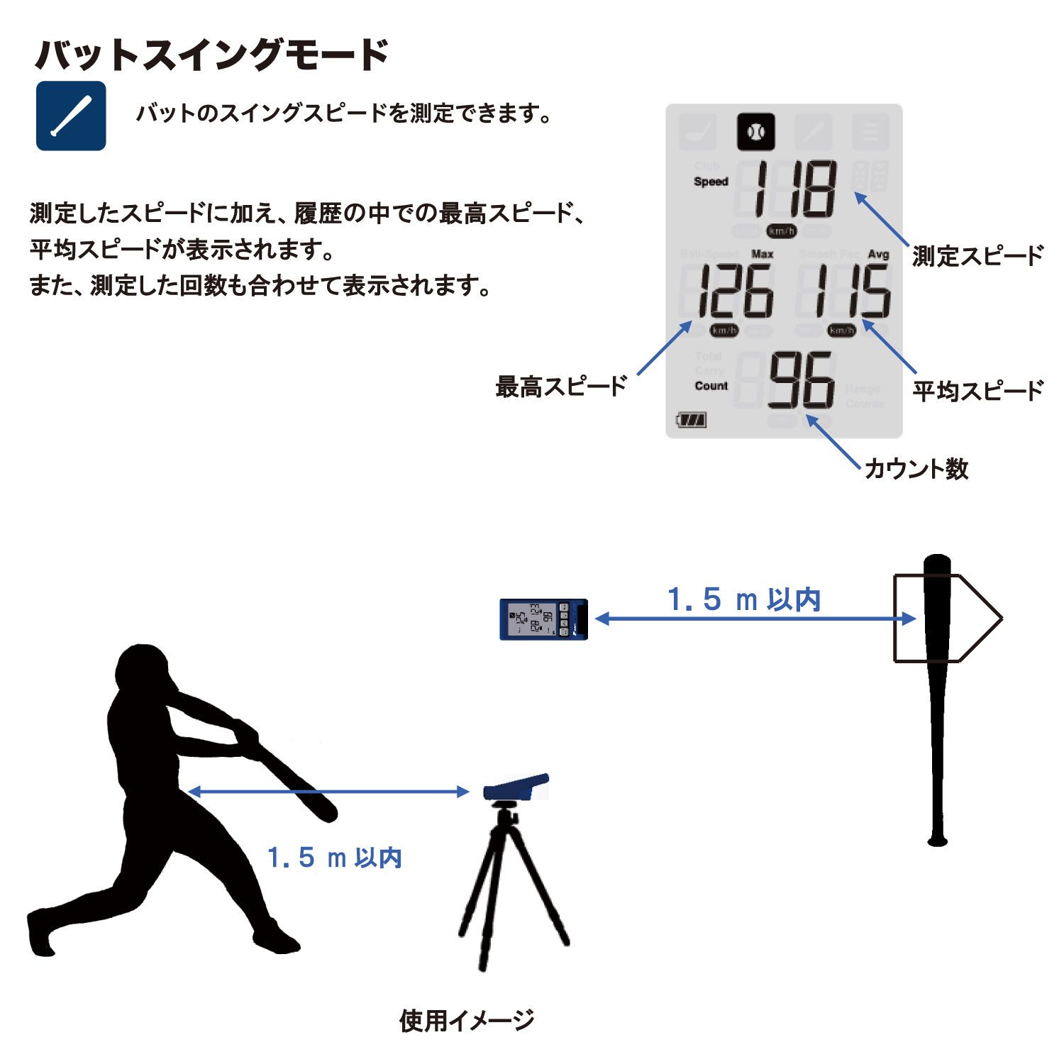 ●測定可能範囲 ・ピッチングモード、バットスイングモード、バッティングモード スイングスピード/ボールスピード:30km/h~180km/h ・マルチモード スピード:30km/h~300km/h ・ゴルフモード ヘッドスピード/ボールスピード 10m/s~90m/s