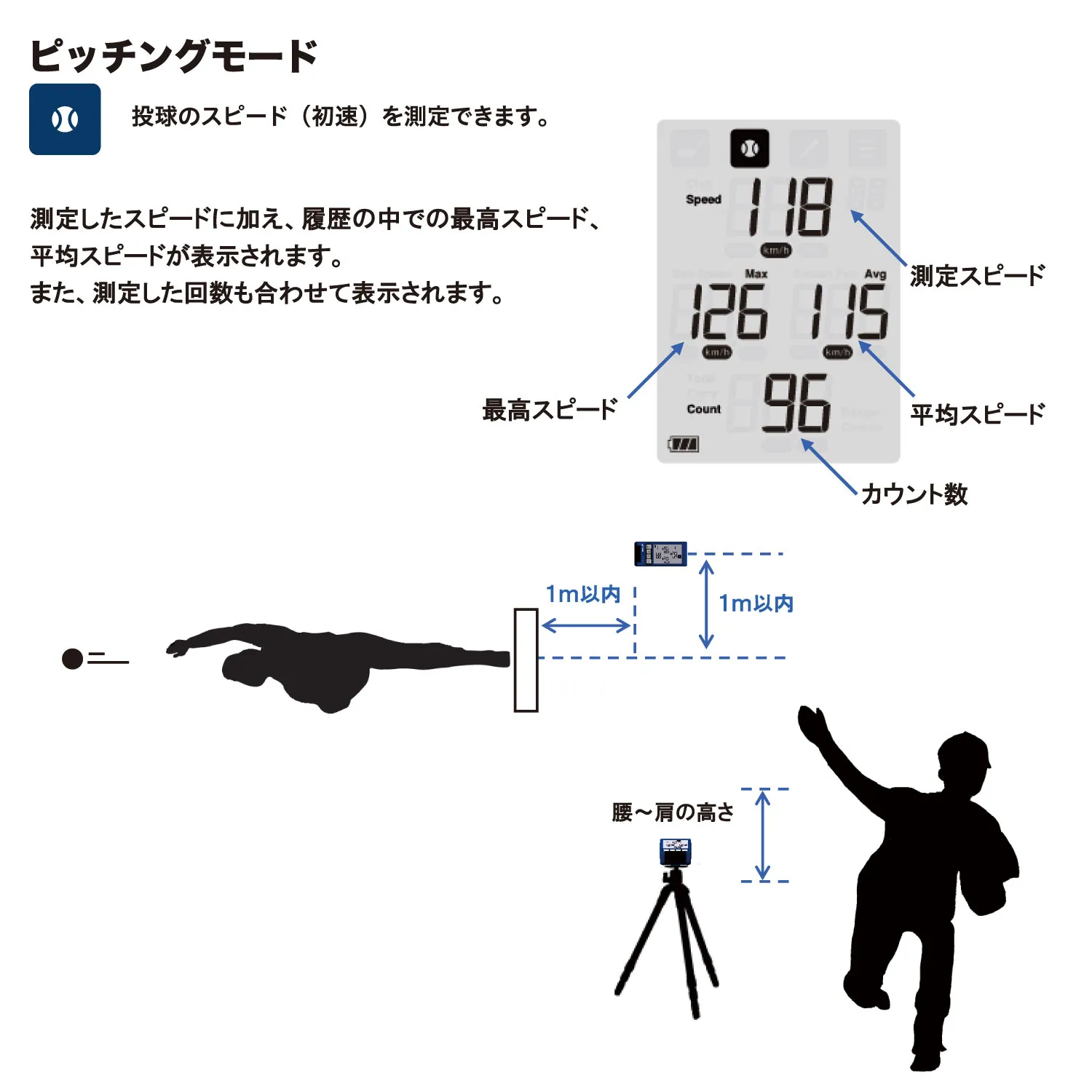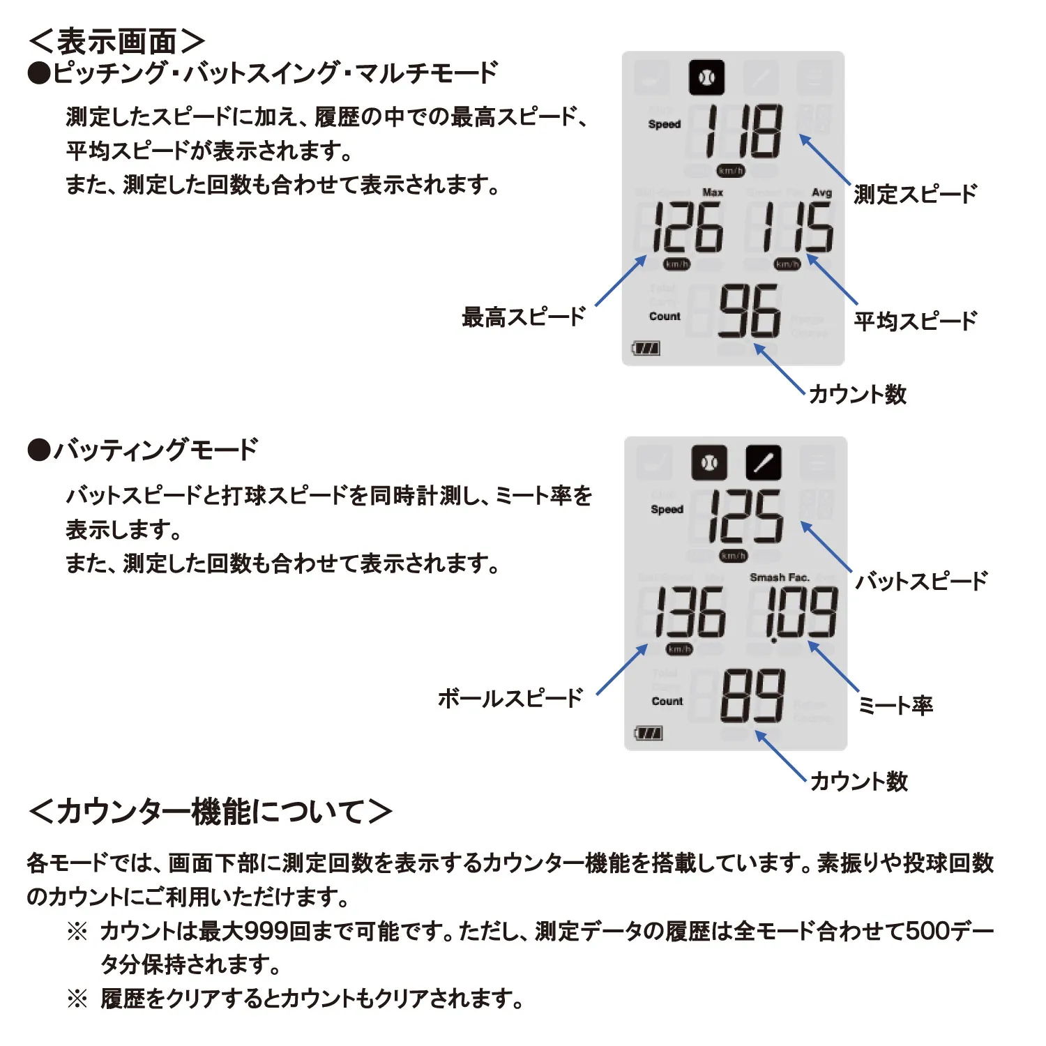 ●測定可能範囲 ・ピッチングモード、バットスイングモード、バッティングモード スイングスピード/ボールスピード:30km/h~180km/h・マルチモード スピード:30km/h~300km/h・ゴルフモード ヘッドスピード/ボールスピード;10m/s~90m/s