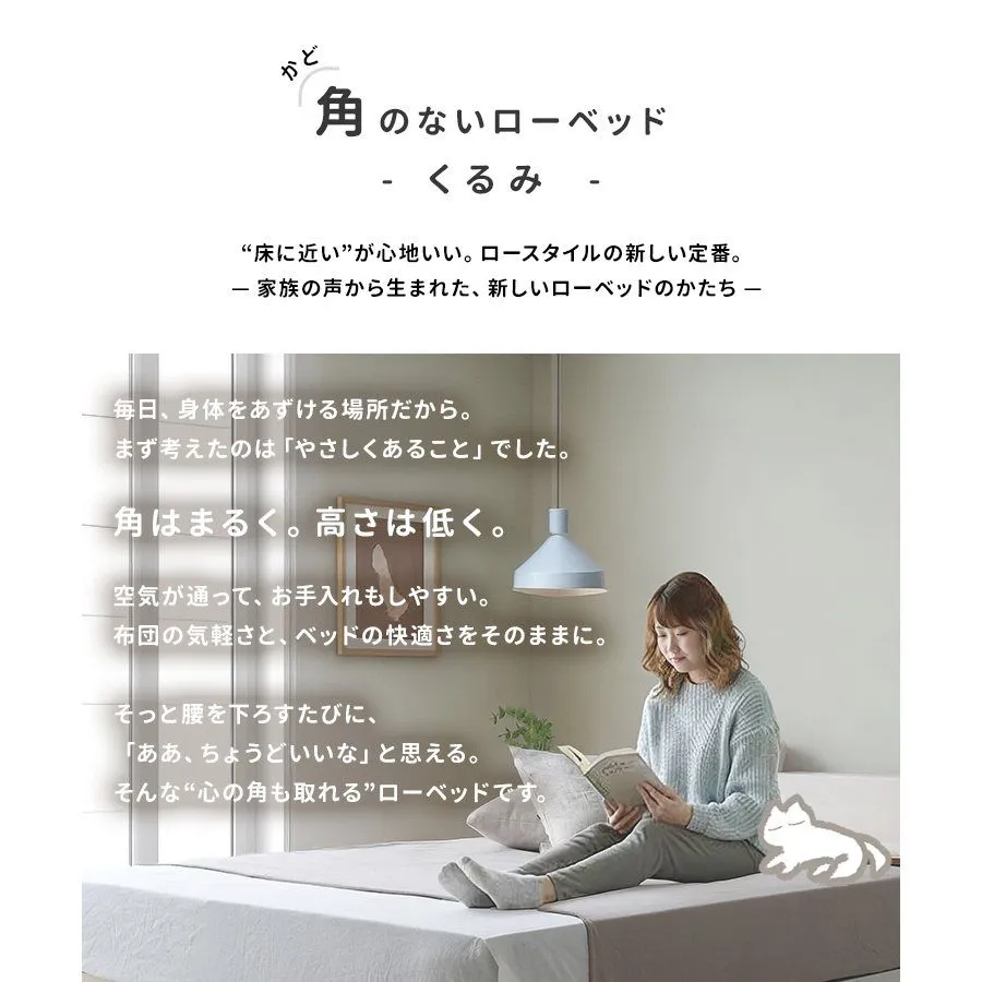 角のない安心設計と、床に近いロースタイル。 家族でも使いやすい、やさしさを大切にしたベッドです。