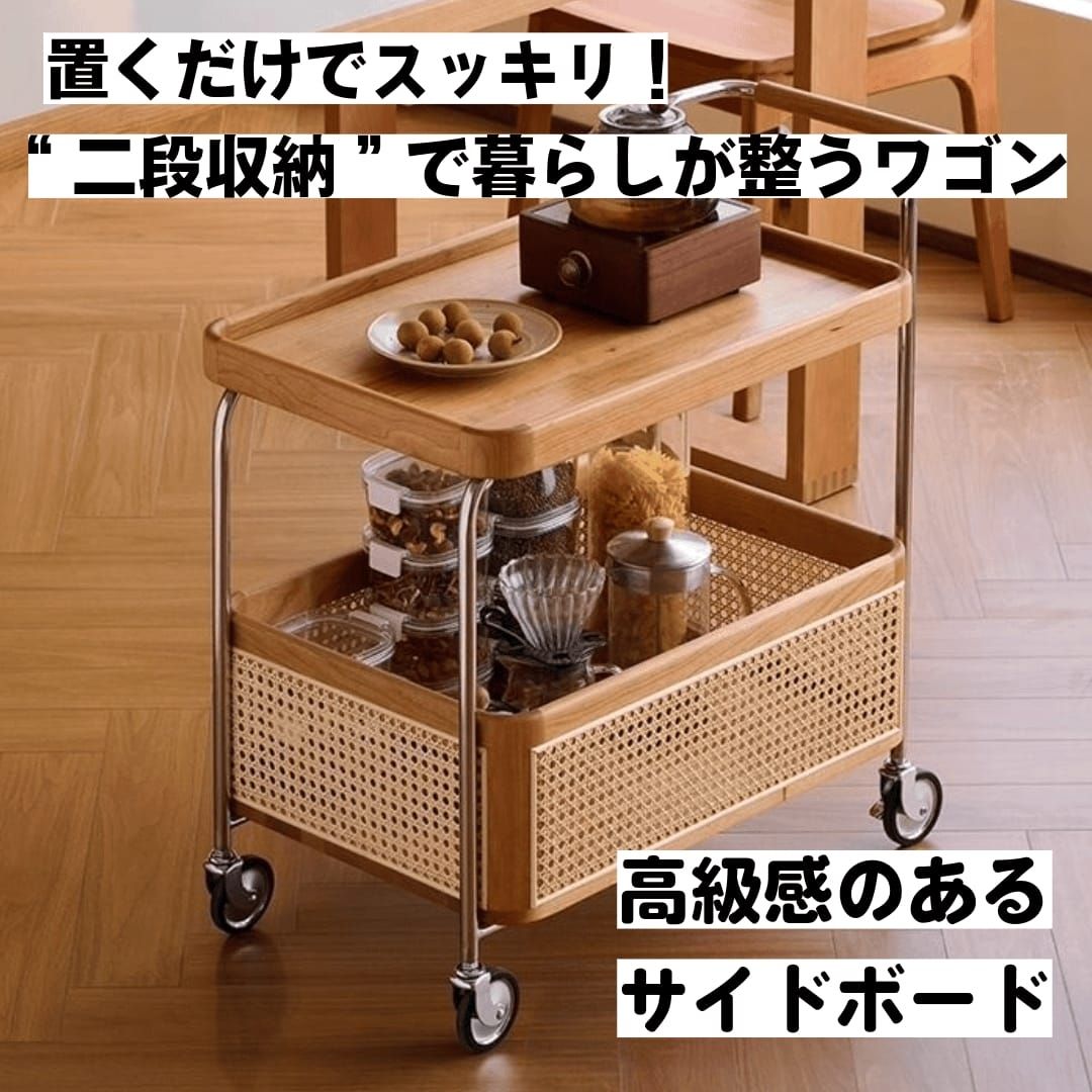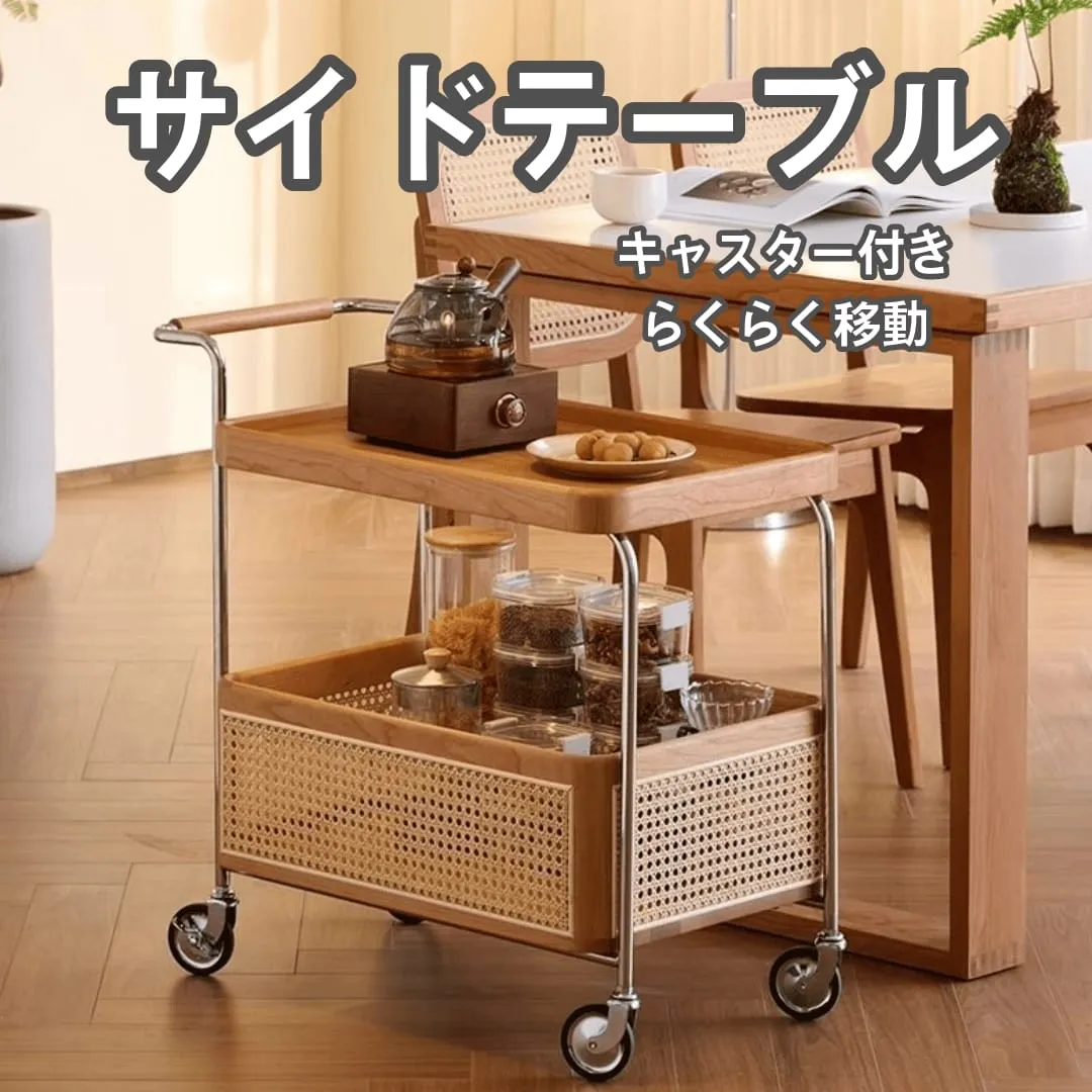 天然木の風合いとラタン調デザインが美しい、キャスター付きサイドテーブルワゴンです。
