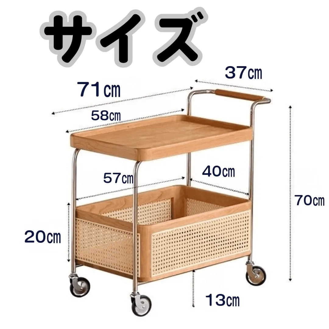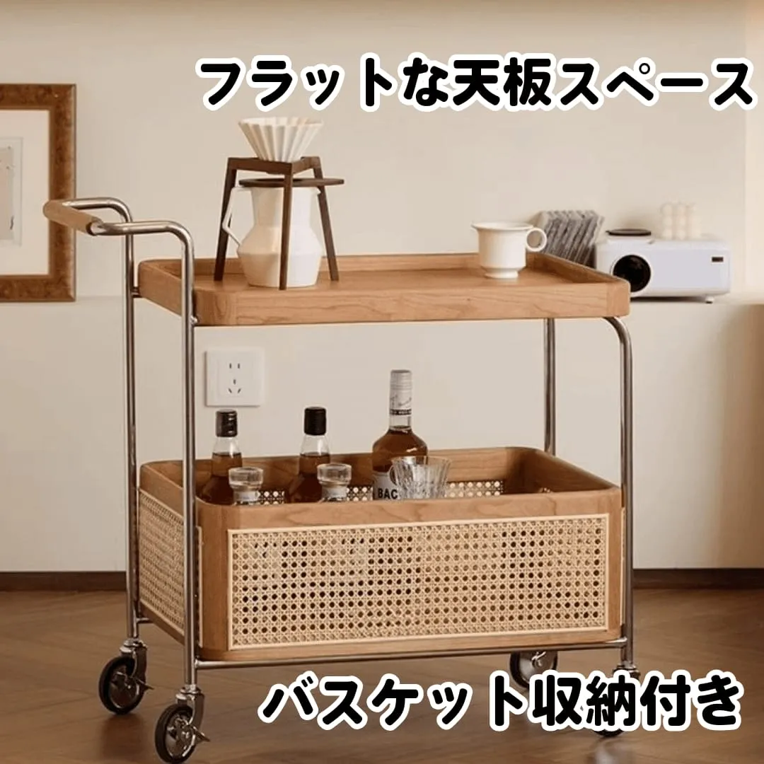 サイドテーブル ワゴン キャスター付き 2段収納 ラタン調 バスケット付き 木製 天然木風 移動式 収納 キッチンワゴン 北欧 ブレーキ付