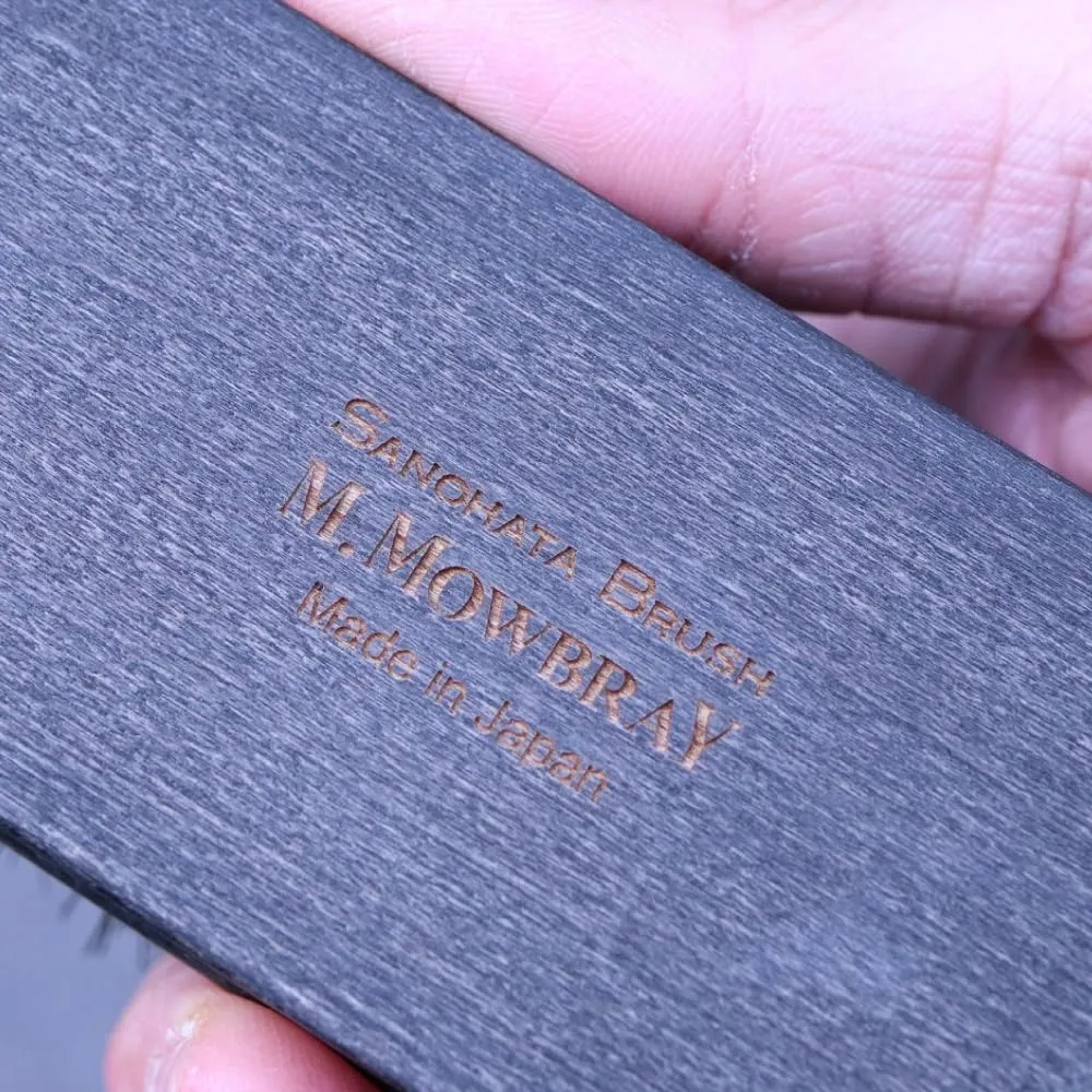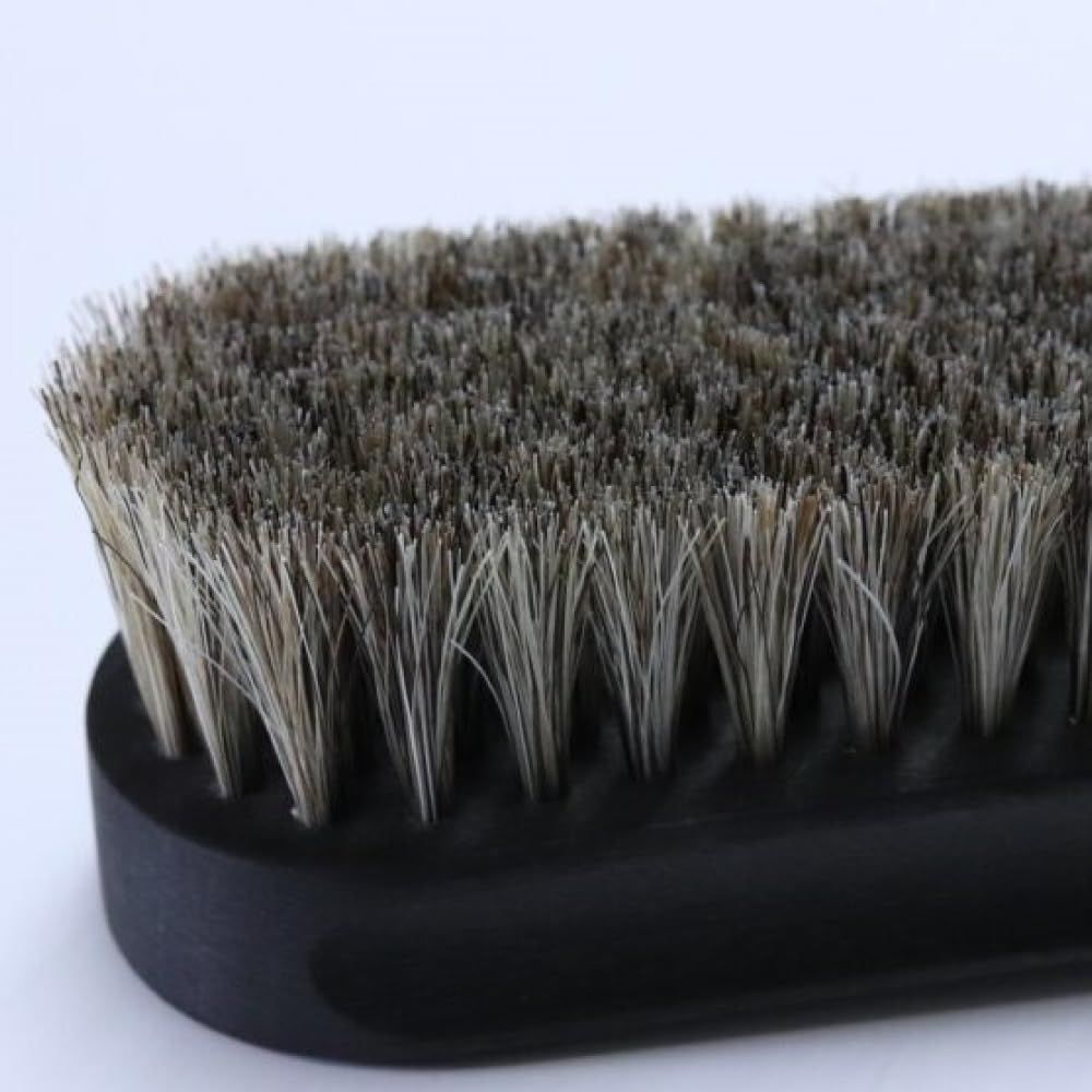 スムースレザーのホコリ落としやコードバンの仕上げ用のこだわりの馬毛ブラシ。持ち手の木には木目の美しいブナ材を使用。木目を引き立てる仕上げを施しています。毛並はしっかりとブラッシングがかかるよう直線に揃えてあります。しかし、単なる直線ではなく革に一番接する中央部分のみ1~2mmほど長めにカット。 使用感と効率を考慮した職人の技が光るこだわりのブラシです。