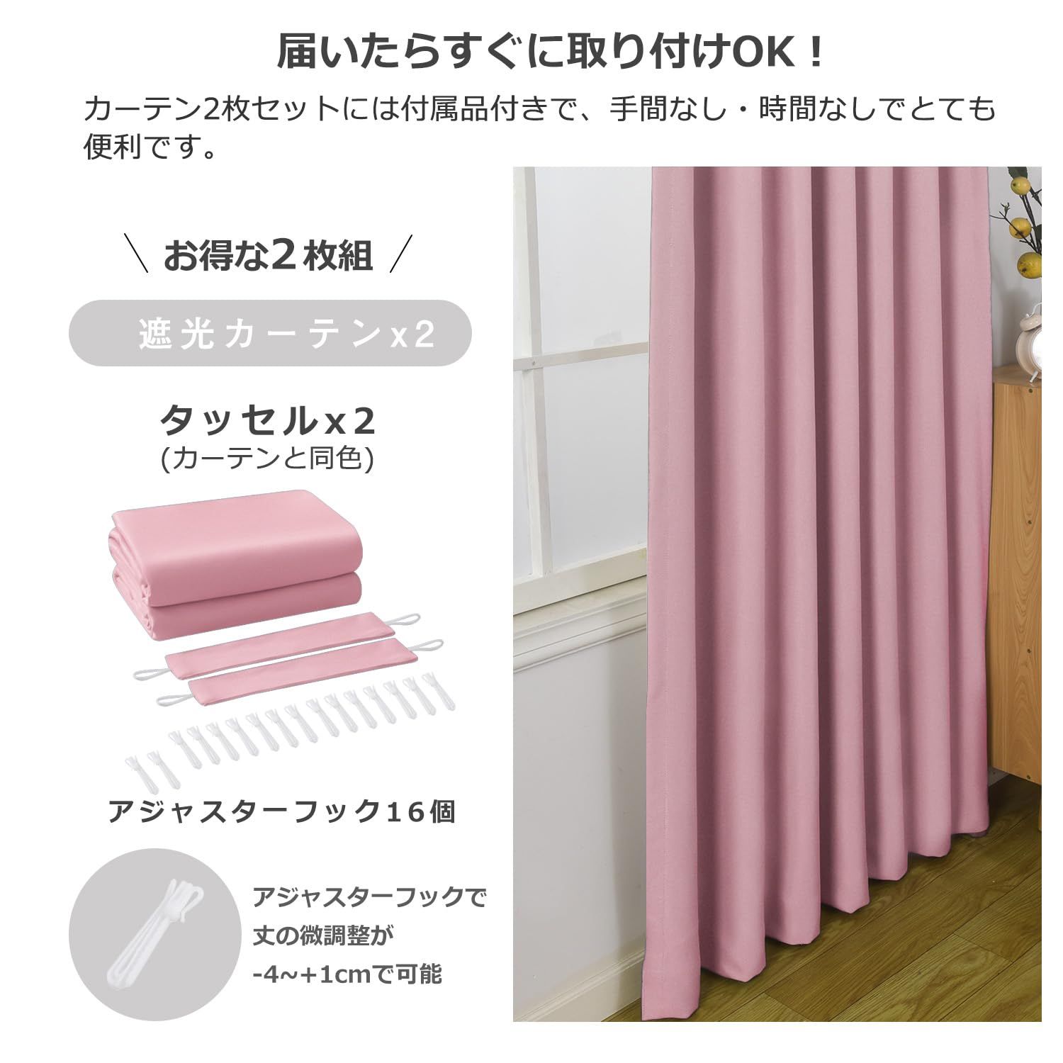 簡単な取り付け: 既成 カーテンセット内容:遮光カーテン2枚、タイバック2個、カーテン調節フック14個付き、フリー2個付き(計16個)カーテンにはアジャスターフックを付いて出荷され、調節ブックが付き、取付簡単