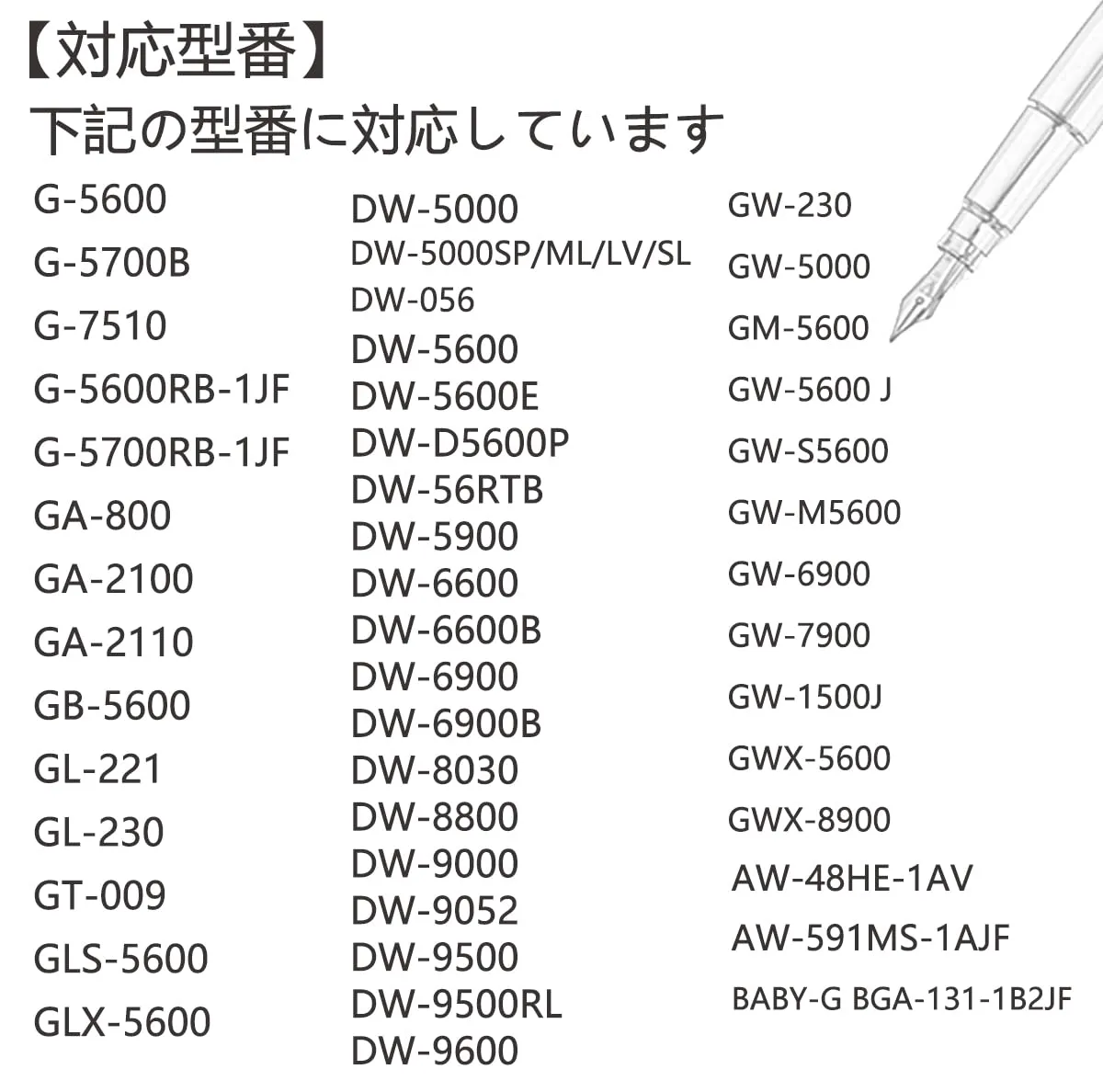 【対応型番】DW-5000/056/5600/5600E/D5600P/56RTB/5900/6600/6600B/6900/6900B/8030/8800/9000/9052/9500/9500RL/9600・G-5600/5700B/7510/5600RB-1JF/5700RB-1JF・GA-800/2100/2110・GB-5600・GL-221/230・GT-009・GLS-5600・GLX-5600・GW-230/1500J/5000/5600/5600J/S5600/M5600/6900/7900・GWX-5600/8900・AW-48HE-1AV・AW-591MS-1AJF・BABY-G BGA-131-1B2JF