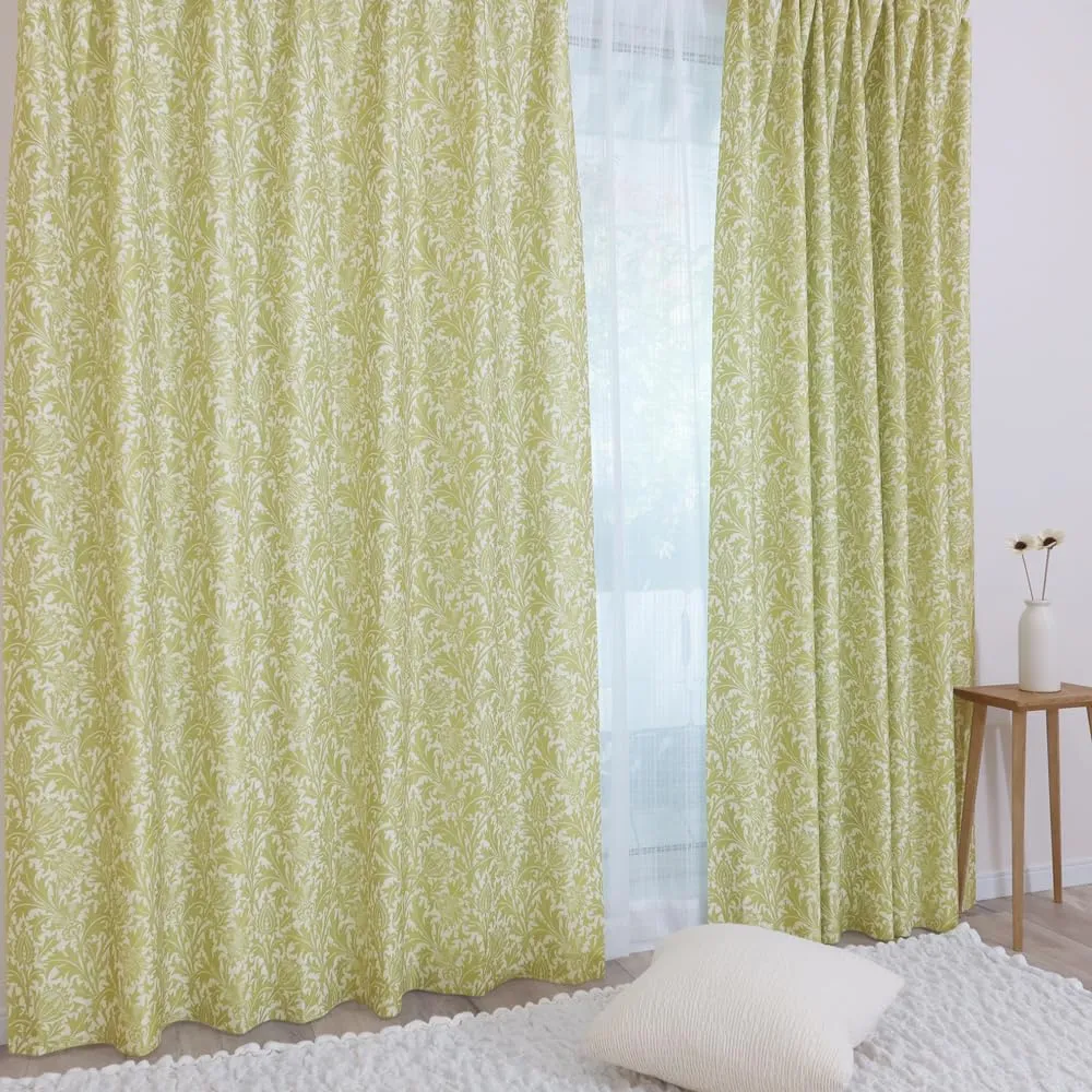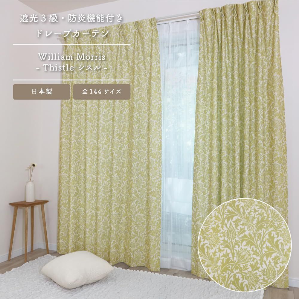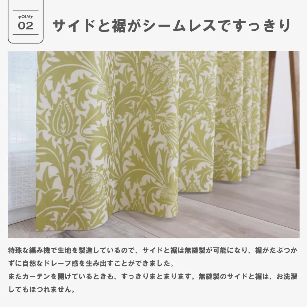 1897年、弟子のダールによるデザインです。モリスのデザインより様式化されていますが、線からはモリスの影響が強く感じられます。大きな花と流れるようなアカンサスが描かれているこのデザインは、ネオ・ゴシック様式の影響を受けており、今のモダンなインテリアでもよく選ばれる人気のデザインです。 特殊な編み機で生地を製造しているので、サイドと裾は無縫製が可能になり、裾がだぶつかずに自然なドレープ感を生み出すことができました。 3級遮光、防炎、遮熱、保温はもちろん、ご家庭の洗濯機でお洗濯できる多機能なカーテンです。また、無縫製のサイドと裾はお洗濯してもほつれません。 生地の製造、染色加工、縫製と一貫した国内生産。安心安全なこだわりの製品です。 カーテンと同じ柄のタッセルと調節可能なアジャスターフックが付いています(洗濯の時はフックを外してください)。
