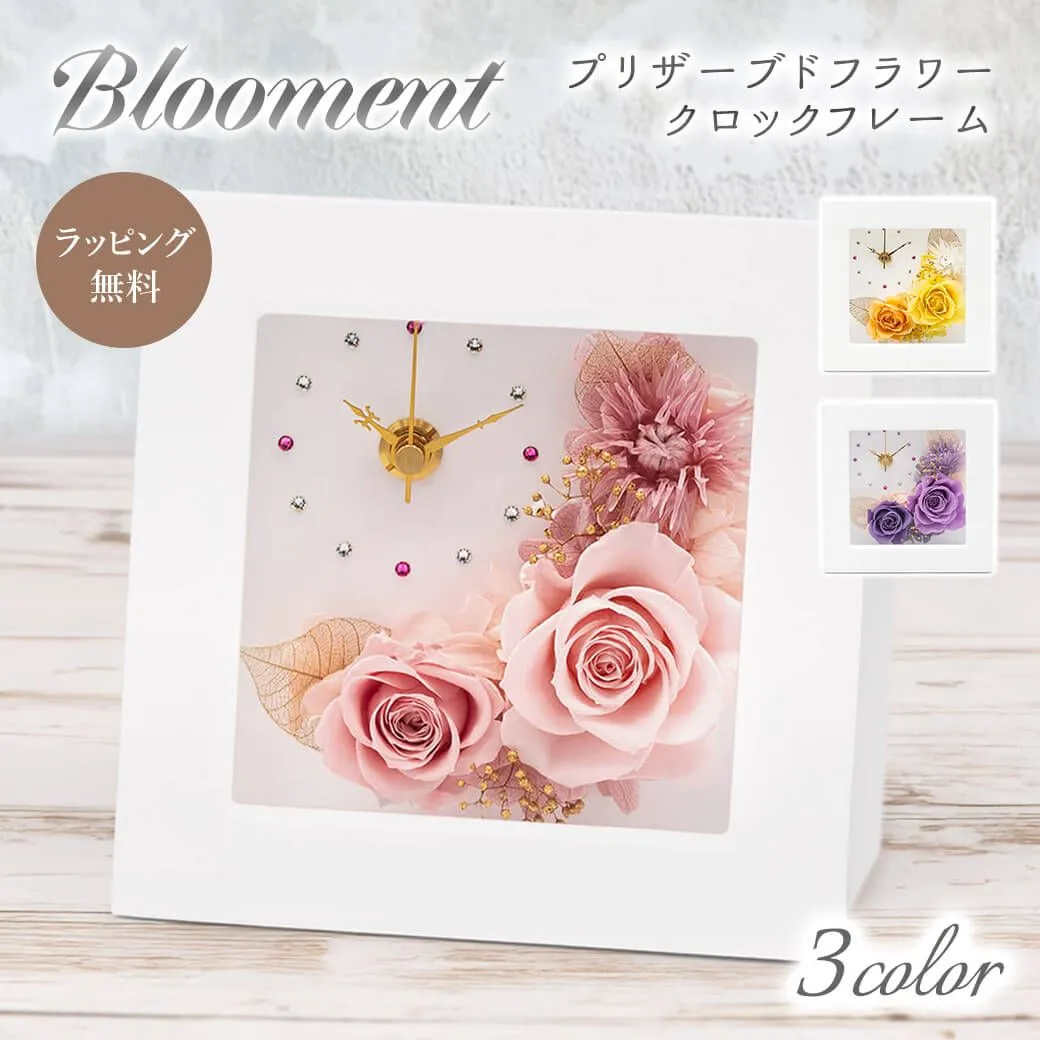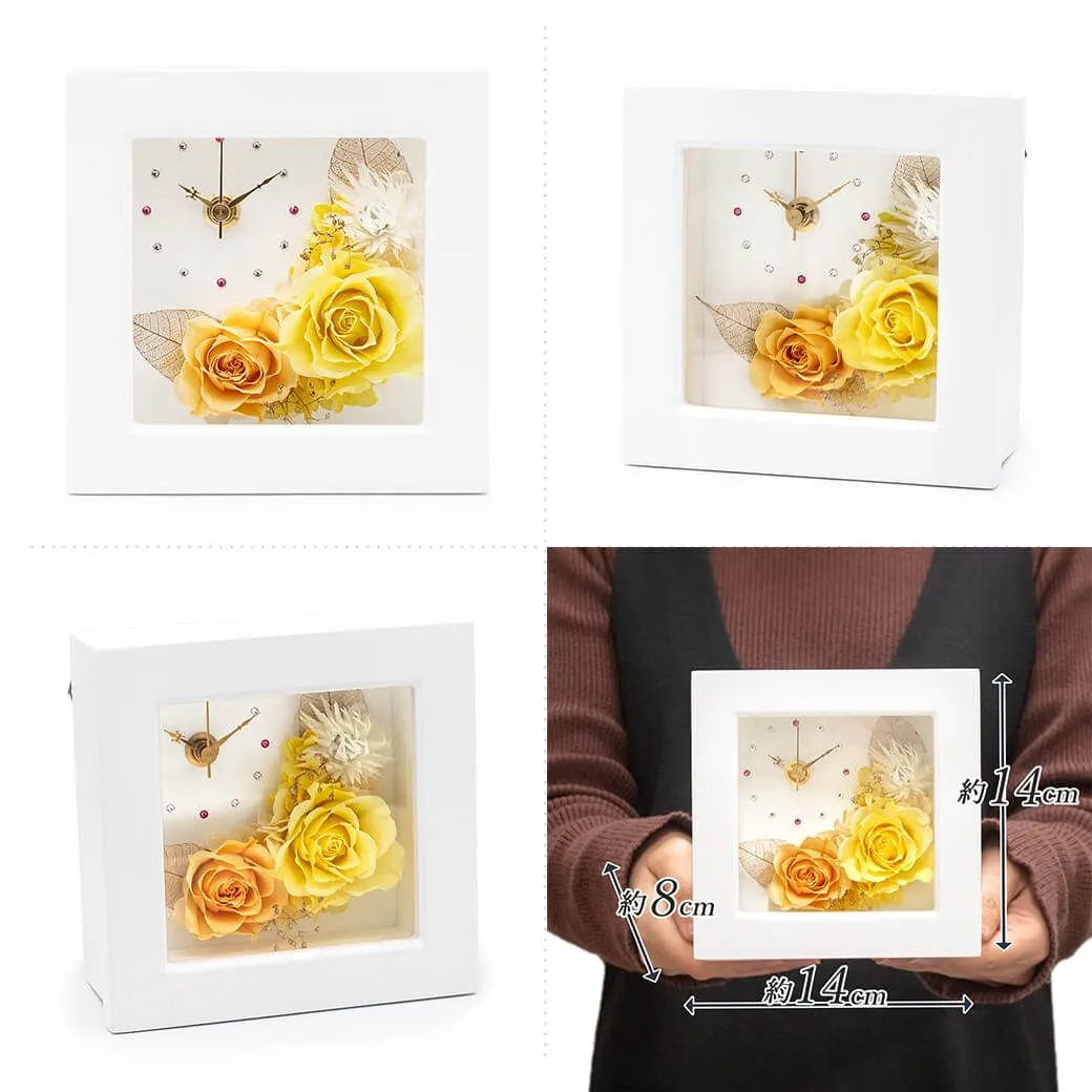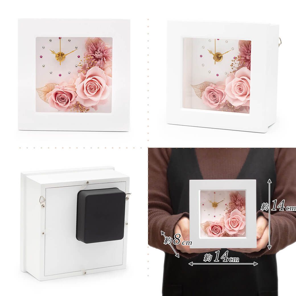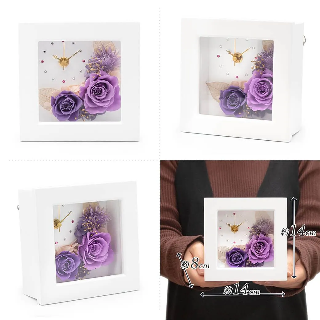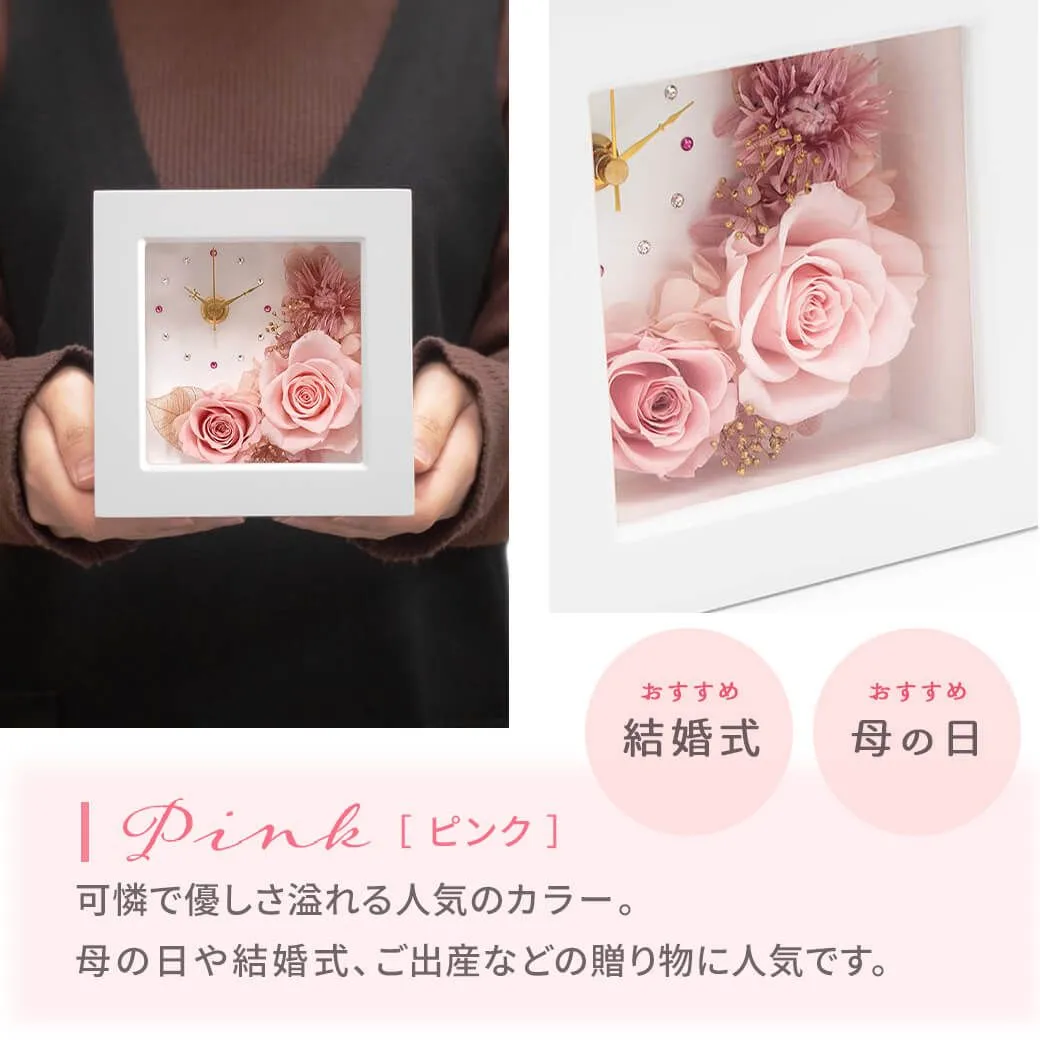 白いフレームに、プリザーブドフラワーのバラをアレンジした、おしゃれなフラワー時計。