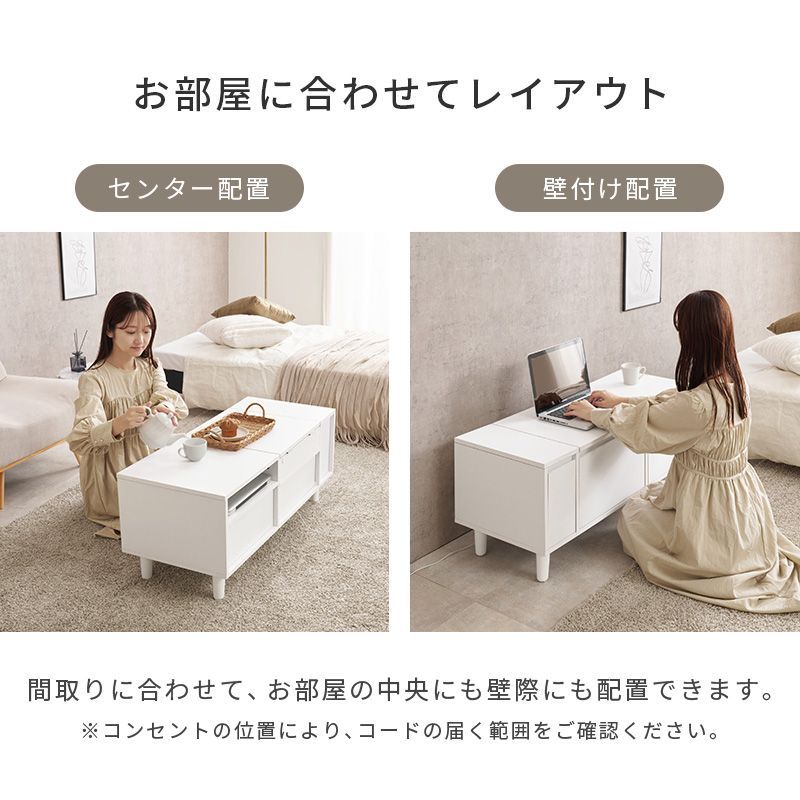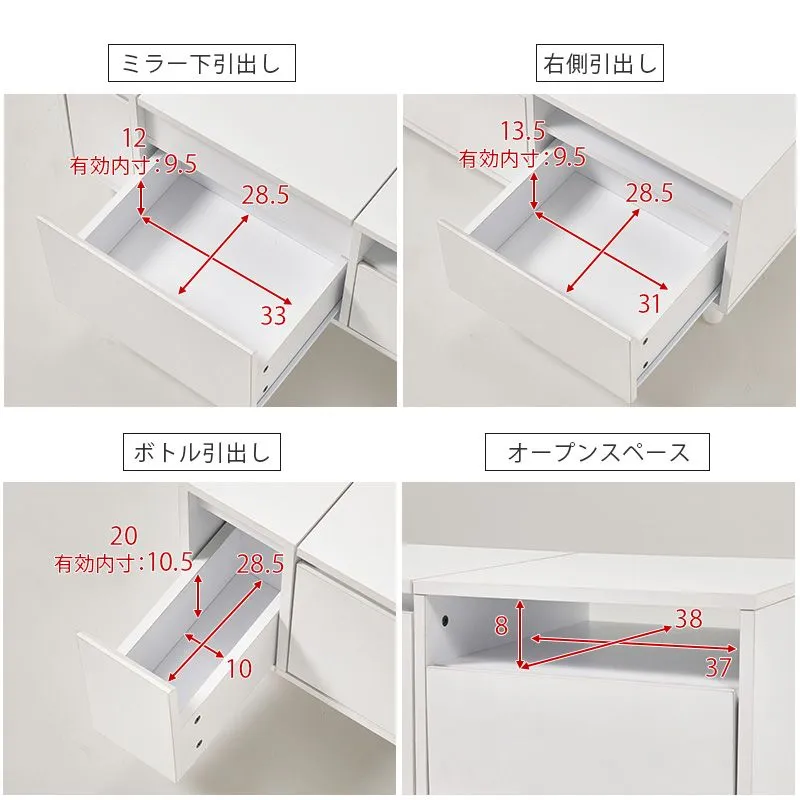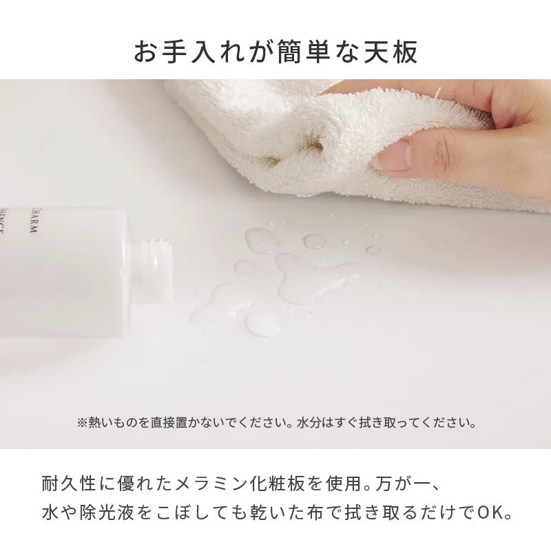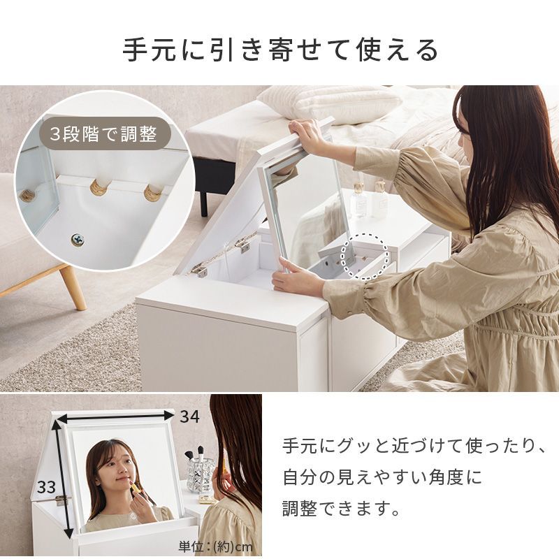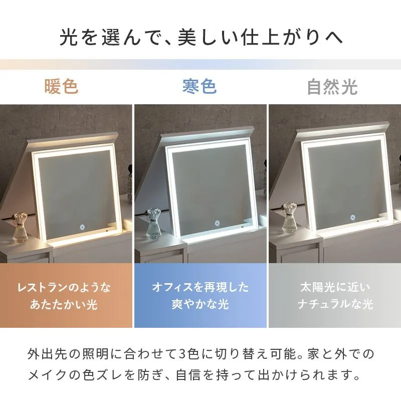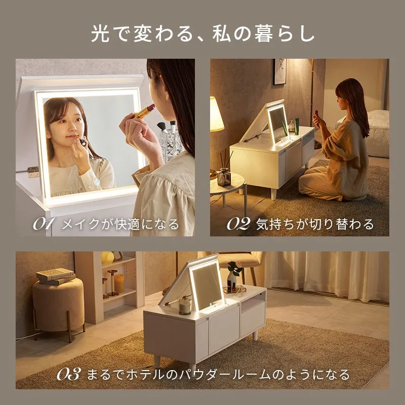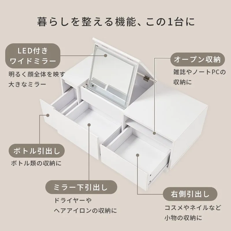 天板を閉じればテーブルとして使えるドレッサー。LEDライト付きでメイクがしやすく、コスメからドライヤーまでたっぷり収納もできます。