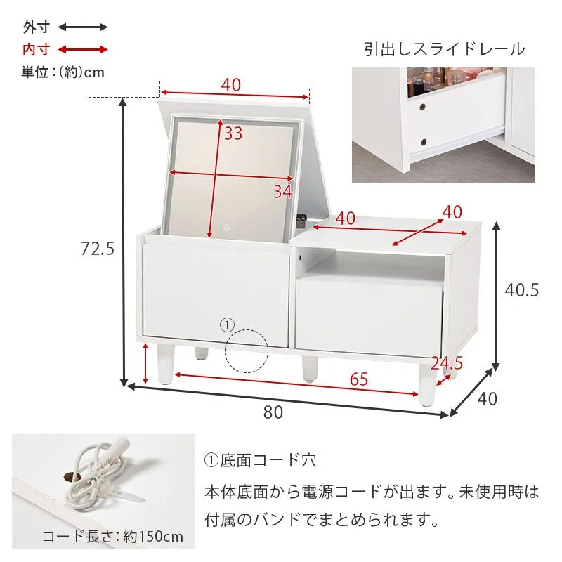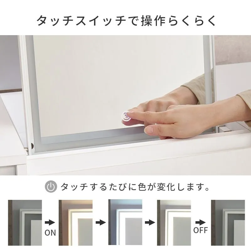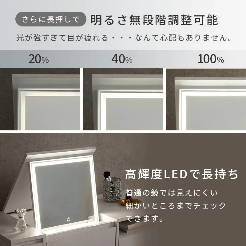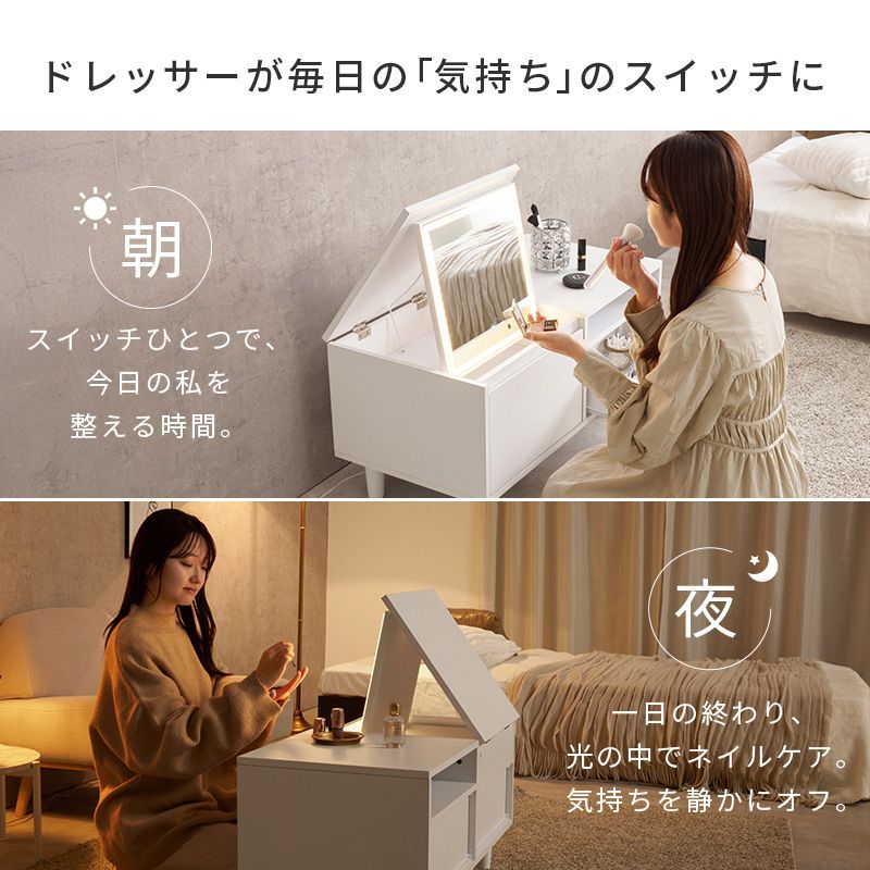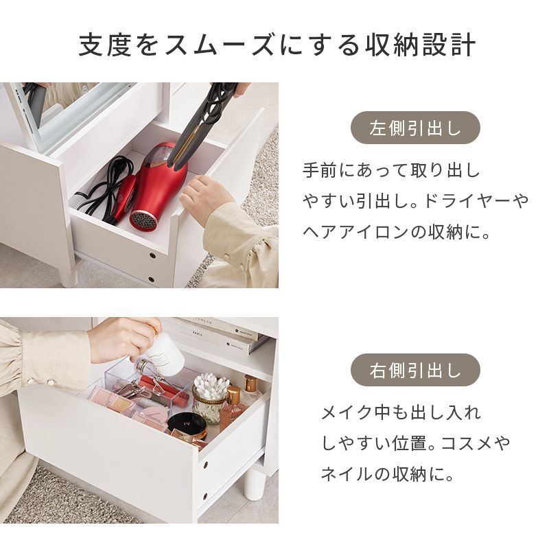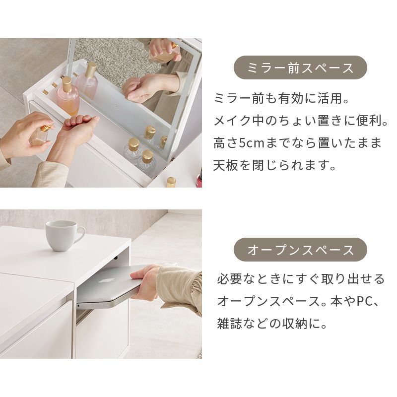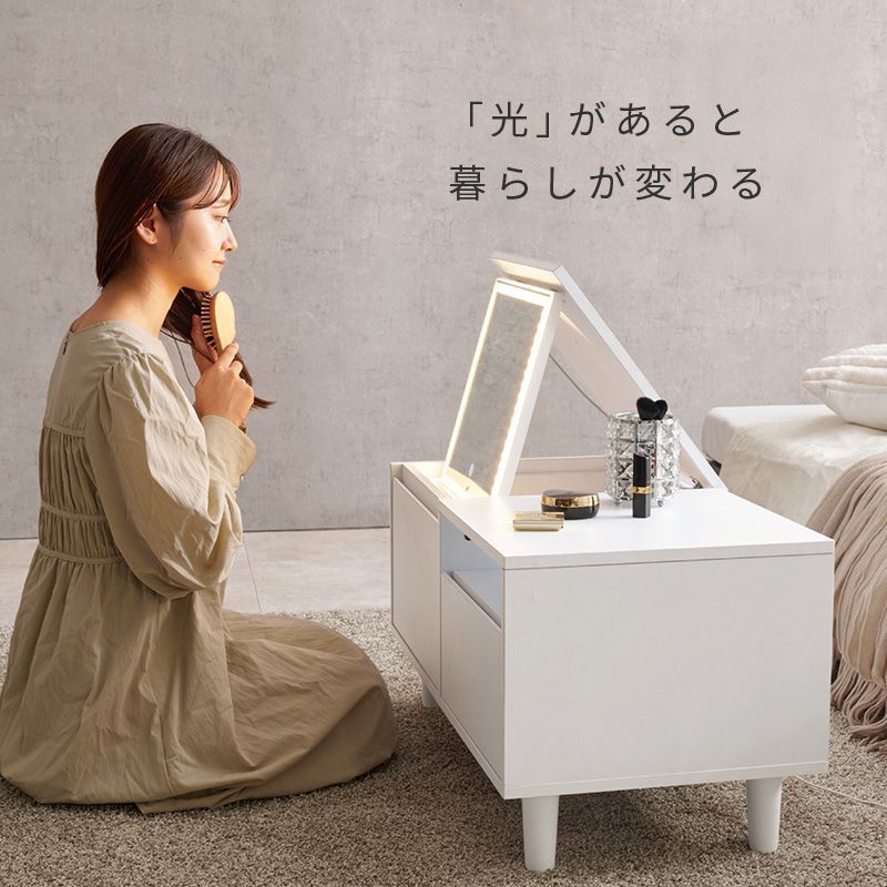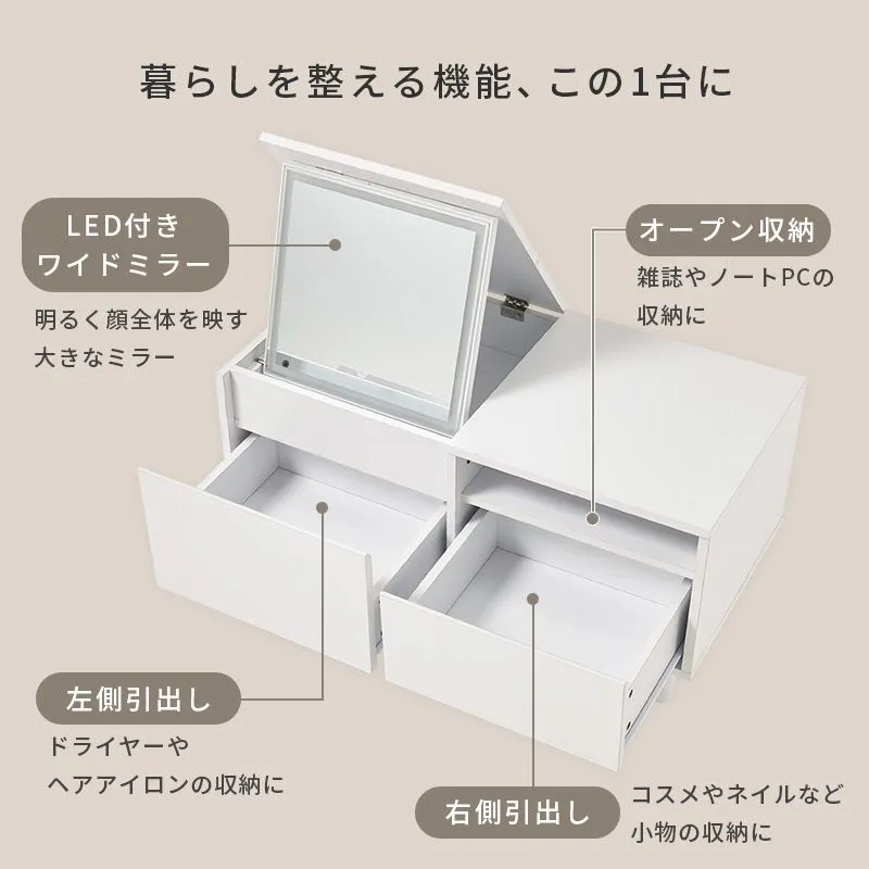 天板を閉じればテーブルとして使えるドレッサー。LEDライト付きでメイクがしやすく、コスメからドライヤーまでたっぷり収納もできます。