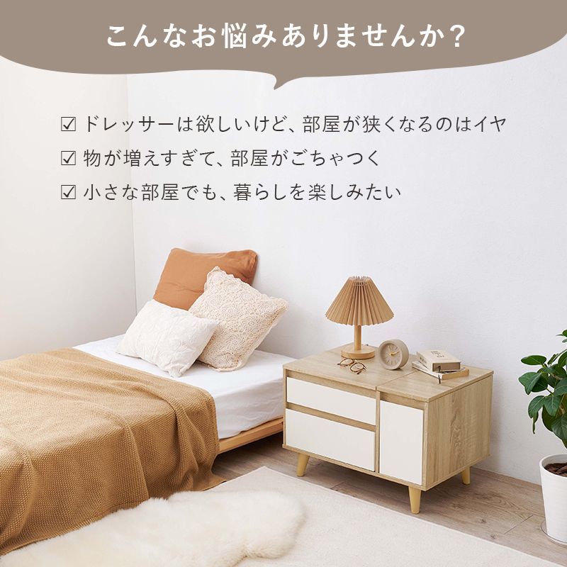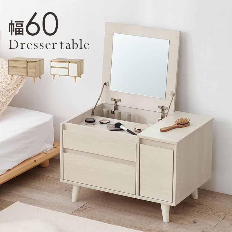 天板を開くとドレッサーとして使えるコスメテーブル。メイクがしやすい大きなミラーや収納がついているのに幅60センチとコンパクトでお部屋に置きやすいサイズです。