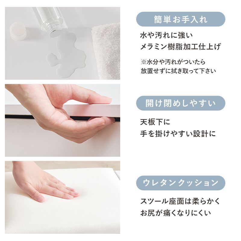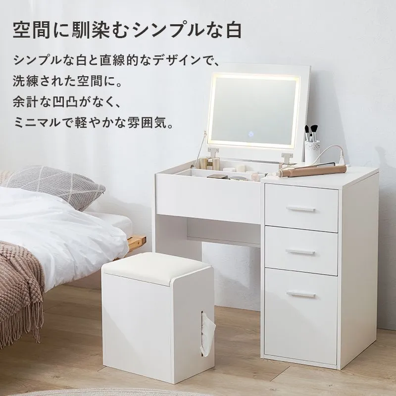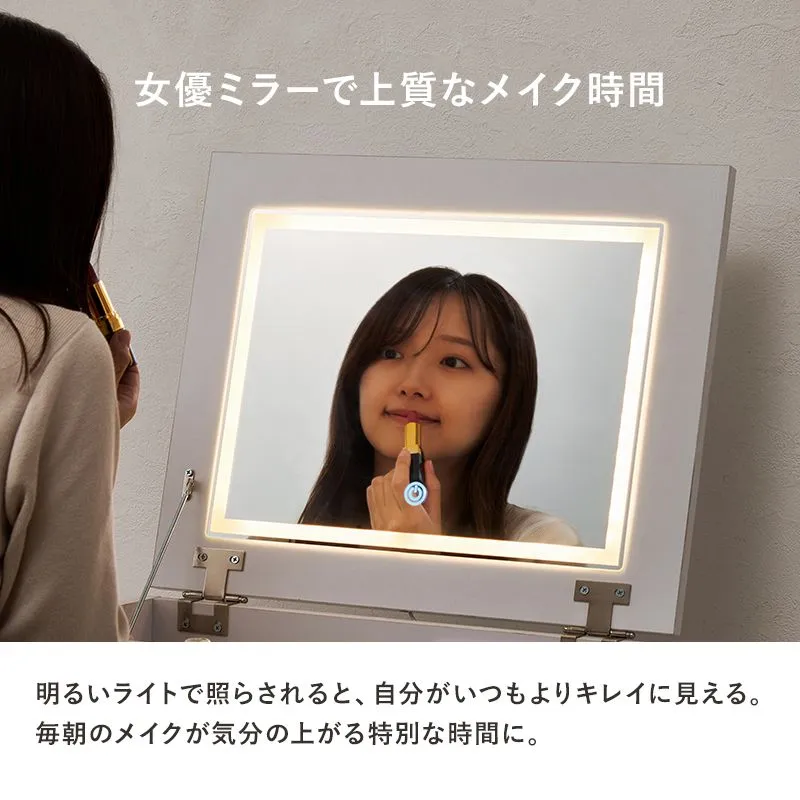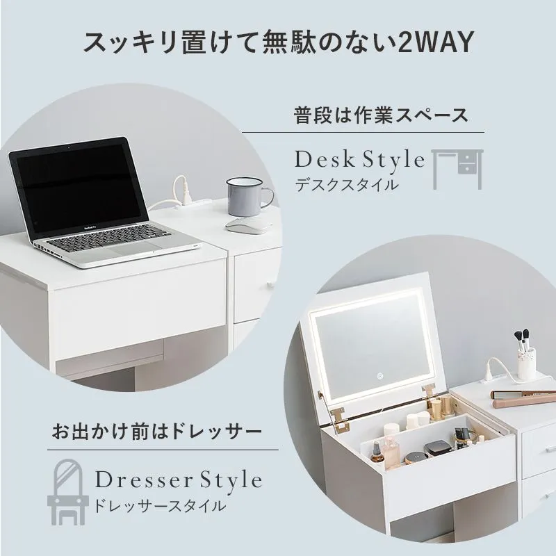 天板を閉じればデスクとして使える2WAYドレッサーセット。LEDライト付きでメイクがしやすく、ストック品の収納にも使えるスツール付き。