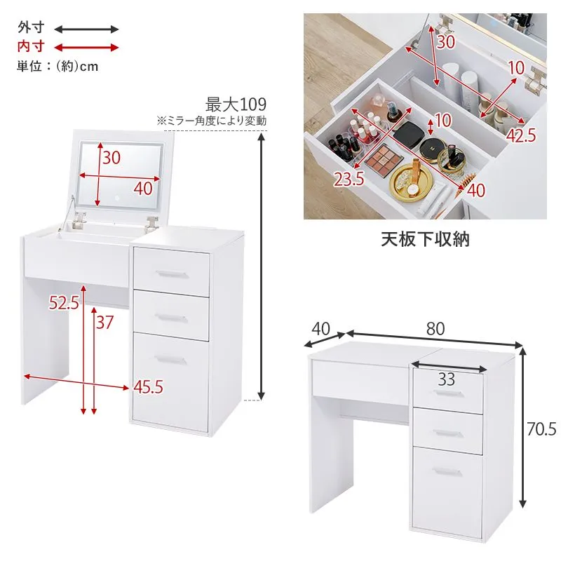 サイズ ドレッサー:(約)幅80×奥行40~70×高さ70.5/109cm,スツール:(約)幅35×奥行24×高さ41cm