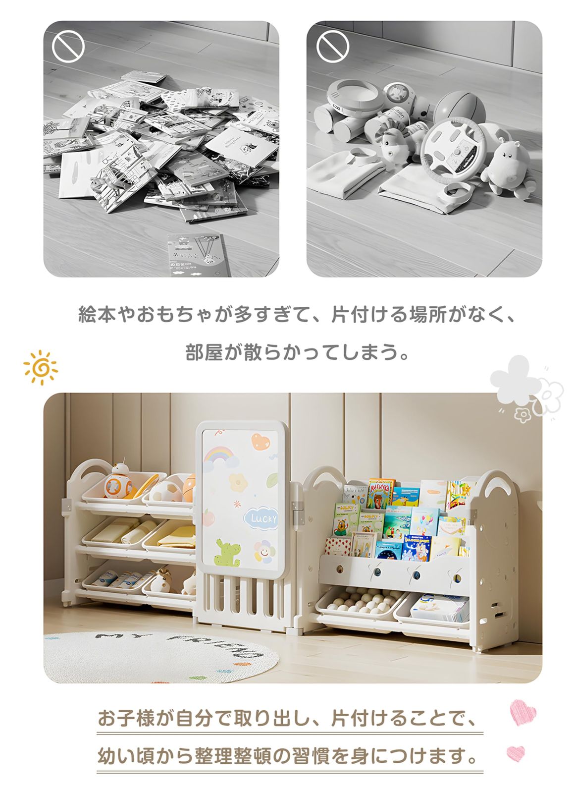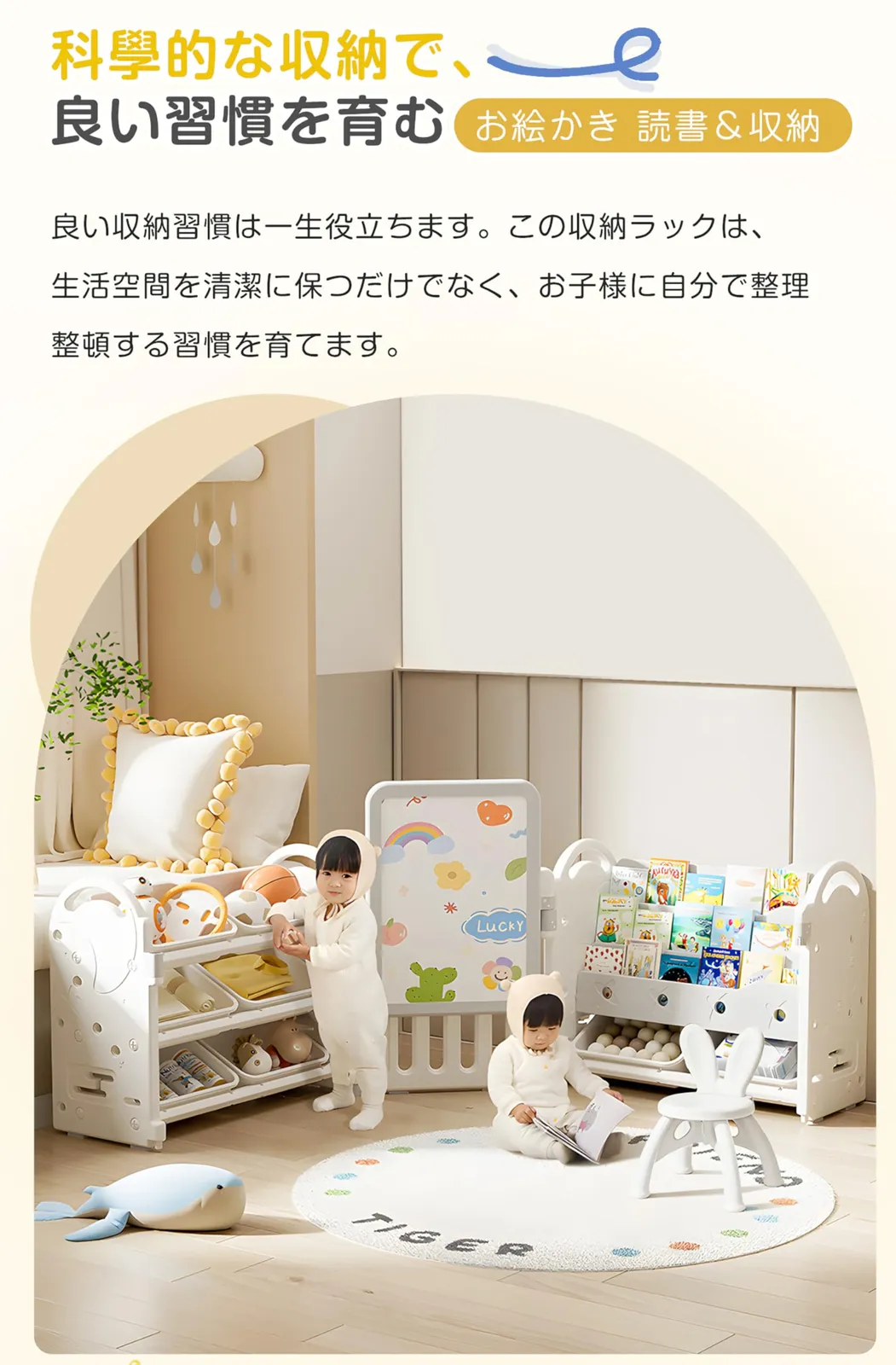 遊び・学び・片づけを1台でまとめた、フルセット仕様の収納ラックです。
