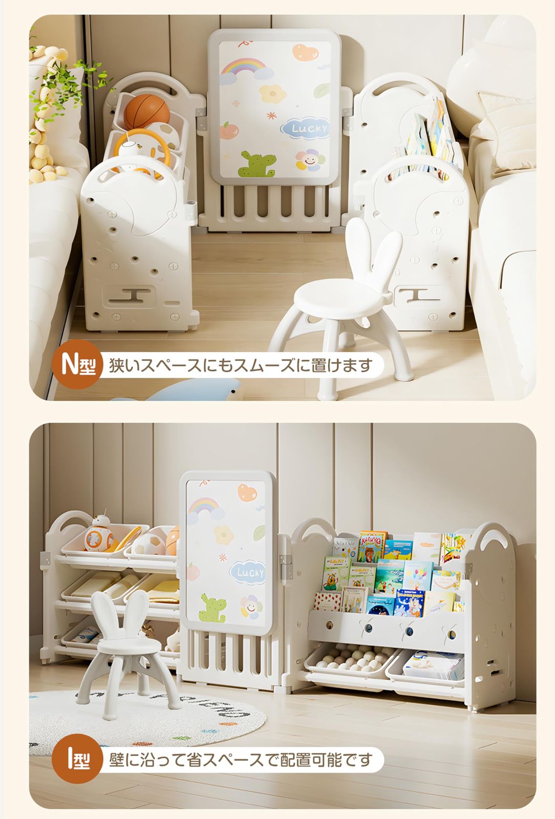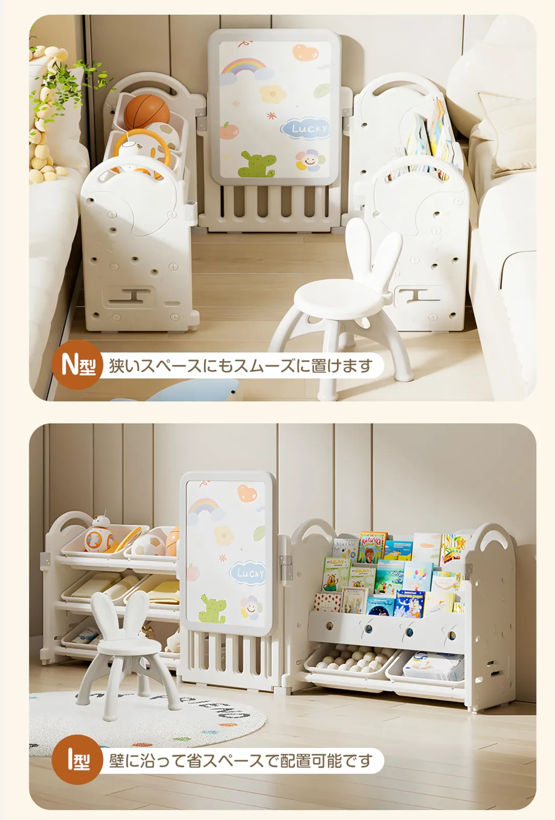 設置方法は、壁に沿って一面に配置するだけでなく、お部屋のコーナーにL字型で配置することも可能。限られたスペースでも使いやすく、生活動線を邪魔しません。