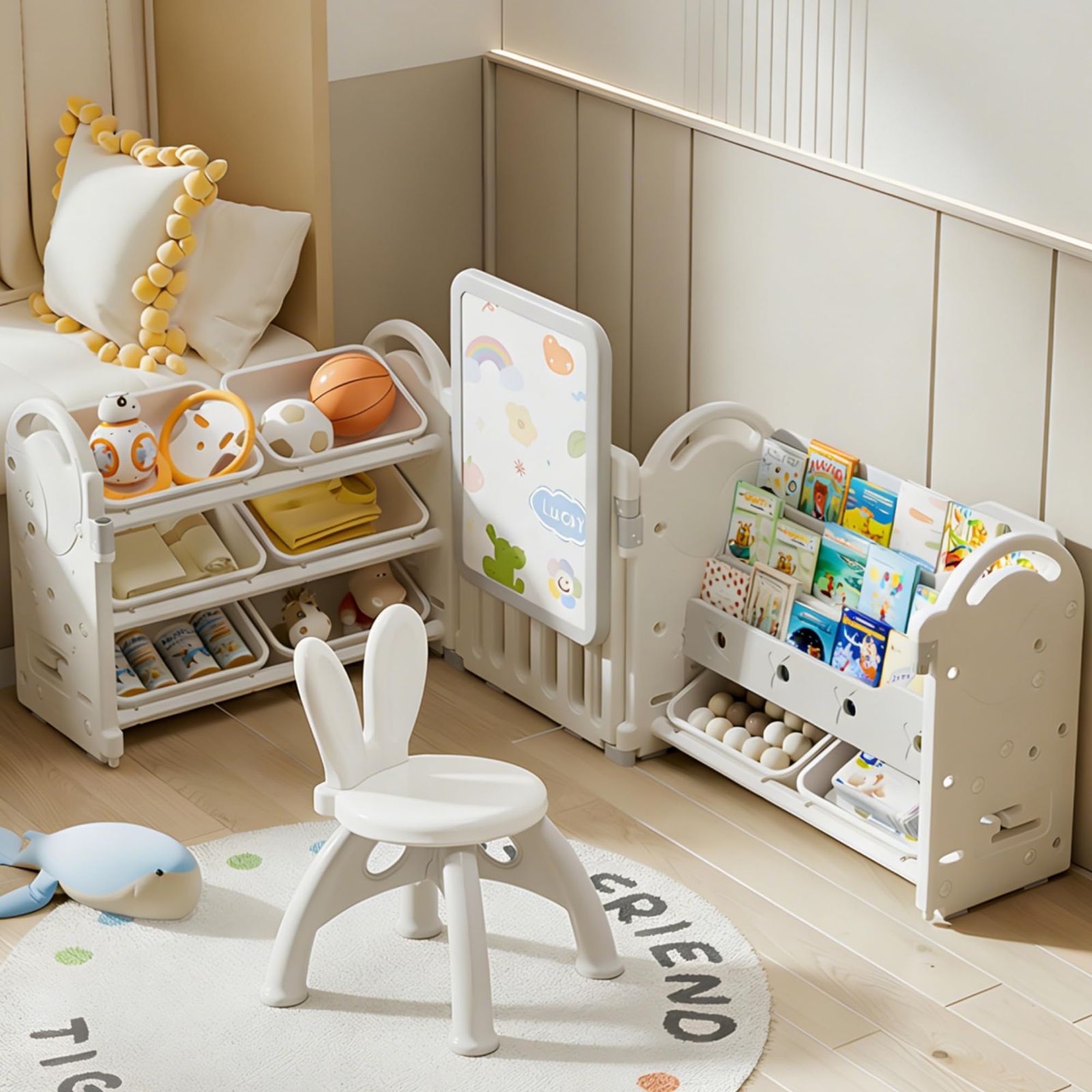左側にはおもちゃや小物をたっぷり収納できるボックス棚、右側には絵本の表紙が見える絵本ラック、中央にはお絵かきや文字練習ができるホワイトボードを配置。お子さまの成長に必要な要素をバランスよく組み合わせました。