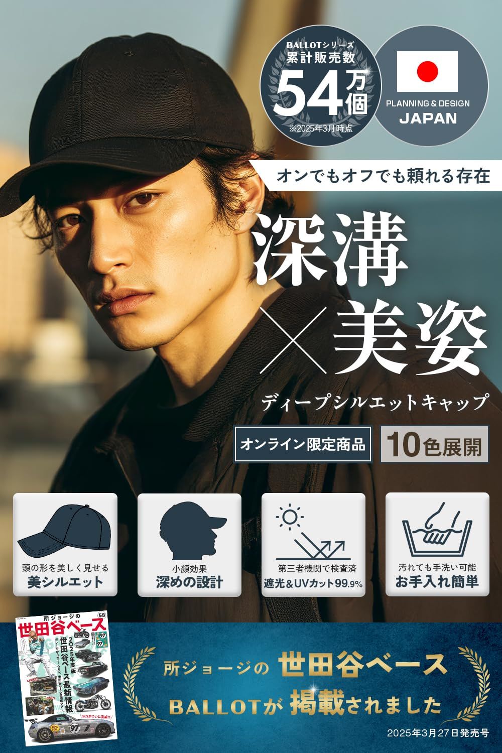 【計算された美シルエット】誰が被っても頭の形を美しく見せる、美しいシルエットを追求したコットンキャップです。無駄なロゴを一切排除したシンプルなデザインで、男女問わず幅広い年代にフィット。普段使いはもちろん、スポーツやアウトドア、旅行など様々なシーンで活躍します。おしゃれと機能性を兼ね備えた万能な帽子です。