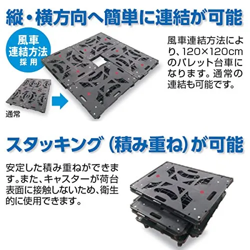 ●荷台表面が汚れずに積み重ね可能(荷台表面にキャスターが接触しないため衛生的に使用できる)。