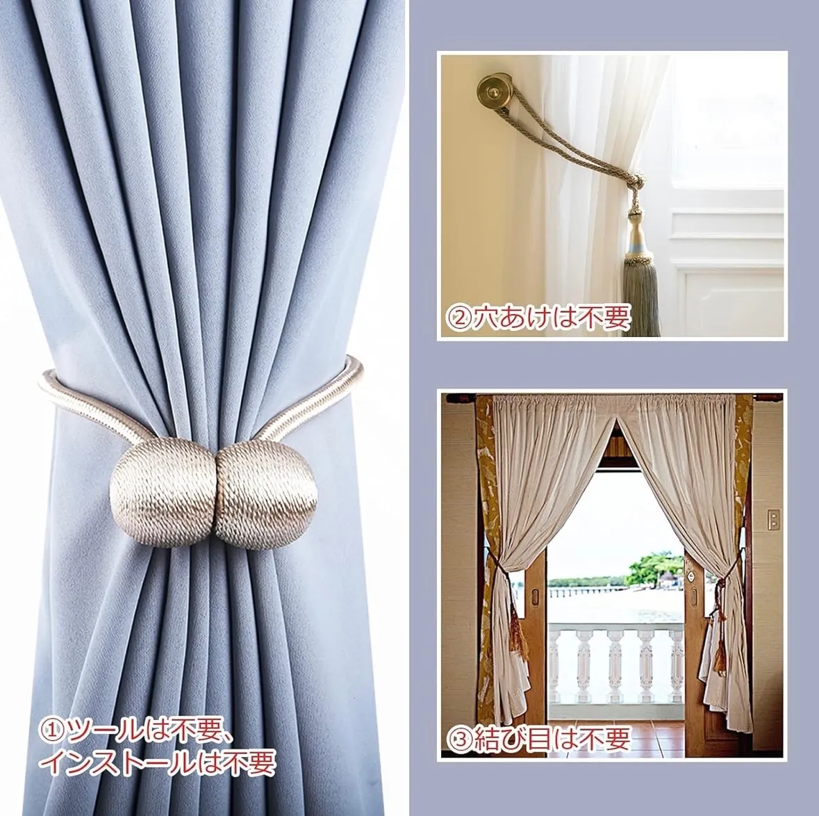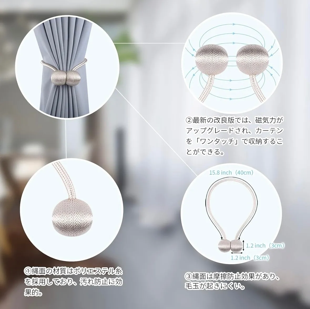 【2022年には強磁性にアップグレードする】うちの磁気カーテンタッセルはハイエンドの新型輸入ニッケル磁石を採用しています。極めて強い耐食性と耐久性を持っています。普普通のカーテンのバックルよりも磁気がよくて、錆もなく、色も落ちません。カーテンネクタイのロープは厚いポリエステルの糸を採用しています。長持ちするだけでなく、磨耗やボールが起きにくいです。