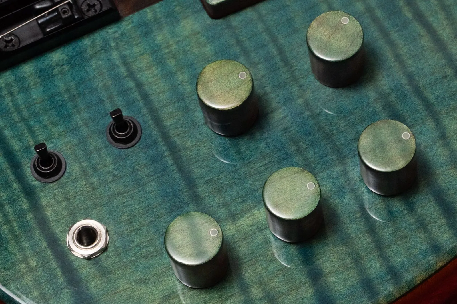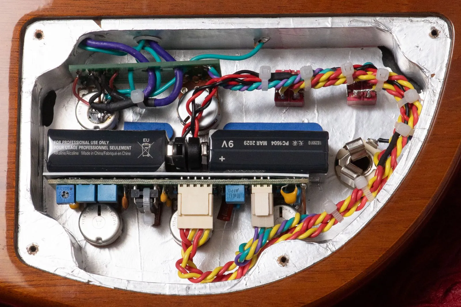 3バンドEQを搭載し、コントロールはボリューム、バランサー、トレブル、ミドル、ベース、プリアンプバイパスsw、ミドルフリーケンシー切り替えsw。