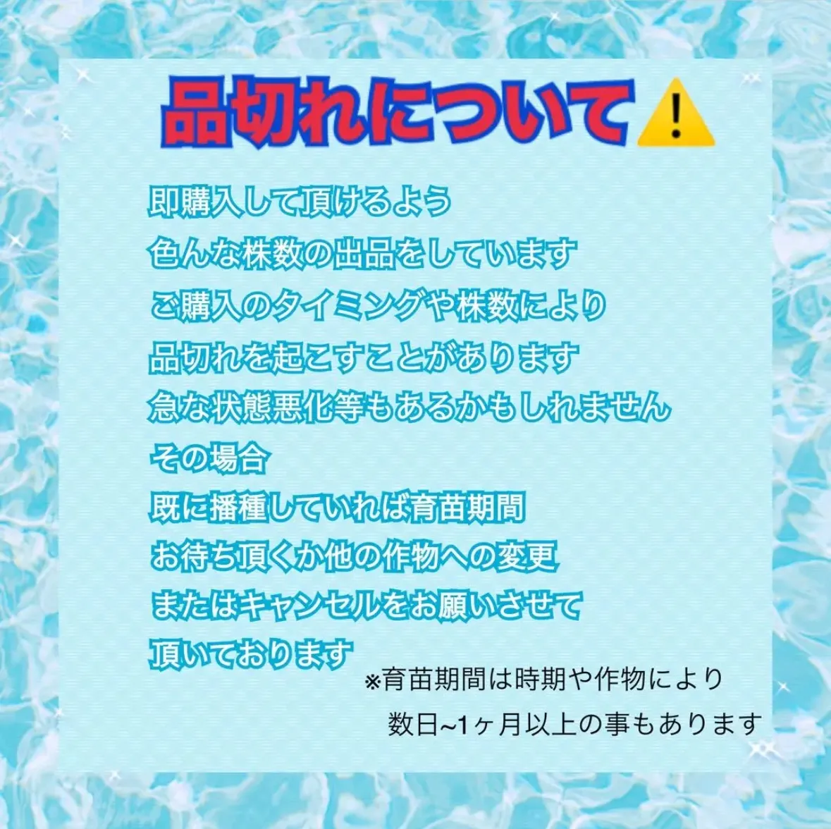⚠️プロフィール、商品説明⚠️お読み下さい 専用出品は対応不可ですので、 設定されている組み合わせからお選びください。 ▷基本育苗中農薬不使用ですが 苗の状態によっては薬を使ってる場合有り ▷200穴育苗(1穴数粒播種) ▷小さな苗床にて育苗 細めの小ぶり苗ですが 畑に植え付ければしっかり育ちます (肥料等など適切に施している場合) ▷在庫状況によって 播種日が違うものでお作りすることがあります。 苗の太さやサイズに違いがありましても、 ご理解下さいますようお願い致します。 ⚠️ 栽培に関しての質問はお答え致しません 栽培時期などは地域や環境で ご自身で判断、購入お願い致します ⚠️急な品切れや状態悪化などで キャンセルまたは育苗日数を頂く事が有ります 取引ページにご連絡することがあるので 連絡は取れるようにして下さい ⚠️ 配達による状態の変化について 発送による傷や萎れ、変色や痛み 葉落ち等が発生する事があります 状態がいい物でも日照不足や 蒸れ等により状態の変化は起こります 運送中のトラック内は高温になりますので 状態に変化が起こりやすくなります。 春夏秋は特にご理解の上 ご購入下さいますようお願い致します。 ⚠️ 植物は日々動く為早めに出品しています 外葉の老化等ご理解ください 在庫次第で播種日も変動します ⚠️苗の色、根の巻き、サイズ等に違いがあります リアルタイムの現物掲載は出来ません イメージ写真と御理解ください