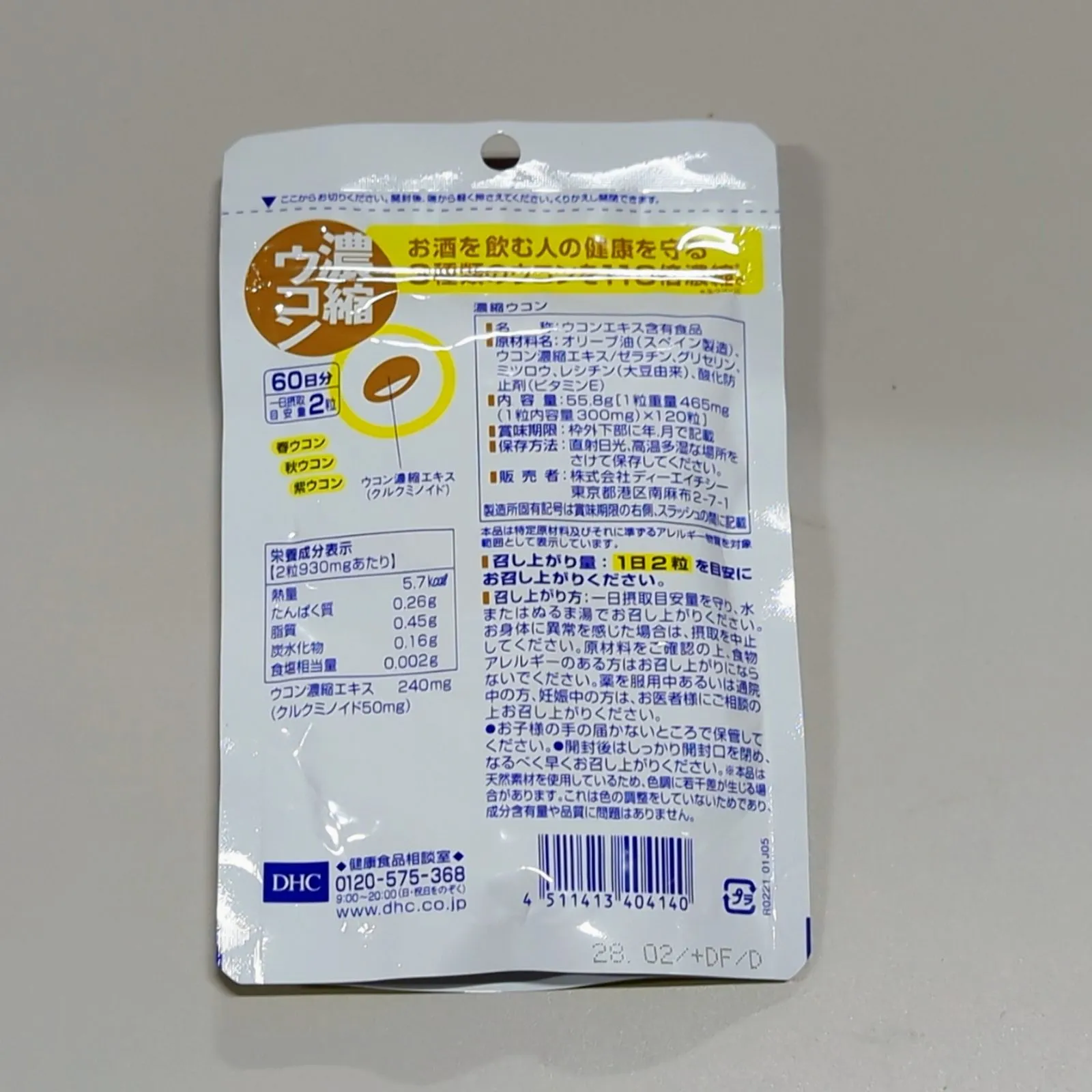 (2粒930mgあたり)熱量5.7kcal、たんぱく質0.26g、脂質0.45g、炭水化物0.16g、ナトリウム0.96mg、ウコン濃縮エキス240mg(クルクミノイド50mg)