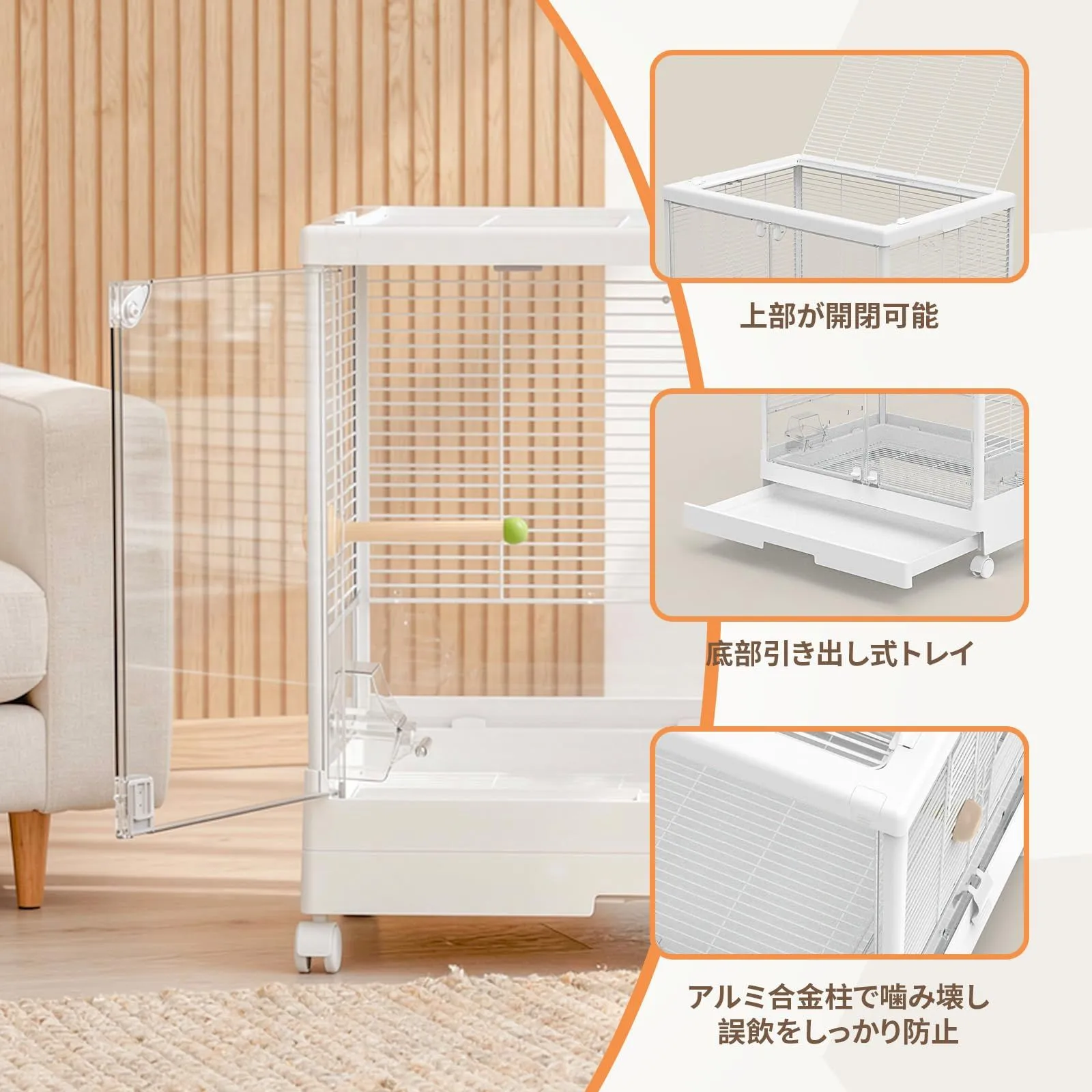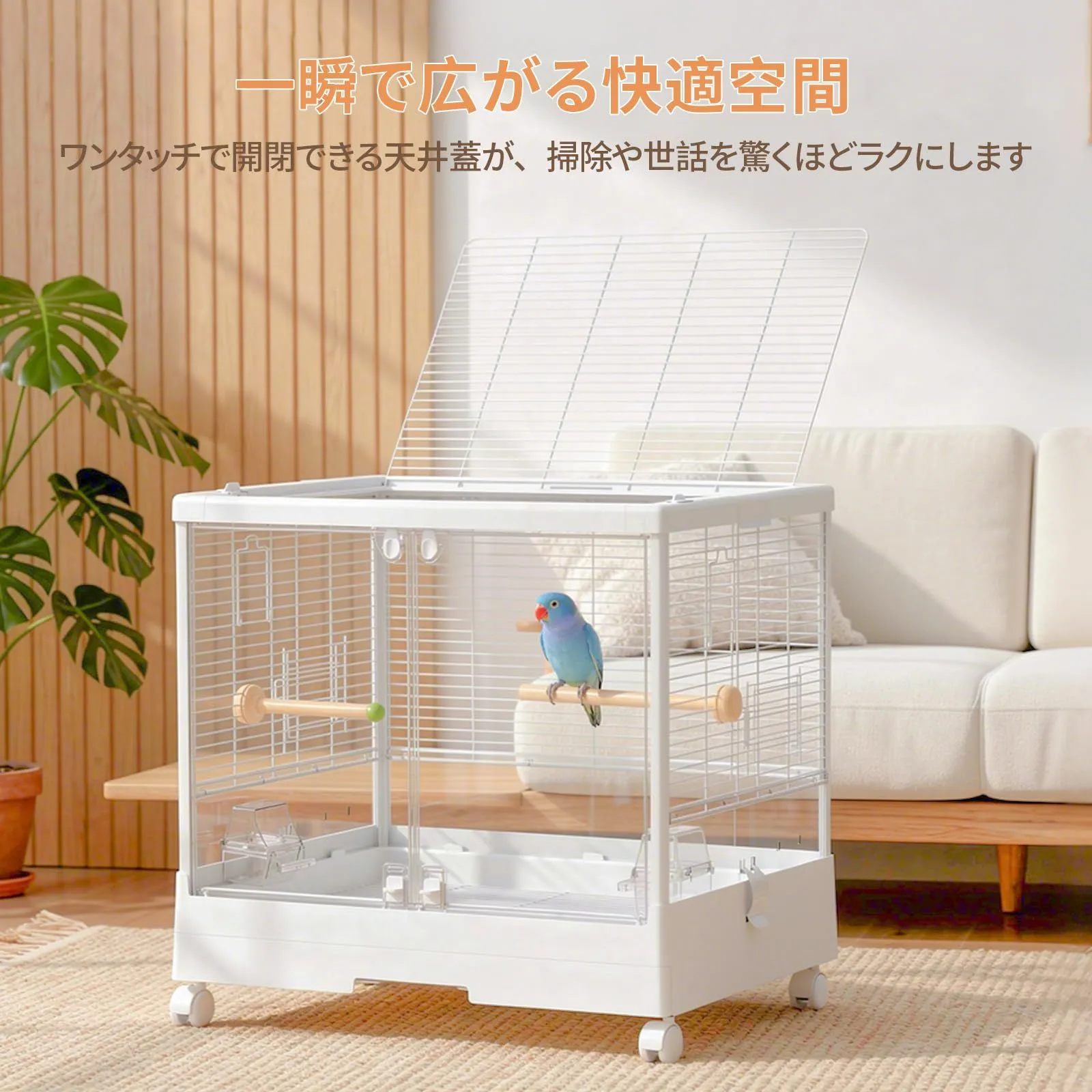 【お世話が楽しくなる・天井全開&引き出しトレイ】 天面の蓋はワンタッチで大きく開閉可能。おもちゃのレイアウト変更や、愛鳥が外へ遊びに行く「部屋んぽ」の出入りもスムーズです。また、底部には引き出し式の底皿トレイを採用し、ケージを動かさずにサッと取り出して丸洗い可能。日常のメンテナンス性を極限まで高め、飼い主様の負担を軽減します。