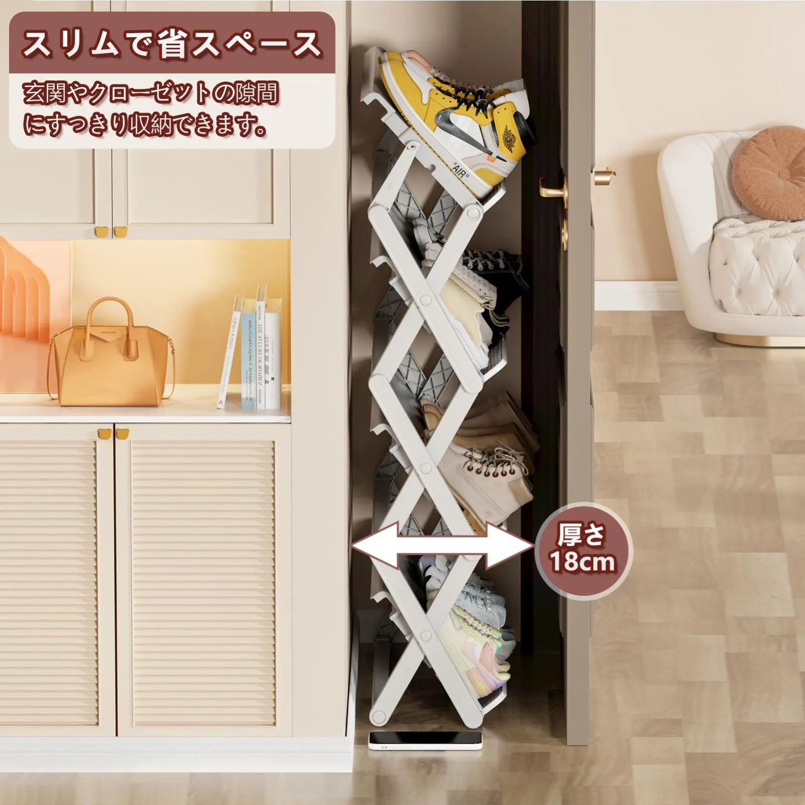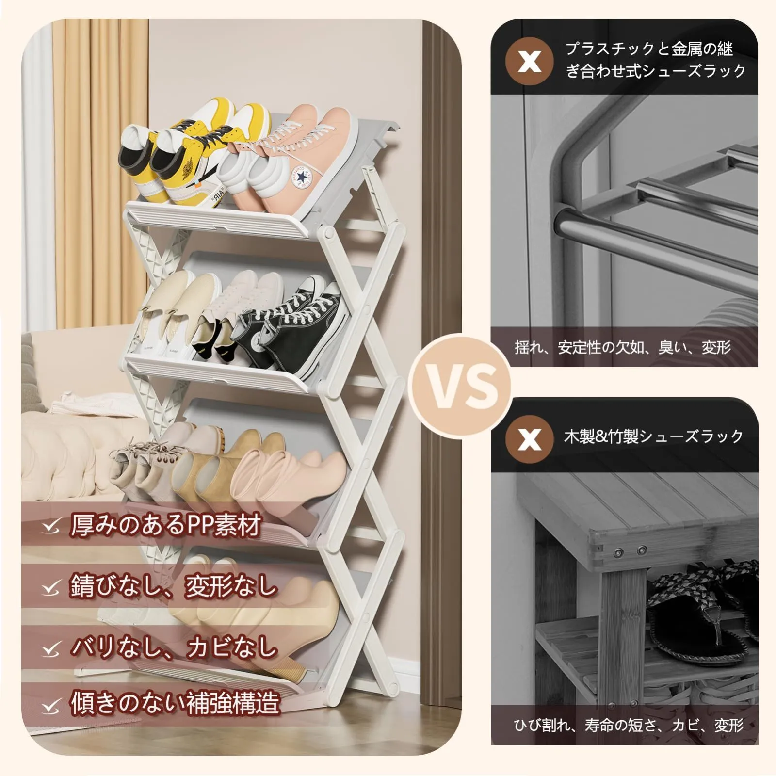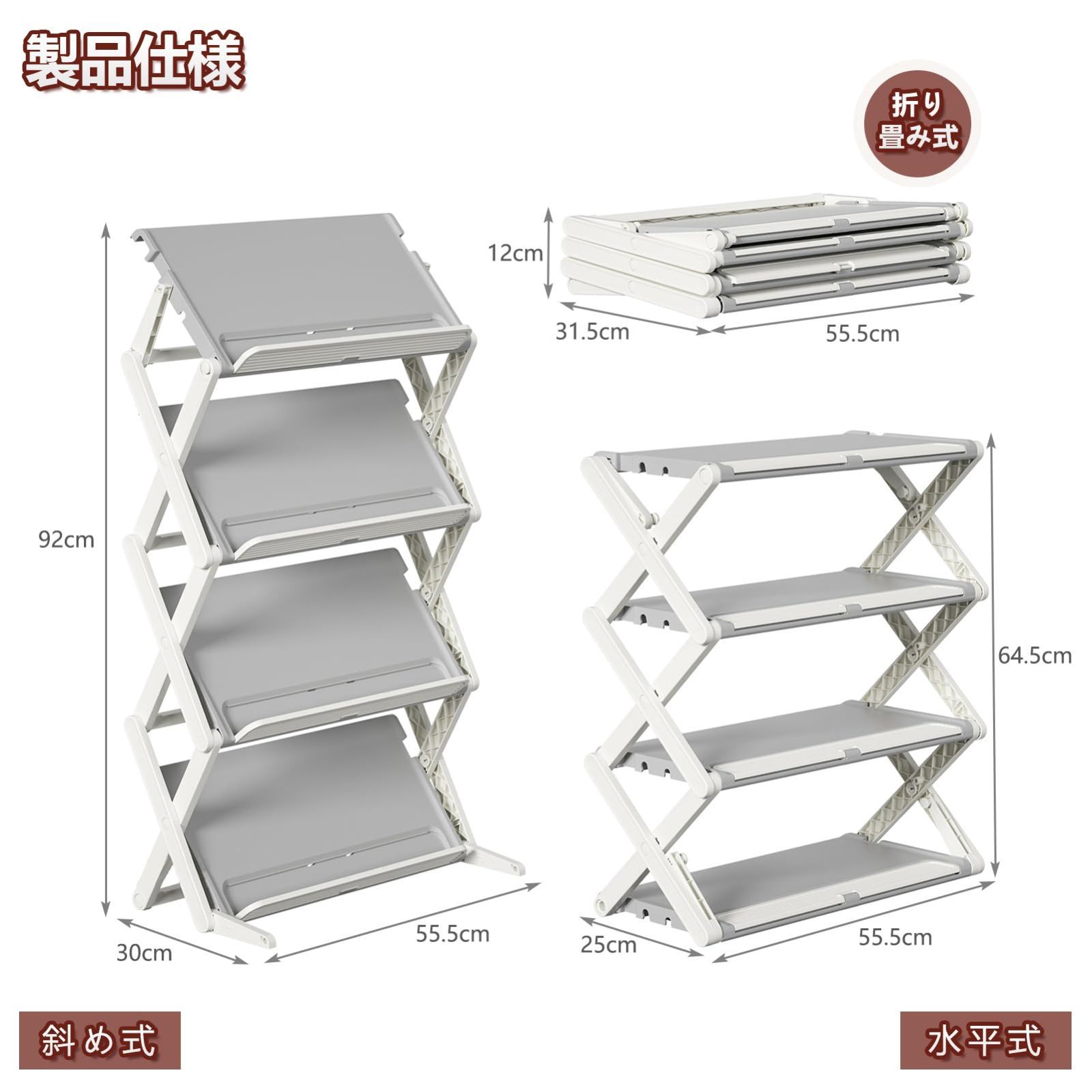 【製品仕様】・4段サイズ:折りたたみ:約W55.5×D31.5×H12cm / 水平式サイズ:約W55.5×D25×H64.5cm / 斜め式サイズ:約W55.5×D18×H92cm・材質:PP+HIPS+ABS・重量:約2.5kg。※注意:シューズラックが安定して使用できるように、軽いものから重いものの順番で靴を並べることをおすすめします。まずは軽い靴(例えば、スポーツシューズやスリッパなど)を上段に、次に重い靴(例えば、ブーツや革靴など)を下段に配置してください。この順番で靴を収納することで、ラックが安定し、傾きや不安定な状態を防ぐことができます。正しい配置を心掛けることで、シューズラックの耐久性が高まり、長くご利用いただけます。