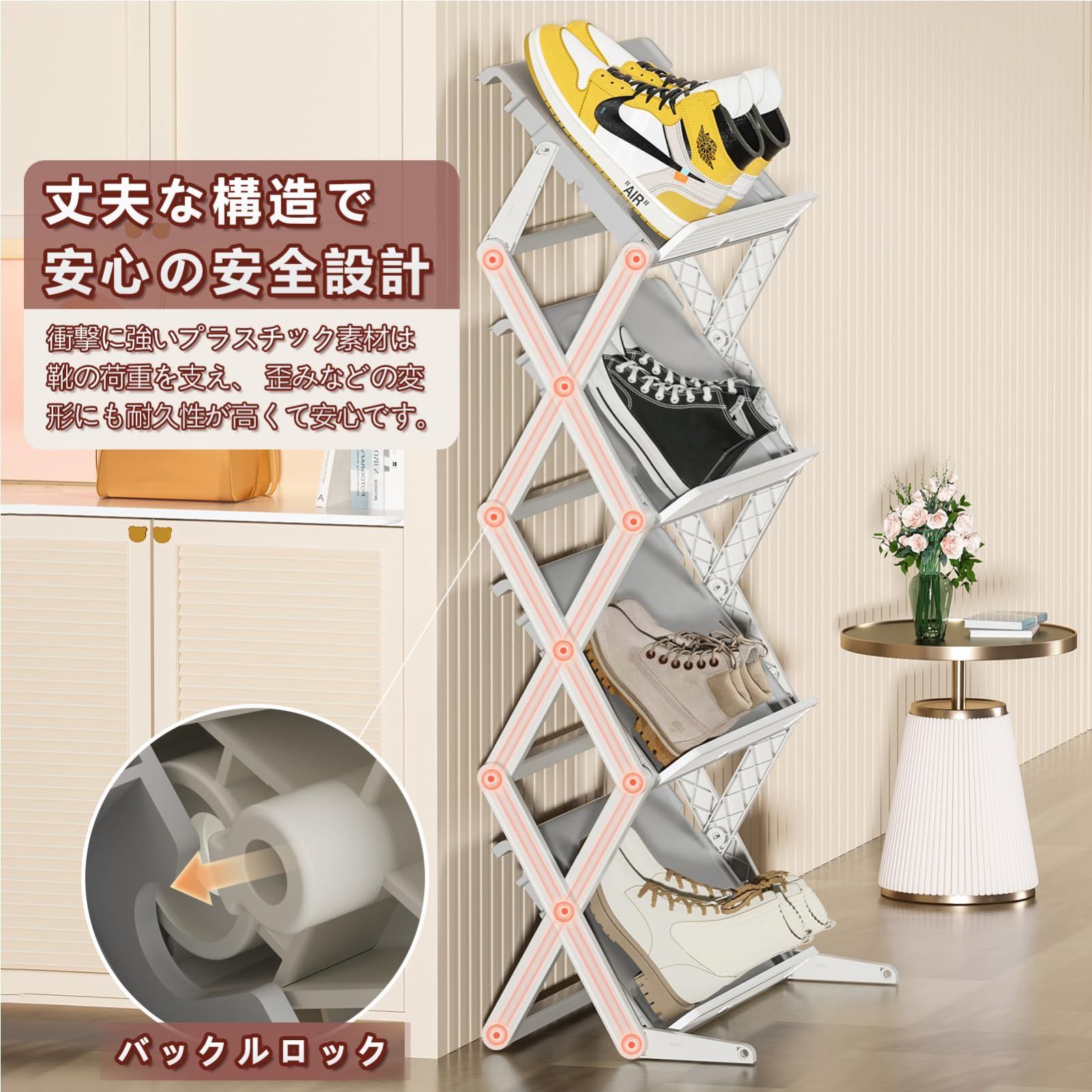 【3WAY多機能デザインで収納効率UP】このシューズラックは、水平・斜め・折りたたみの3モード切替可能!ブーツ/スニーカー/サンダルなど全12足をコンパクト収納。玄関はもちろん、クローゼットや寝室の隙間活用にも最適。収納しながらおしゃれな空間演出を実現。※女性用サイズ基準