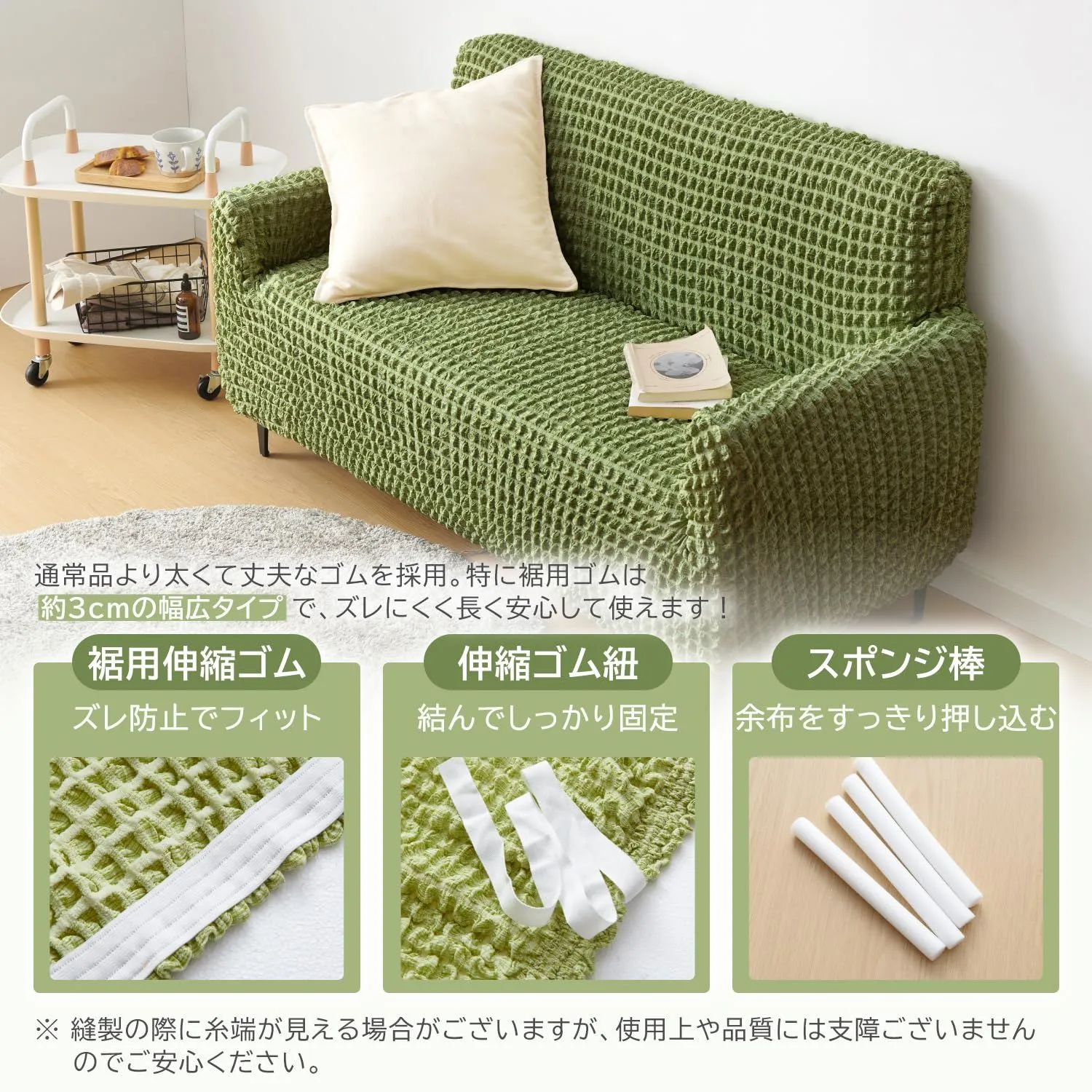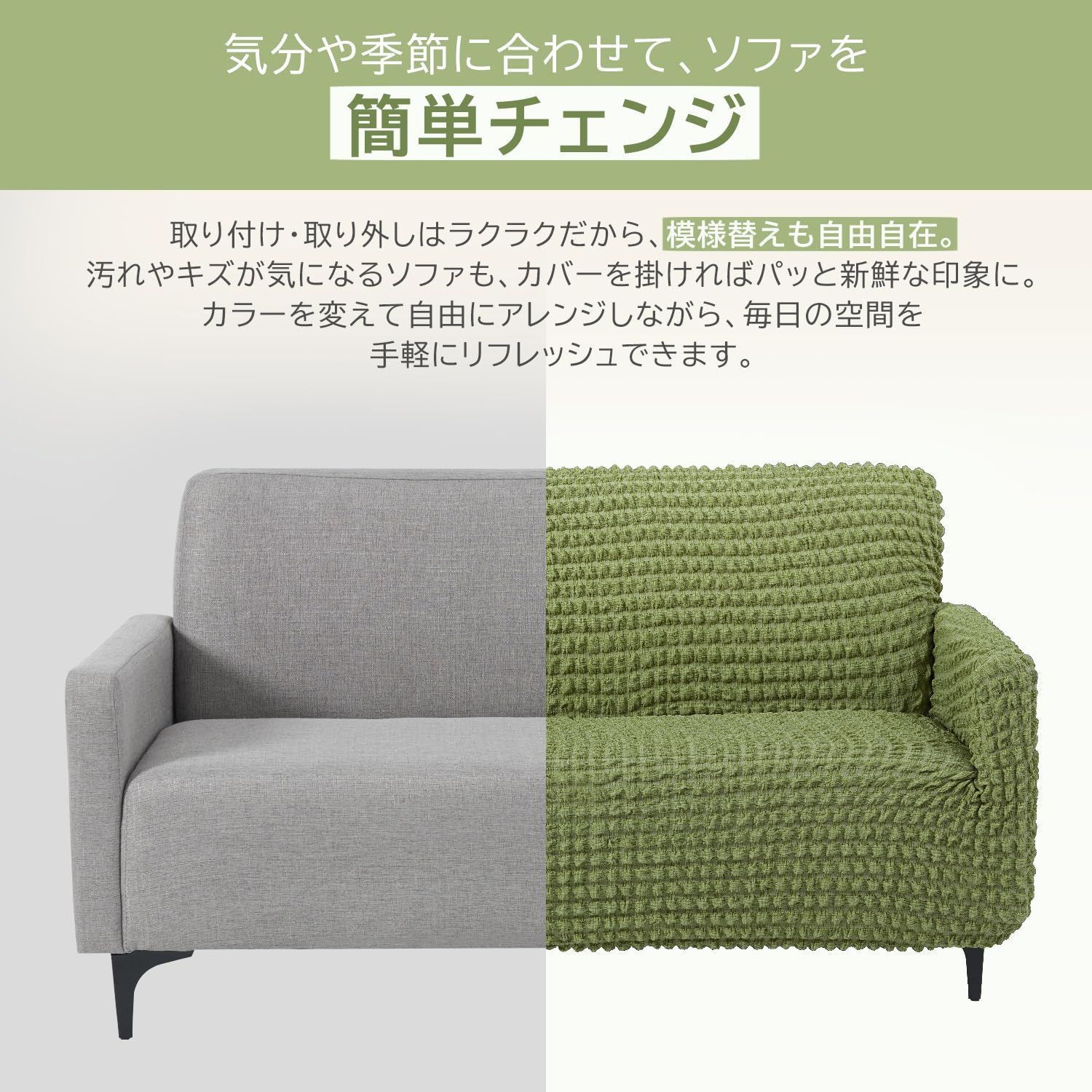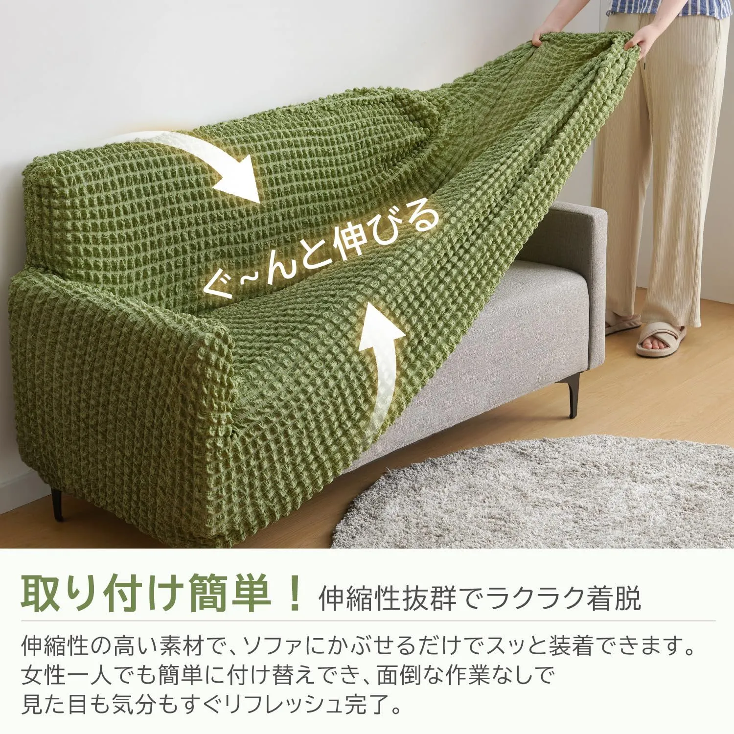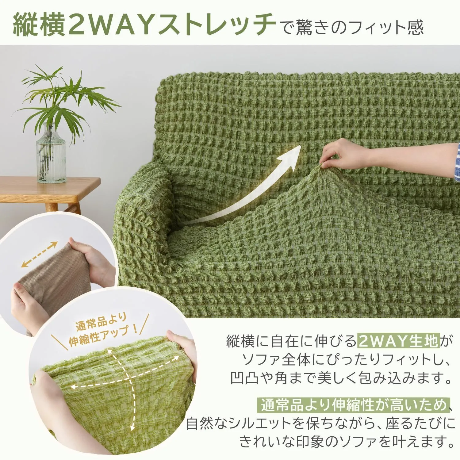 【通常品より伸縮性アップ・ラクラク装着】縦横に伸びる2WAY素材でソファにぴったりフィット。凹凸や角まで美しく包み込み、自然なシルエットを保ちます。カバーをかぶせるだけで簡単装着、女性一人でも付け替え可能。通常品より太くて丈夫な、幅3cmの幅広ゴムを採用し、ズレにくく、長く使えます。