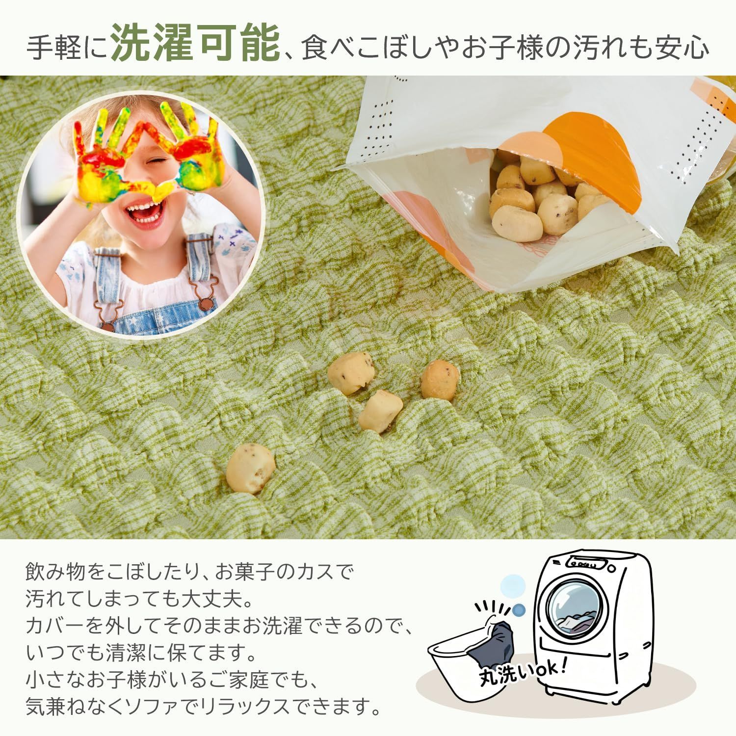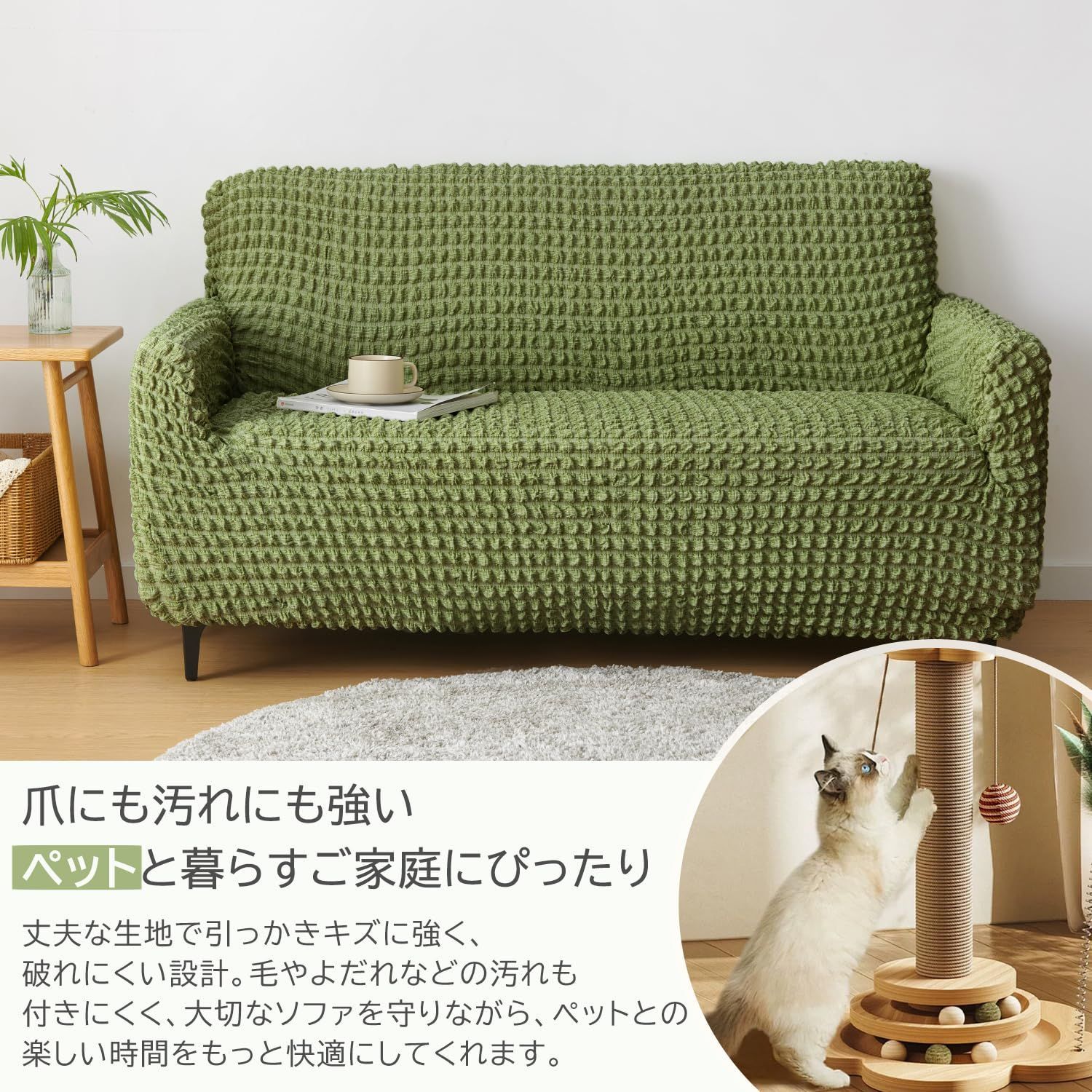 【ペット・汚れ・キズ対策】丈夫な素材で爪や引っかきキズに強く、毛やよだれなどの汚れも付きにくい設計。小さなお子様の食べこぼしや日常の汚れからソファをしっかり守ります。カバーは簡単に取り外して洗濯可能なので、いつでも清潔に保て、安心してリラックスできる快適な空間を実現します。