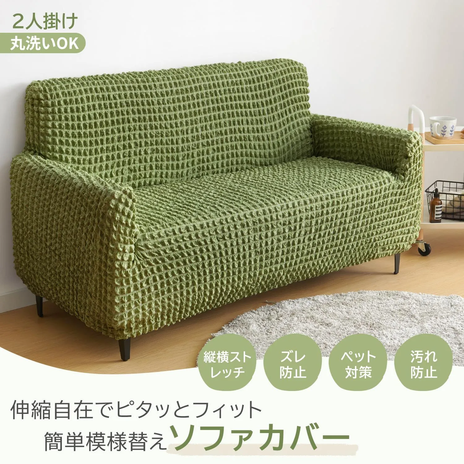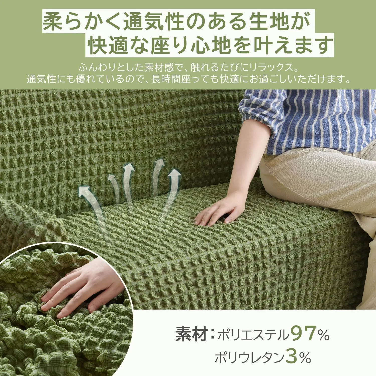 【商品仕様】適応ソファサイズ 2人掛け:120~160cm、3人掛け:170~200cm。 ※組成:ポリエステル97%、ポリウレタン3%。 ご購入前に必ずソファのサイズをご確認ください。横幅は肘掛けを含めて計測してください。サイズに迷う場合は、やや大きめをお選びいただくのがおすすめです。